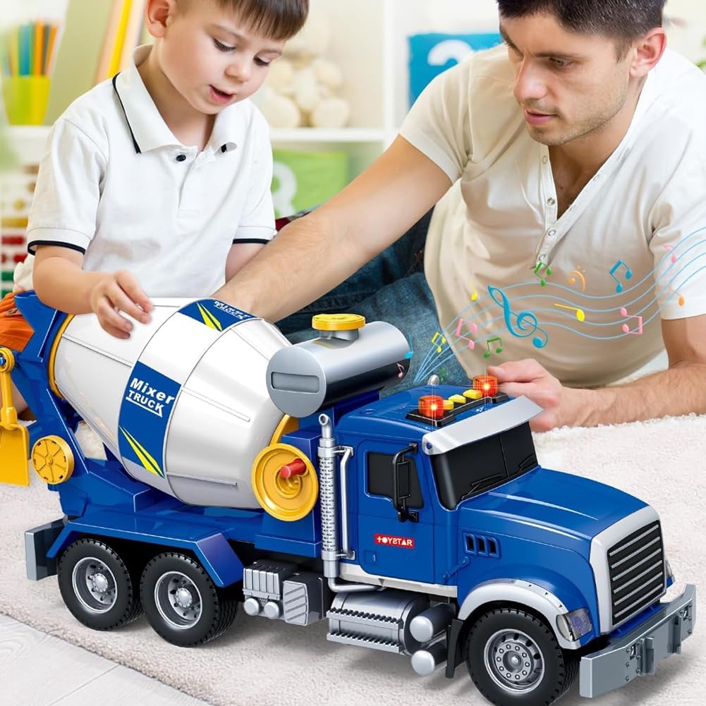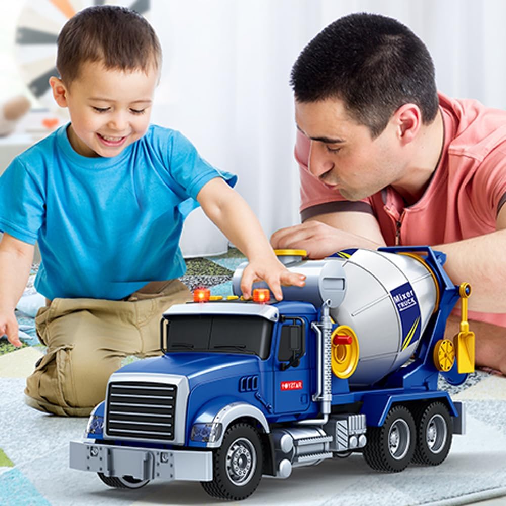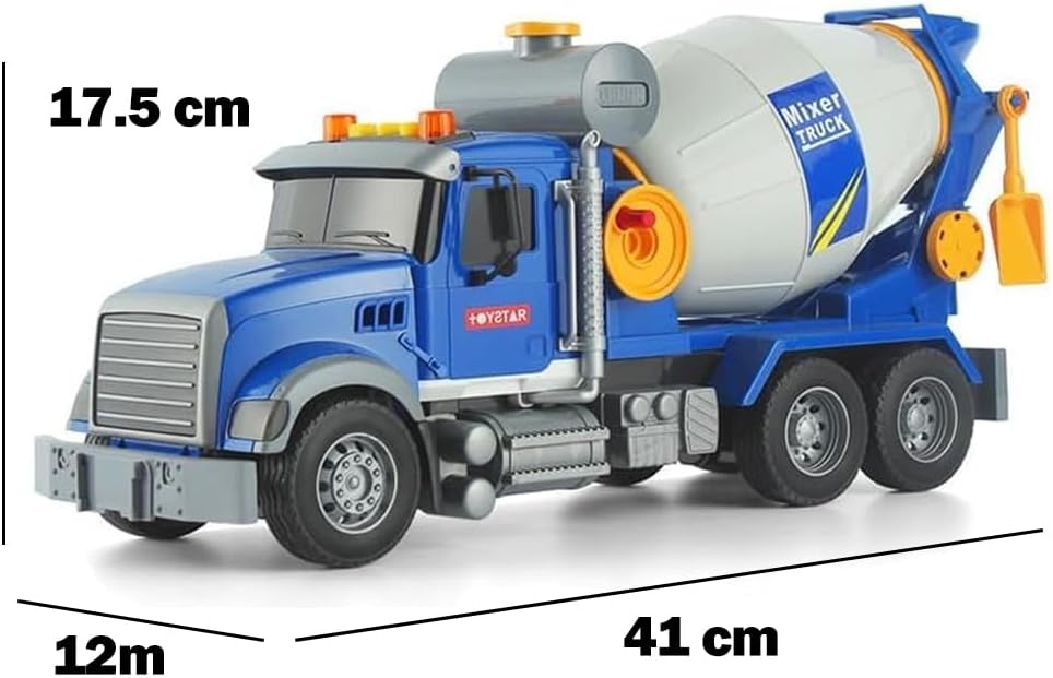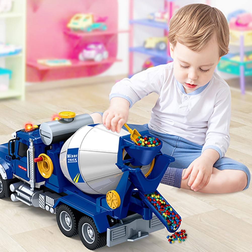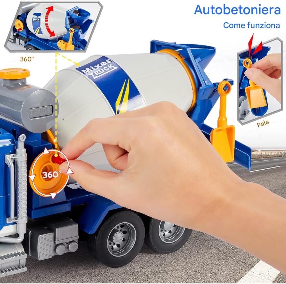 Camion giocattolo per bambini: camion miscelatore realistico con cui i bambini possono giocare ed imparare i suoni delle auto. È adatto anche per giocare all'aperto in spiaggia. Giocattolo per bambini con suoni: questo camion miscelatore ha una funzione di miscelazione realistica. La vasca del miscelatore ruota di 360° e il miscelatore può scaricare dall'uscita mentre mescola realisticamente. Questo camion permette ai bambini di fingere di essere un camionista. Ideale per i bambini: perfetto per trasportare giocattoli in casa e all'aperto, con pneumatici in gomma con cui i bambini possono giocare ovunque. Migliora la coordinazione occhio-mano di bambini e bambine, aumenta le capacità motorie fini, la creatività, il gioco di ruolo e l'immaginazione, una forma di gioco positiva che ispirerà la creatività e favorirà lo sviluppo dei bambini. Alta qualità e sicurezza: il design resistente e i materiali di alta qualità consentono ai bambini di giocare a lungo.