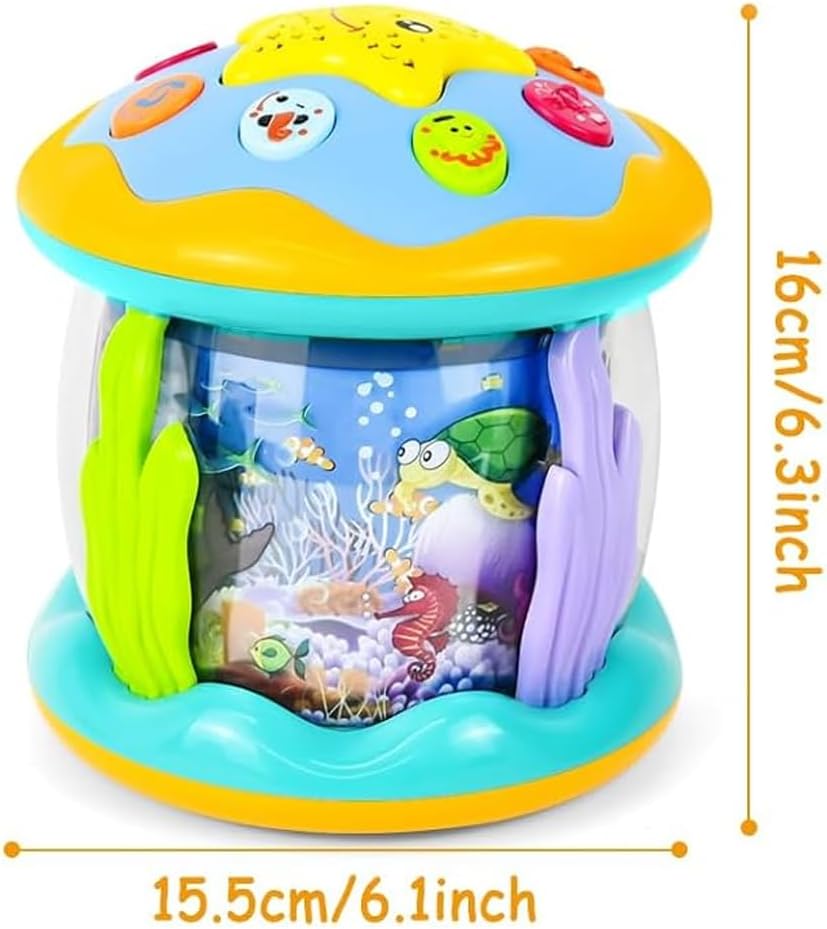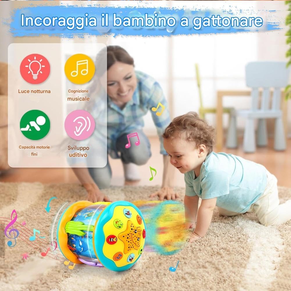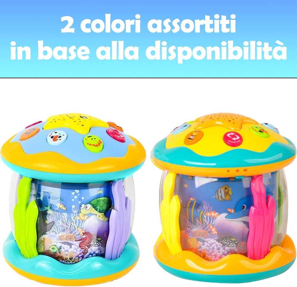 Proiezioni luminose rilassanti per la notte – Con il pulsante a forma di stella il bambino può attivare due modalità di luce: fissa o con 7 colori che cambiano automaticamente. Le immagini marine vengono proiettate chiaramente sul soffitto creando un’atmosfera calda e rassicurante per la nanna. Un magico mondo oceanico da esplorare – Grazie a delfini, polpi e pesci pagliaccio che ruotano a 360° con luce blu e suoni marini realistici, il bambino vivrà un’esperienza multisensoriale. Stimola curiosità, immaginazione e senso di meraviglia come se fosse immerso in un acquario fiabesco. Musica e suoni per lo sviluppo sensoriale – Dotato di 6 melodie marine e 6 versi di animali, aiuta a sviluppare udito e attenzione. Con 2 livelli di volume regolabile, il giocattolo è perfetto per accompagnare momenti di gioco o rilassamento, favorendo lo sviluppo sensoriale nei primi anni di vita. Incoraggia il movimento e la coordinazione – Grazie alle tre ruote inferiori, il giocattolo può rotolare e scivolare attirando il bambino a gattonare e inseguirlo. Stimola la motricità, la coordinazione occhio-mano e il desiderio di esplorare, trasformando il gioco in un’attività educativa e divertente.