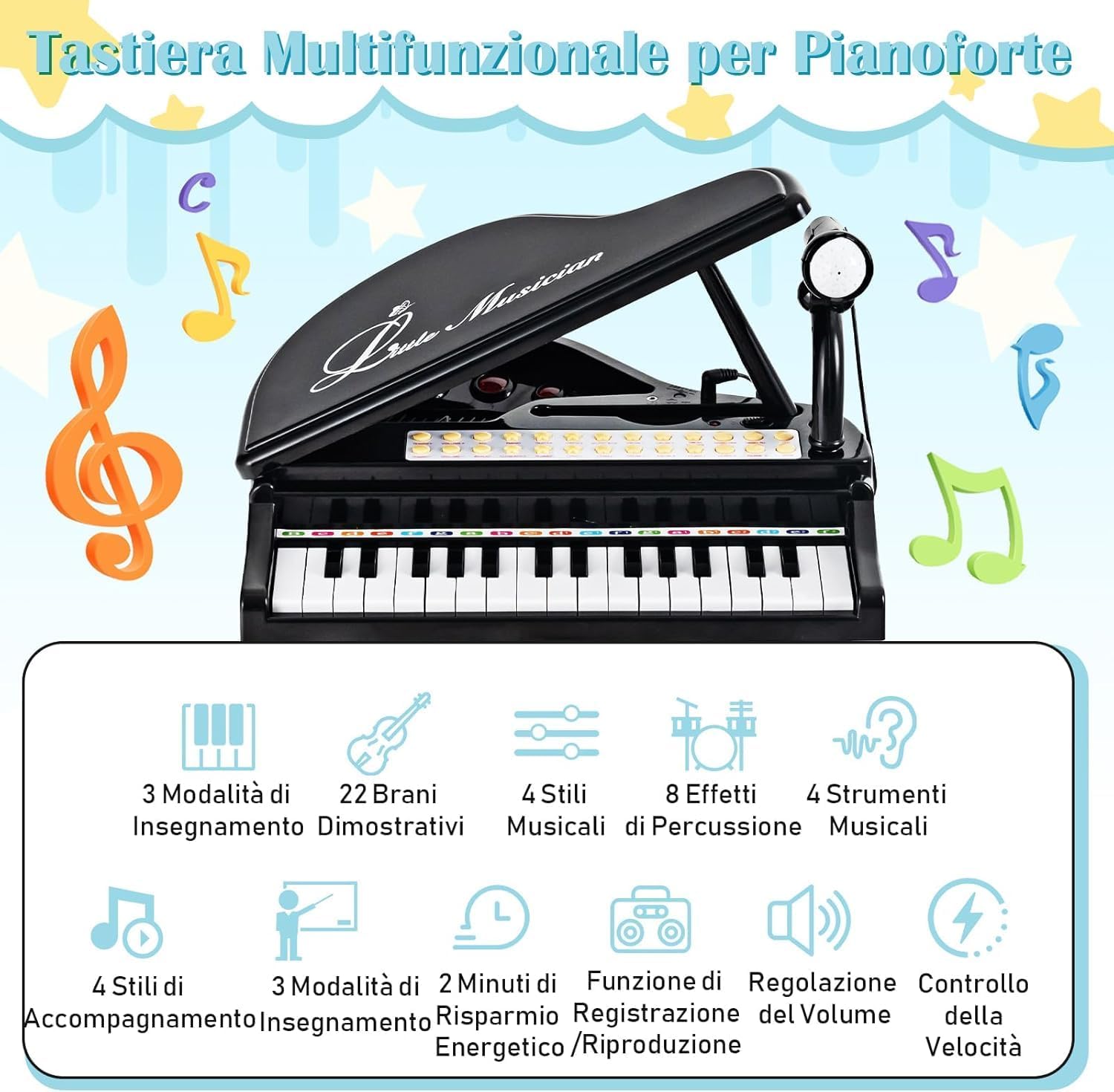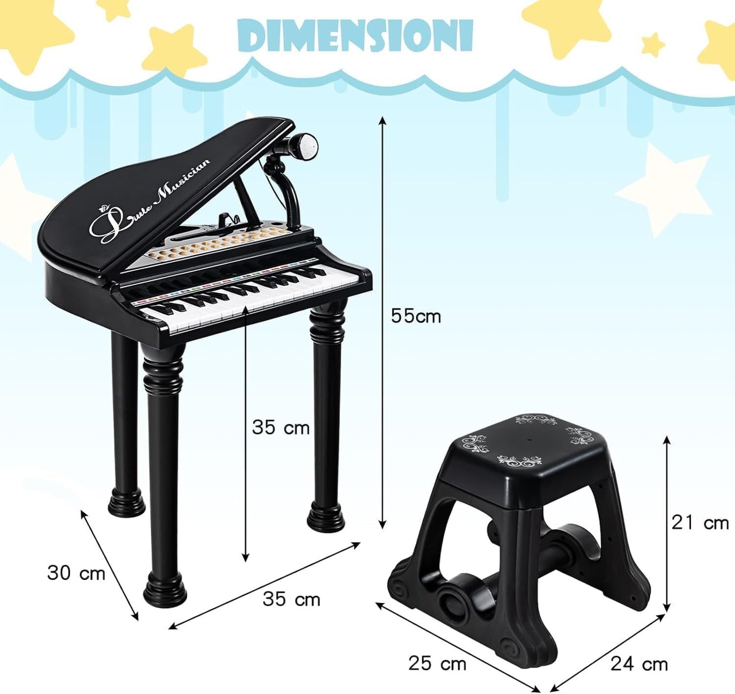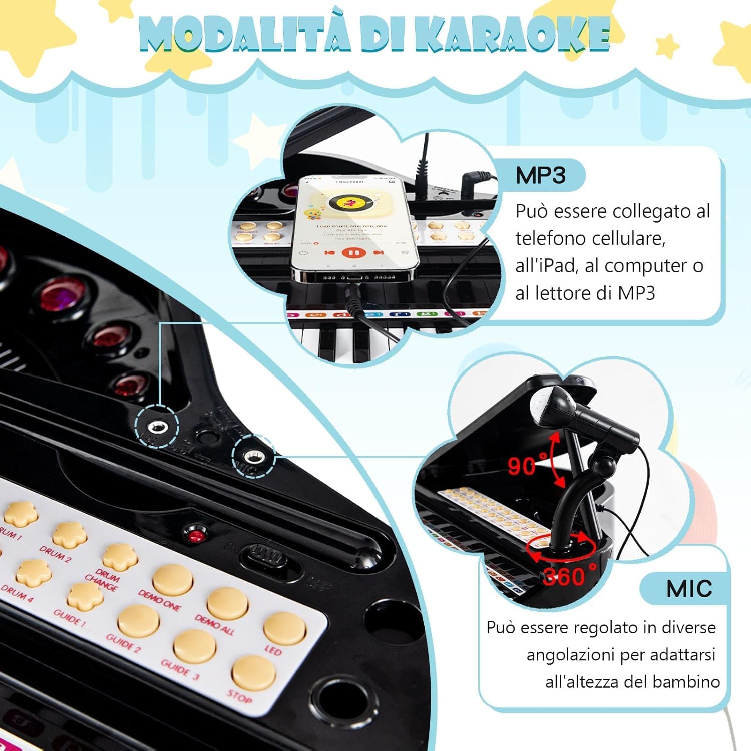 Questo pianoforte multifunzionale da 31 tasti trasforma ogni bambino in un piccolo artista. Include 22 canzoni demo, 8 percussioni, 4 strumenti musicali e 4 stili diversi per imparare divertendosi. Il microfono rotante e le luci LED colorate creano un’atmosfera da palco! Grazie alle 3 modalità di apprendimento e ai tasti che si illuminano, il bambino può seguire le luci per suonare le canzoni demo. È un modo ludico ed efficace per sviluppare orecchio musicale, coordinazione e memoria visiva sin dalla tenera età. Regola volume e ritmo, registra e riproduci le melodie create, oppure collega la tastiera tramite cavo a un MP3 o a un altro dispositivo: il divertimento è infinito e personalizzabile! Un perfetto strumento per stimolare la creatività musicale in modo pratico. Costruito in materiali ecologici ABS e PE, è pensato per garantire sicurezza e durata. Il design a forma di triangolo assicura massima stabilità durante l’uso. Il microfono si ruota e si inclina per adattarsi all’altezza del bambino. Pronto a seguirlo nella crescita!