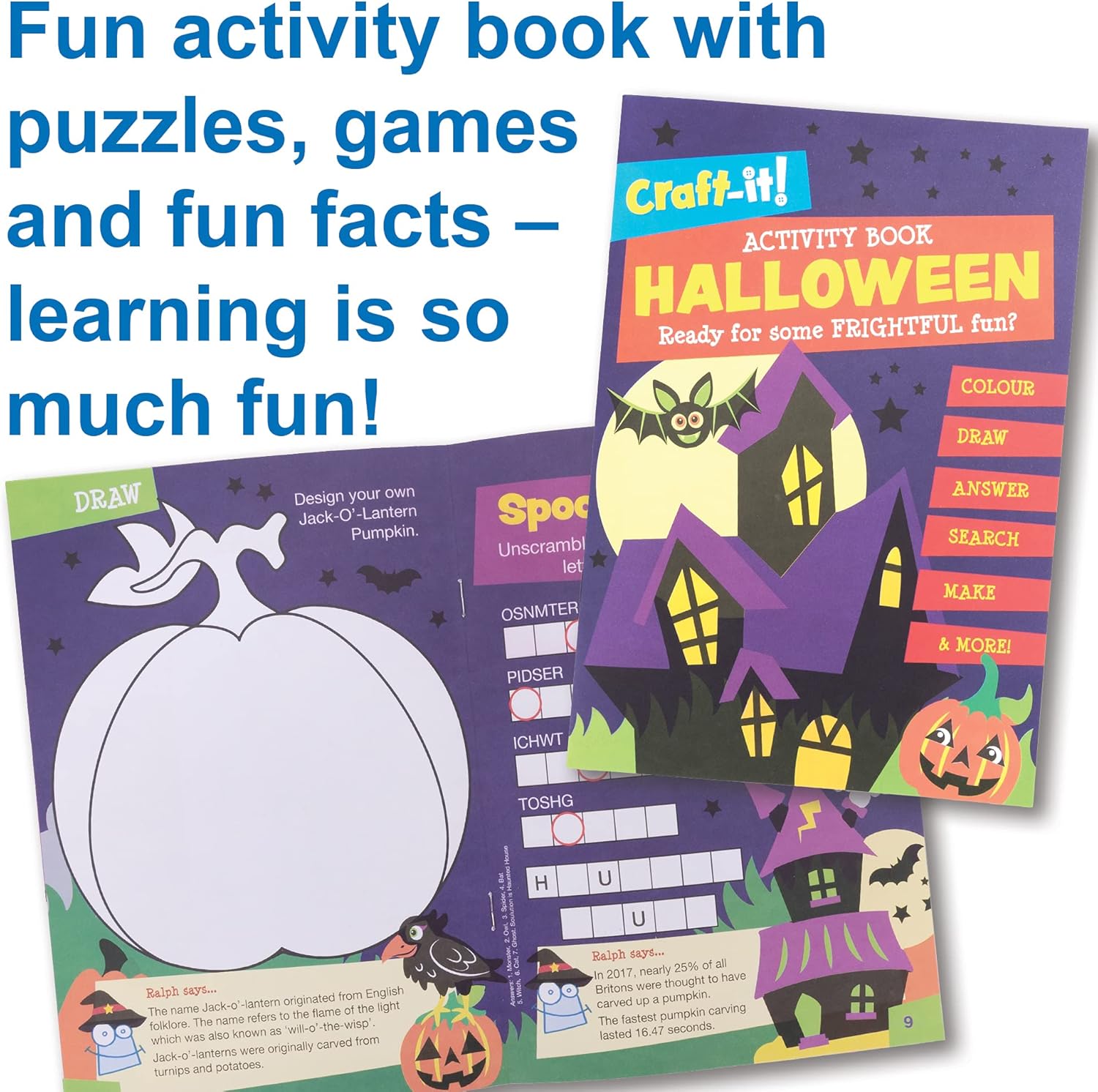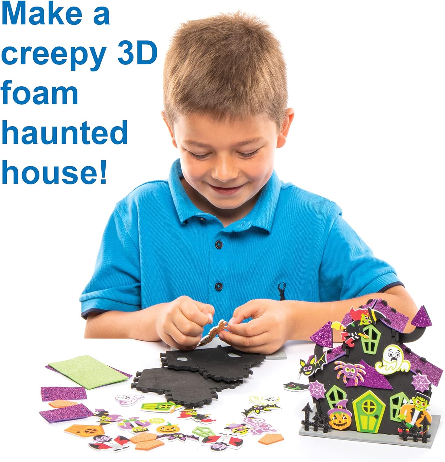 Pacchetto di arti e mestieri: ogni artigianato! BOX è confezionato con kit artigianali unici e attività divertenti, e porta progetti fantasiosi e di alta qualità ai bambini dai 3 ai 9 anni. Guarda il tuo bambino imparare nuove abilità mentre creano le decorazioni e i giocattoli più sorprendenti con ogni tema. Un Craft-it! BOX è pieno di divertimento, attività educative che sono garantite per intrattenere i bambini per ore! Divertimento ed educativo: progettato esclusivamente dal team di Baker Ross, questo furbo pacchetto educativo è pieno di artigianato a tema creativo e ispiratore progettato per espandere la loro immaginazione e aiutare a sviluppare abilità chiave. Il libro di attività e artigianato a tema di Halloween aiuta i bambini a usare la loro immaginazione e divertirsi a celebrare questa vacanza spettrale. Qualità e valore: Nel corso degli anni Baker Ross ha costruito una reputazione nell'offrire qualità e rapporto qualità-prezzo. Ogni confezione a tema contiene molteplici attività artigianali facili da seguire che possono essere condivise con altri fratelli e amici e offre a genitori e nonni l"opportunità di creare uno a uno con un bambino. Ci sono 2 progetti artigianali a tema Halloween, adesivi e un libro di attività. Contenuto della confezione: Kit ghirlanda di Halloween: mescola e abbina i pezzi di schiuma per creare 2 diverse ghirlande (ogni kit contiene pezzi di schiuma, decorazioni autoadesive in schiuma e istruzioni). Haunted House - Ideale per il tuo display di Halloween. Crea una casa infestata in schiuma 3D raccapricciante (ogni kit contiene pezzi di schiuma, decorazioni autoadesive in schiuma e istruzioni). Foglio adesivo a tema Halloween, e un libro di attività di 16 pagine (contiene quiz educativi, colore nelle attività, puzzle, idee artigianali e una ricetta di biscotti di zanne di vampiri). Infine, la scatola è anche un'attività creativa in quanto può essere colorata e decorata troppo! Prodotto da esperti: Baker Ross ha progettato e fornito le migliori forniture artistiche e artigianali, e giocattoli a scuole, gruppi, e genitori per oltre 40 anni. Tutti i prodotti sono conformi alle normative generali sulla sicurezza dei prodotti, e le raccomandazioni sull"età sono indicate ove applicabili.