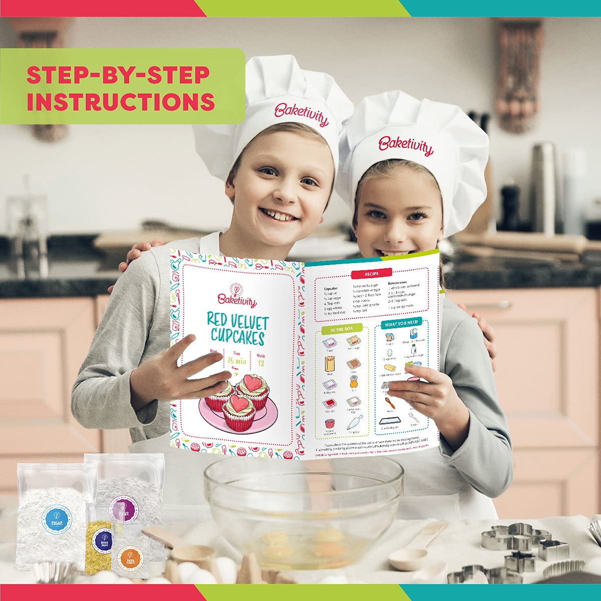 UNA SCATOLA PIENA DI SORPRESE - Il set di attività di cottura per bambini Baketivity contiene tutti gli ingredienti secchi necessari per preparare deliziosi biscotti Red Velvet. Questi sono certificati kosher e confezionati sottovuoto per preservarne la freschezza. BISCOTTI FACILI DA REALIZZARE - Con gli ingredienti premisurati, la lista della spesa completa e le istruzioni passo passo incluse in questo set da cucina, i bambini dai 6 anni in su si divertiranno sicuramente a preparare i loro biscotti fai-da-te. Viene fornito con extra: oltre al set di mix di biscotti, nella confezione troverai anche libri di attività aggiuntivi. Usa i nostri vantaggi legati ai cookie per creare legami e creare ricordi con i tuoi figli mentre aspetti che i biscotti cuociano. DIVERTENTE ED EDUCATIVO - Questo set di biscotti offre ai tuoi bambini un'attività divertente mentre apprendono le abilità di base della vita. Permette loro di acquisire sicurezza, stimolare la creatività e imparare a seguire le istruzioni. UN REGALO PER LO CHEF - Che si tratti di una festa di compleanno o di qualsiasi occasione, il set da forno per bambini Baketivity è il regalo ideale per i tuoi chef junior. Sicuramente metterà un grande sorriso sui loro volti!