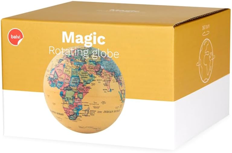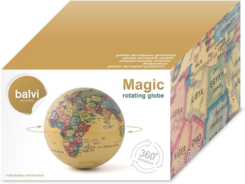 ORIGINALE. Il punto d'appoggio è nascosto, da la sensazione che ruoti magicamente. DESIGN. Nessun cavo o interruttori alla vista. PRATICO. Non avendo cavi e non dovendo essere collegato ad una presa puó essere spostato senza problemi. FUNZIONA A PILE. Pile non incluse (1xAA) Dimensioni: 14x14x14 cm Materiale: polistirolo