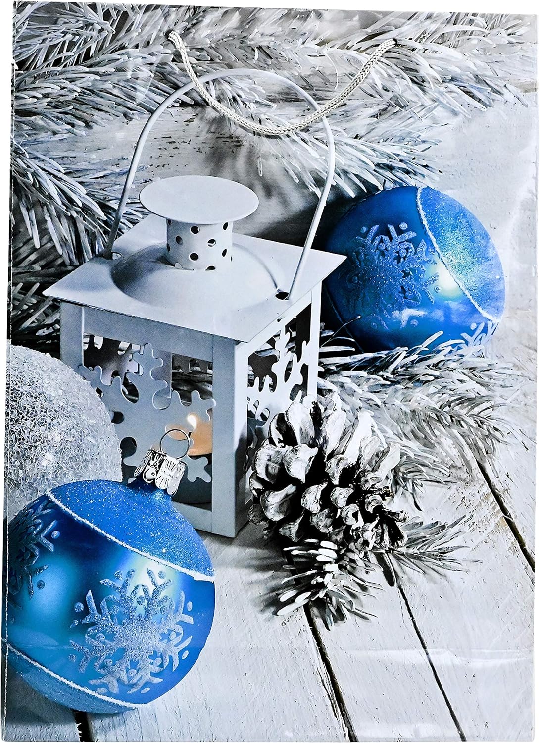 Bambelaa! Confezione da 12 sacchetti natalizi di alta qualità da riempire con motivo natalizio, bianco, lanterna blu, sacchetti di carta, sacchetti regalo, sacchetti di carta, sacchetti natalizi, sacchetti natalizi, carta lucida, 157 g (ca. 25x8,5x34 cm). Design: borsa con lanterna bianca, palline dell'albero di Natale, rami di pino e pigne decorate in blu. Spessore della carta della borsa per il trasporto: la carta utilizzata nel sacchetto è spessa 157 g, quindi molto stabile e ha una superficie lucida. Particolarità: i sacchetti regalo o i sacchetti natalizi sono dotati di due cordoncini per il trasporto e avere un piccolo biglietto per un nome o un augurio di Natale. Puoi etichettare i sacchetti in modo che ognuno possa assegnare il proprio regalo per Natale. Dimensioni: Il sacchetto regalo Borsa natalizia grande ca. 34,5 cm di altezza, ca. 25 cm di lunghezza e ca. Larghezza 8,5 cm