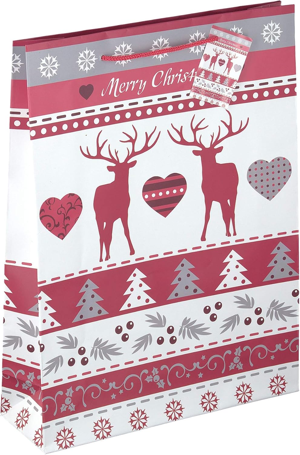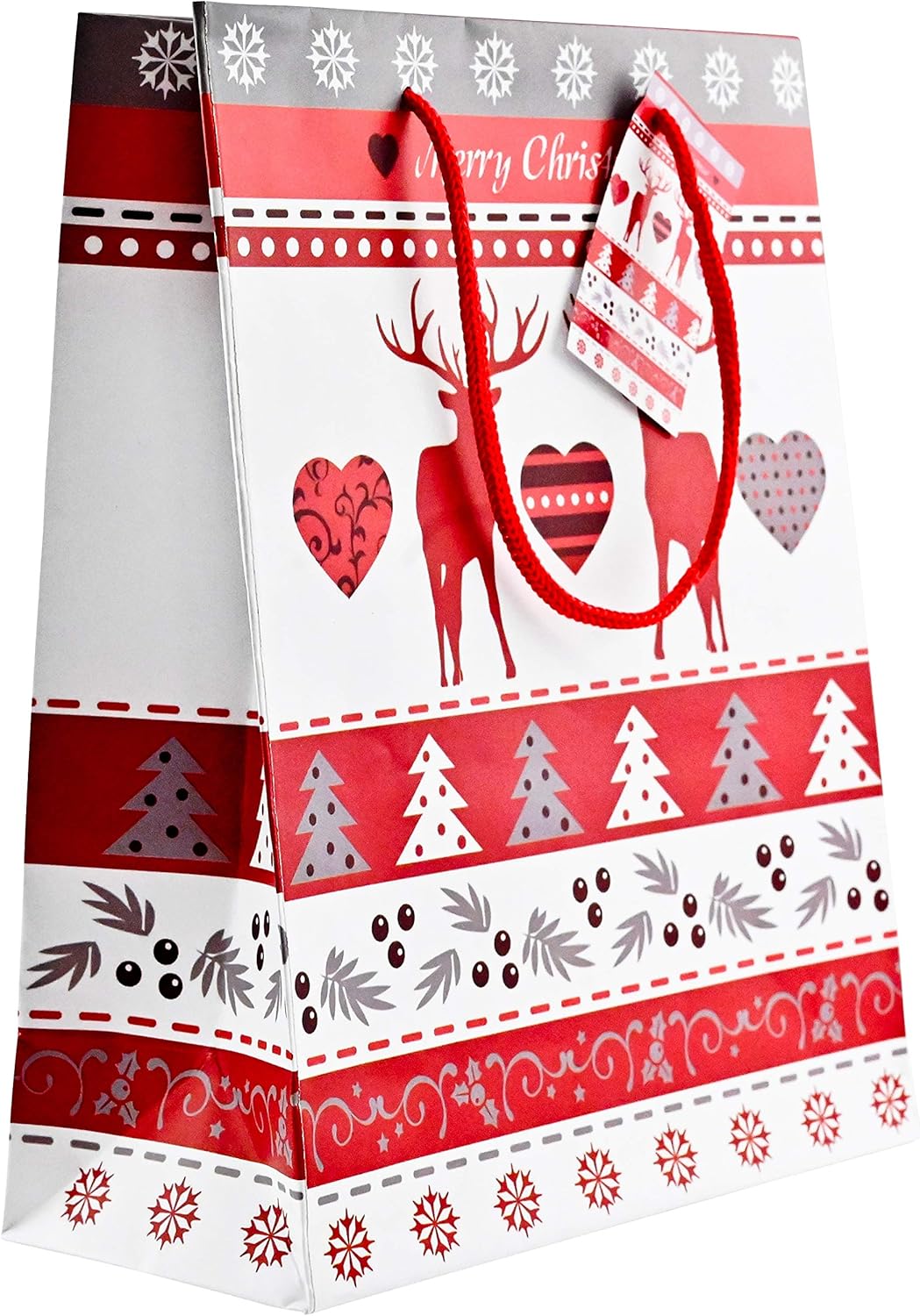 Bambelaa! Confezione da 12 sacchetti di carta di alta qualità con motivo natalizio cervo rosso bianco sacchetti regalo sacchetti regalo sacchetto di carta sacchetto natalizio carta natalizia da 128 g, opaca (ca. 18x8x23 cm) design: sacchetto rosso bianco con cervo rosso, alberi di Natale, rami e cuori spessore della carta: la carta utilizzata è spessa 128 g, quindi molto stabile e ha una superficie opaca particolarità: il sacchetto regalo o sacchetto natalizio è dotato di due cordoncini per il trasporto e ha un piccolo biglietto per il nome o un augurio di Natale dimensioni: il regalo borsa o borsa natalizia è di ca. 23 cm di altezza, ha una lunghezza di ca. 18 cm e una profondità di ca. 8 cm
