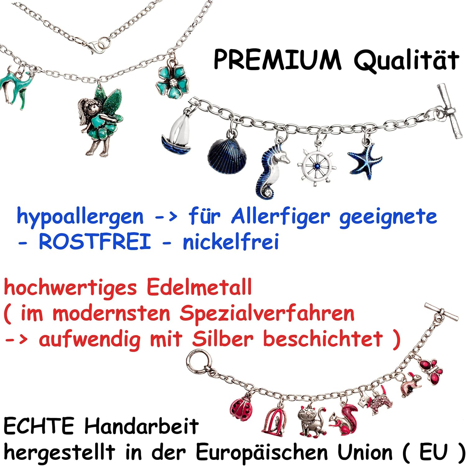| Material | ECHTE Handarbeit ___ hergestellt in der Europäischen Union ( EU ): ______ PREMIUM Qualität: __ hypoallergen -> für Allergiker geeignet - ROSTFREI - nickelfrei ___ hochwertiges Edelmetall ( im modernsten Spezialverfahren -> aufwendig mit Silber beschichtet ) ____ wunderschön, hochwertig & sehr stabil ___ längenverstellbar ____ passend für Kinder & Erwachsene ! |