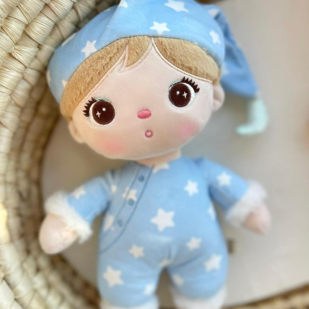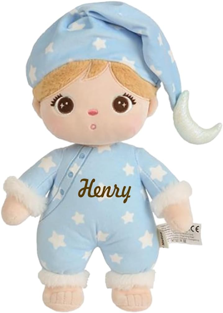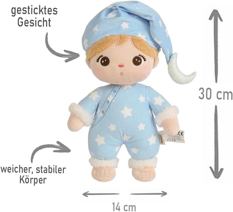 MORBIDA BAMBOLA DA DORMIRE con un comodo abito a scialle come compagna di sogni d'oro. Sorprendi tuo figlio con questa bambola dal design amorevole, che sarà personalizzata con il suo nome STAMPATA SECONDO LE TUE ESIGENZE - Inserisci i tuoi dati e seleziona il carattere e il colore del carattere. Sono possibili anche testi brevi come: Ti amo, battesimo, angelo custode,…. E rendi unica la bambola di peluche DESIGN CARINO disponibile in due colori: azzurro con pigiama a stella o rosa con pigiama a nuvola, ciascuno con un berretto per dormire abbinato MATERIALE: morbido peluche di qualità realizzato in poliestere con accogliente bordo in pelliccia sulle maniche e sulle gambe per il massimo comfort. Lavabile con ciclo delicato DIMENSIONI BAMBOLA misurata dalla testa ai piedi: ca. 30 cm di lunghezza, ca. 14 cm di larghezza e ca. 10 cm di altezza