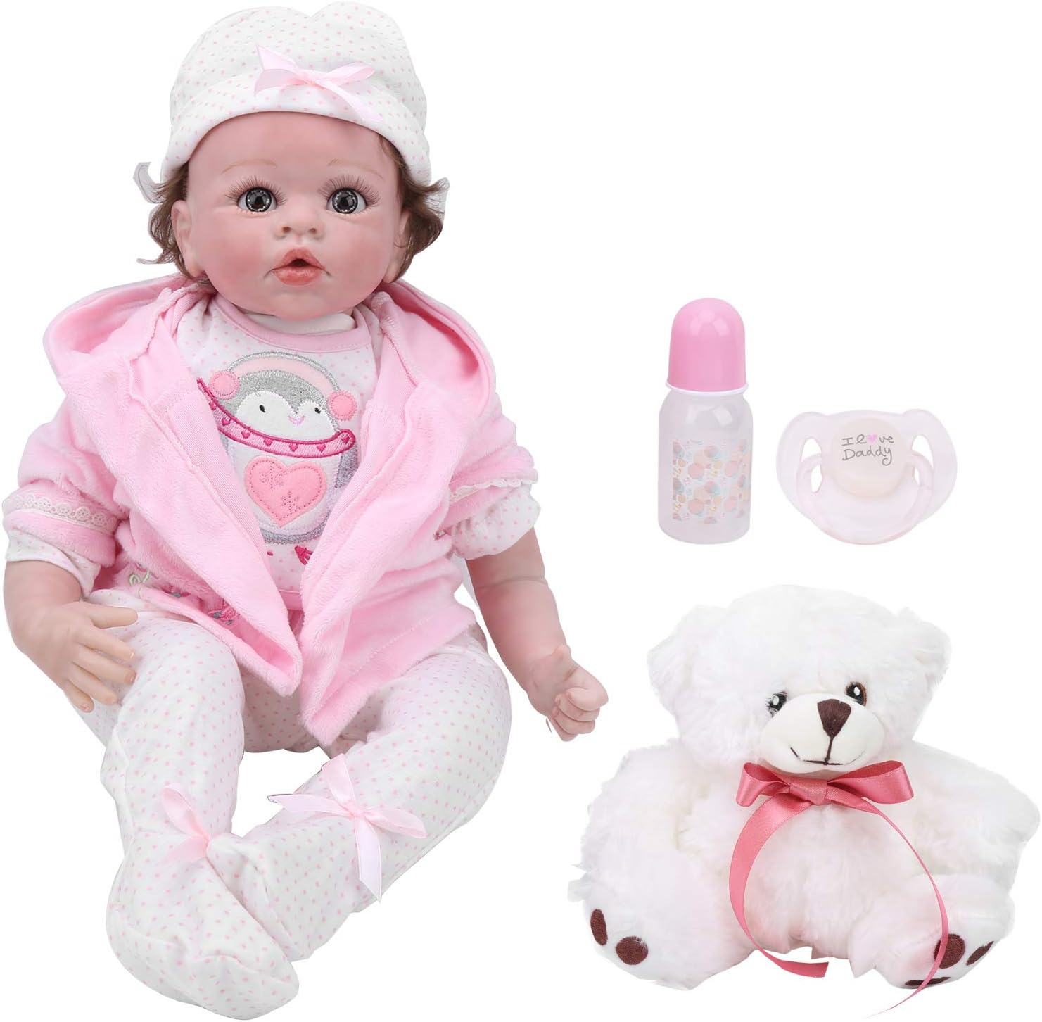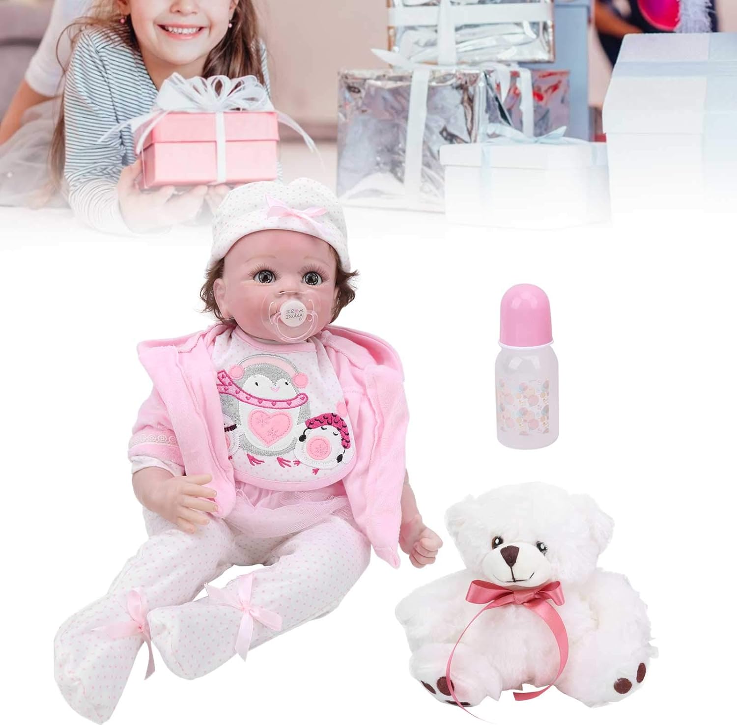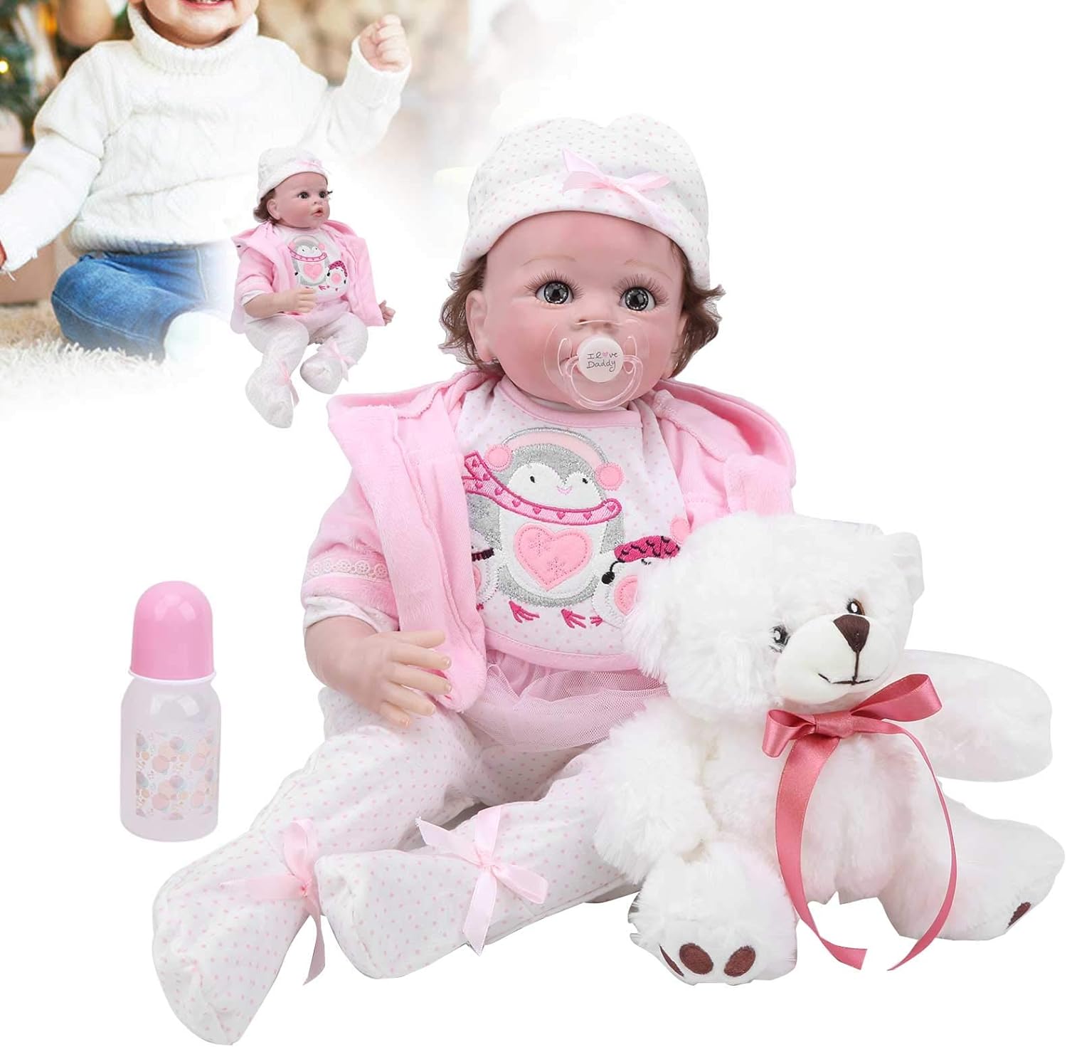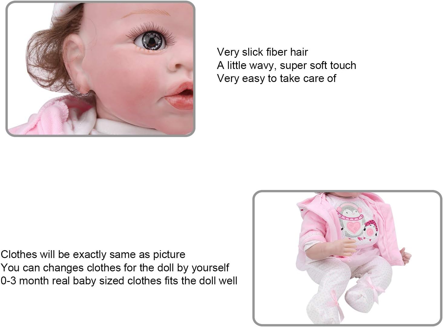 Testa in silicone con braccia piene e gambe a 3/4, molto morbida e realistica, flessibile, la bambola non può fare il bagno. La bambola è completamente mobile, la testa e gli arti possono essere spostati liberamente, rendendo i bambini divertenti. Capelli in fibra molto liscia, leggermente ondulati, super morbidi al tatto, molto facili da pulire. I vestiti sono esattamente come nell'immagine. Puoi cambiare i vestiti per la bambola stessa. I veri vestiti di taglia da 0 a 3 mesi si adattano bene alla bambola. Grazie al suo bell'aspetto, può essere utilizzato come accessorio fotografico, decorazione per la casa o giocattolo per bambini.