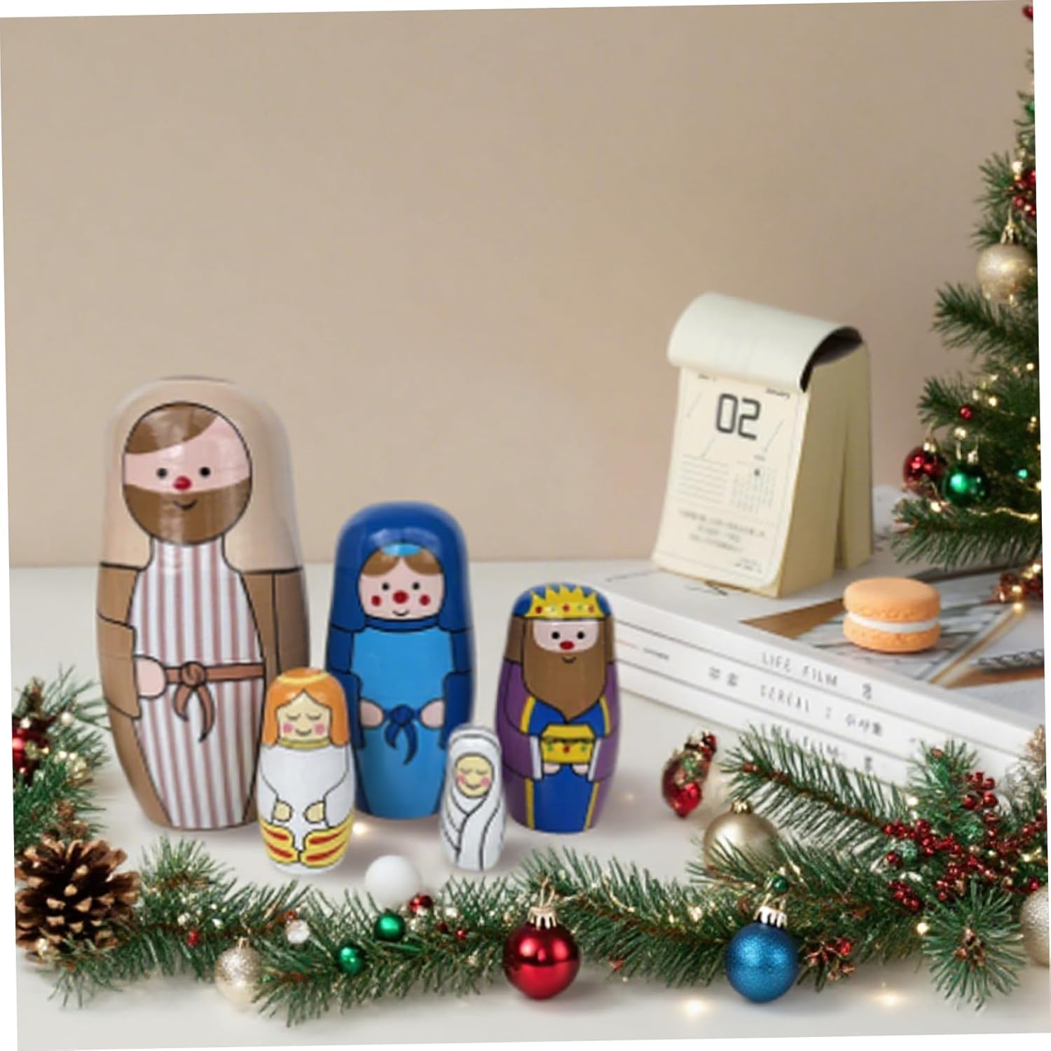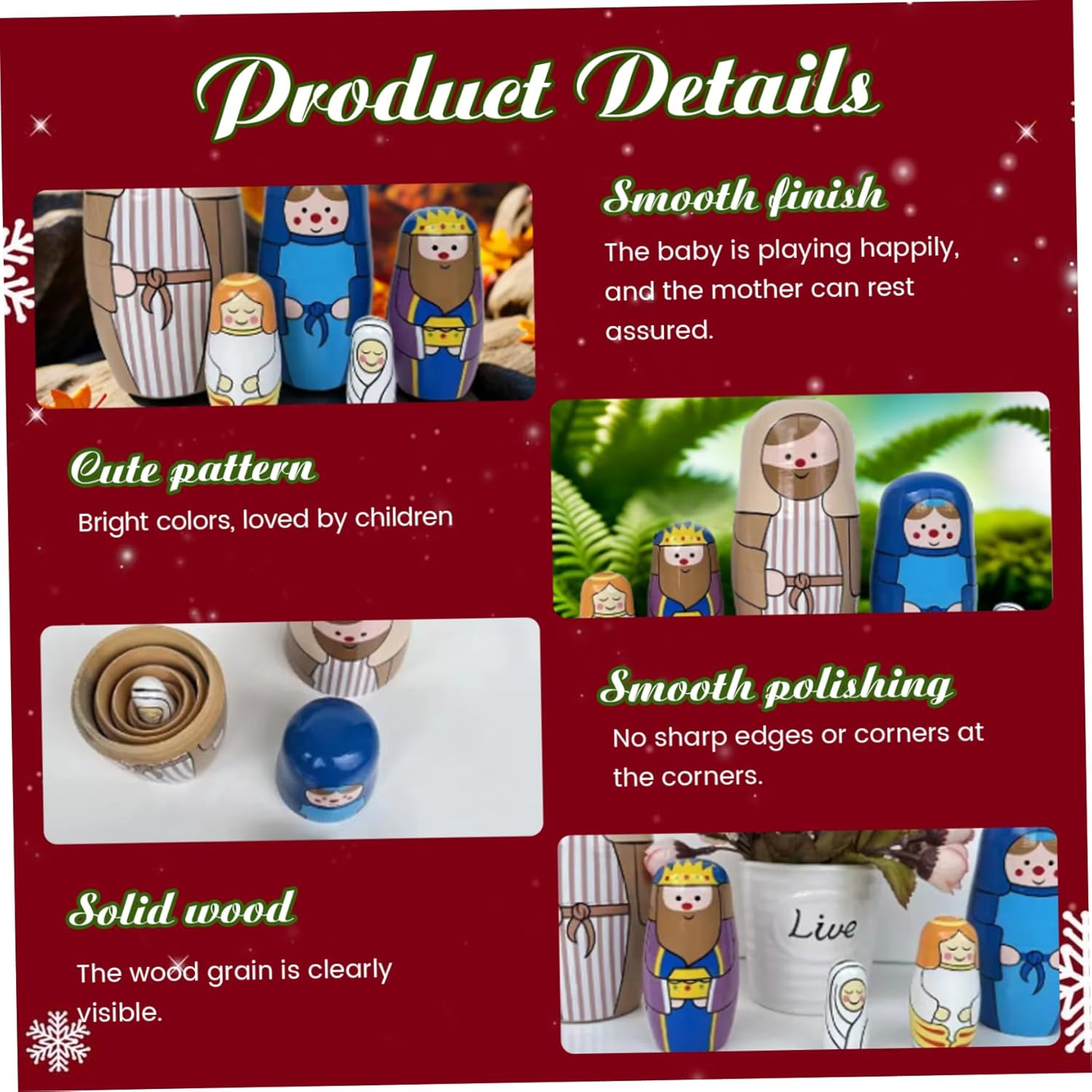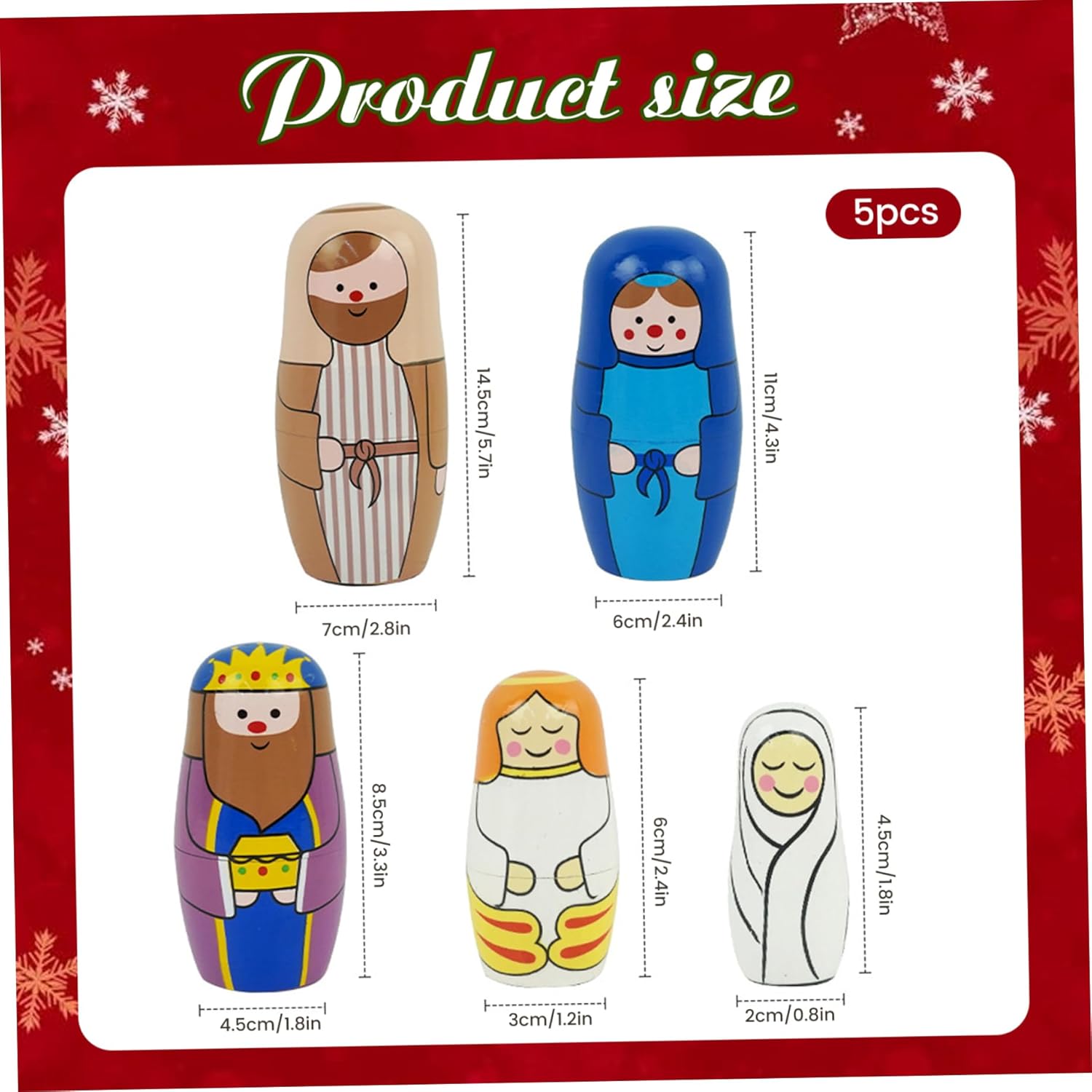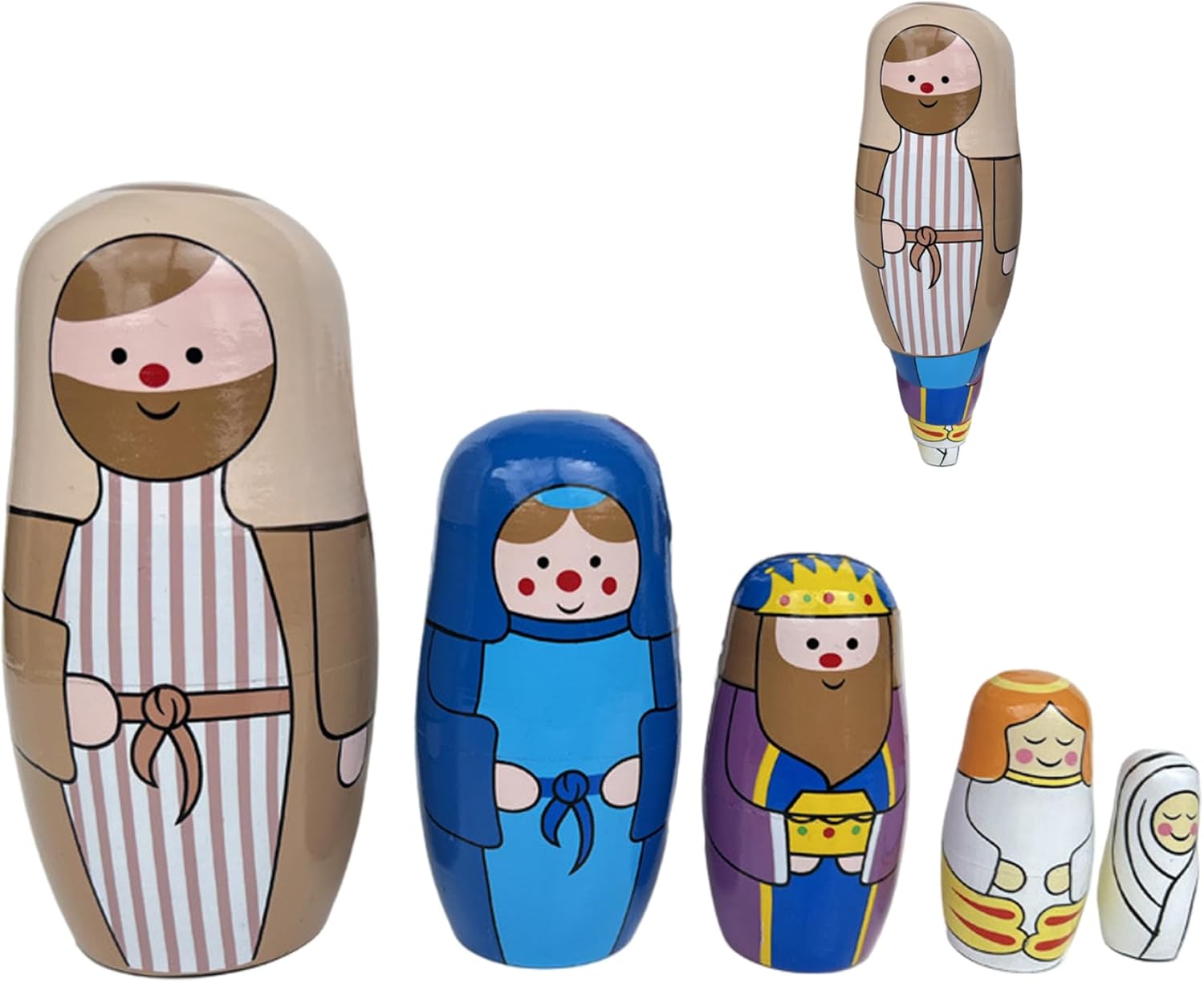 Artigianato in legno di alta qualità: realizzate in legno stabile, queste bambole matrioska in stile russo offrono un fascino duraturo e una finitura liscia sicura per i bambini..La struttura robusta garantisce anni di divertimento e visualizzazione in famiglia. Set compatto e da collezione: questo set di bambole da nidificazione da 5 pezzi è compatto per riporlo e trasportarlo facilmente, incoraggiando la raccolta e l'esposizione..La sua miscela unica di design tradizionale della bambola russa con il simbolismo della Natività cristiana la rende un ricordo prezioso. Autentica arte del presepe: dipinte a mano con dettagli squisiti, queste bambole da nidificazione in legno raffigurano magnificamente il presepe di Gesù, portando uno spirito sincero e tradizionale alle tue celebrazioni di Natale, Pasqua o compleanno..Ogni bambola sfoggia colori vivaci e un design significativo che onora la storia della stagione. Divertimento educativo e interattivo: progettate per neonati e bambini, queste bambole da nidificazione promuovono le capacità motorie, la coordinazione occhio-mano e il gioco fantasioso..La loro funzione di annidamento incoraggia la risoluzione dei problemi e la curiosità, rendendo l'apprendimento gioioso e coinvolgente per i bambini. Regalo e decorazione perfetti: ideale da presentare a Natale, Pasqua o compleanni, questo set funge sia da regalo significativo che da decorazione festosa per la casa..La vivace opera d'arte a tema Natività migliora l'arredamento natalizio e ispira la celebrazione.