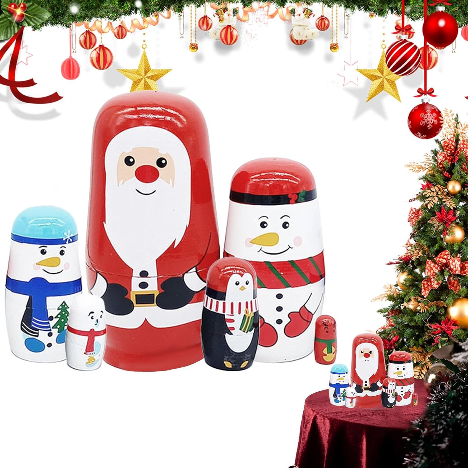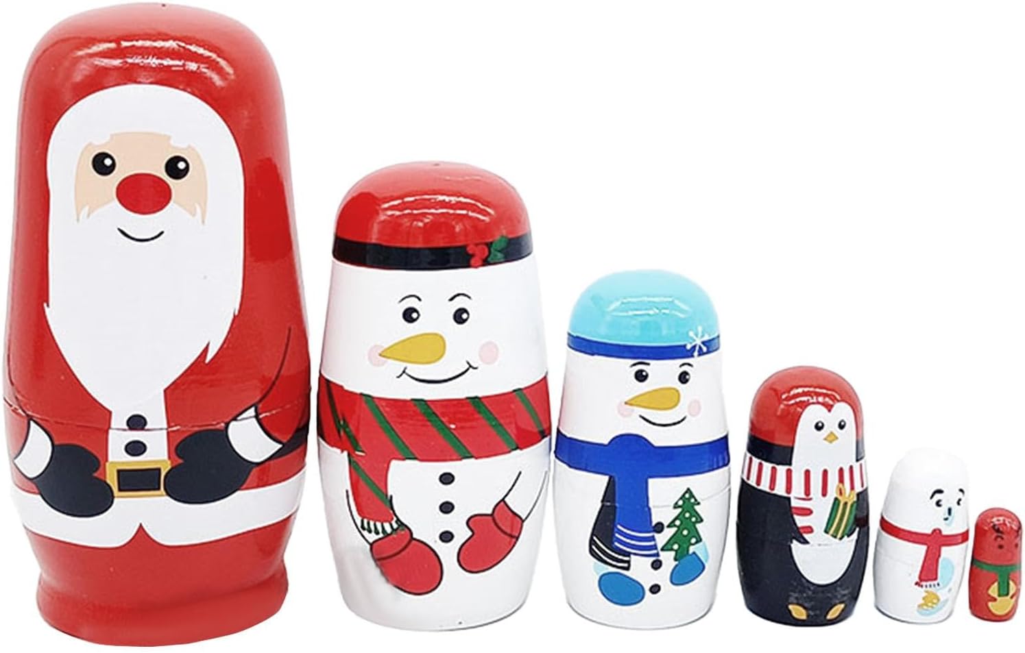 Design in legno realizzato a mano: queste bambole da nidificazione natalizie sono meticolosamente realizzate a mano con legno di alta qualità, garantendo che ogni bambola abbia un fascino unico e un colore vibrante; perfetto per aggiungere un tocco di artigianato tradizionale alle tue decorazioni natalizie Divertente giocattolo impilabile: queste bambole carine e colorate offrono ore di divertimento mentre i bambini le impilano e le annidano insieme; promuove le capacità motorie e la creatività, rendendole un fantastico giocattolo educativo per i più piccoli. Decorazione natalizia perfetta: con i loro colori festivi e i design a tema natalizio, queste bambole nidificanti costituiscono una deliziosa aggiunta al tuo arredamento natalizio; posizionali su una mensola, un tavolo o uno scaffale per diffondere l'allegria stagionale. Ideale come regalo per le vacanze: queste affascinanti bambole russe che nidificano sono un regalo eccellente per Natale o compleanni; amate sia dai bambini che dai collezionisti, portano un tocco gioioso a qualsiasi celebrazione natalizia. Robuste e sicure per i bambini: realizzate con materiali sicuri, queste bambole sono progettate pensando ai bambini; sono robusti, facili da maneggiare e realizzati con piccole parti che potrebbero rappresentare un pericolo di soffocamento, garantendo un tempo di gioco sicuro
