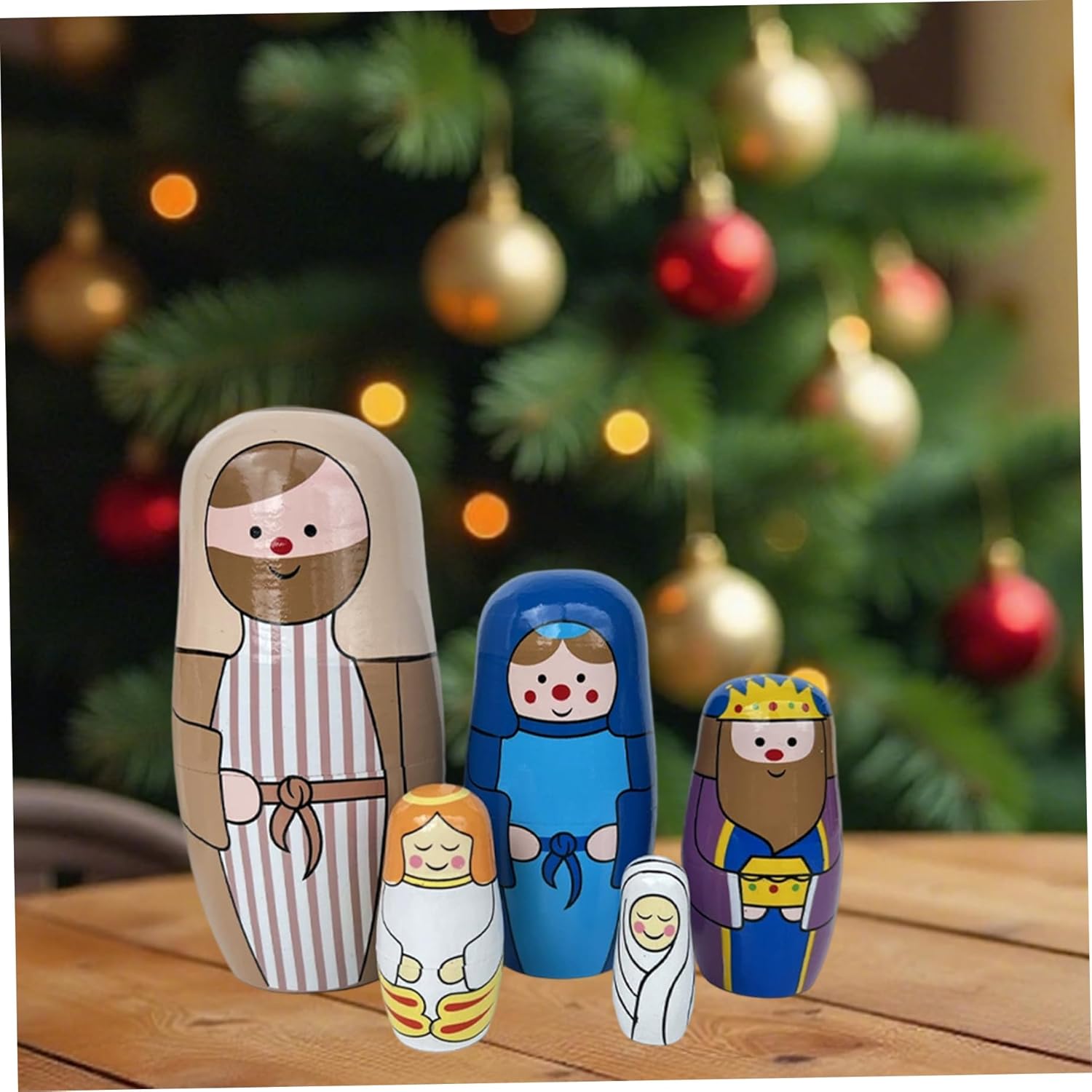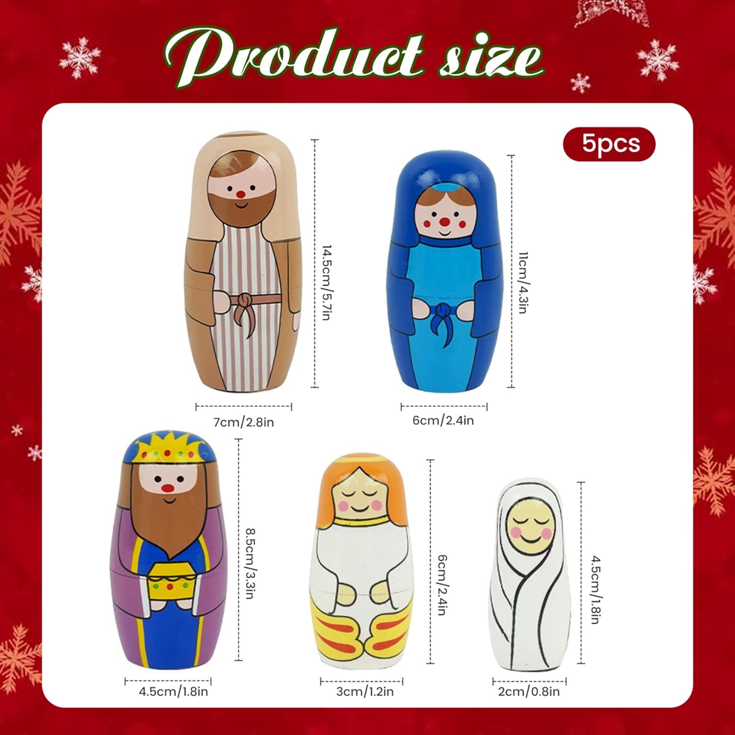 Autentica natività artistica: dipinte a mano con dettagli squisiti, queste bambole nidificanti in legno raffigurano magnificamente la scena di Gesù Natività, portando uno spirito sincero e tradizionale alle tue celebrazioni di Natale, Pasqua o di compleanno..Ogni bambola mette in mostra colori vividi e design significativo che onora la storia della stagione. Bambola da nidificazione russa Matryoshka Doll Presente e decorazione perfetti: ideale per la presentazione durante Natale, Pasqua o compleanni, questo set funge sia da regalo significativo che da una decorazione per la casa festosa..La vibrante opera d'arte a tema natività migliora l'arredamento delle vacanze e ispira la celebrazione..Bambole di nidificazione delle bambole Matryoshka per bambini 1-3 Artigianato in legno premium: realizzato in legno stabile, queste bambole Matryoshka in stile russo offrono fascino di lunga durata e una finitura liscia che è sicura per i bambini..La costruzione robusta garantisce anni di divertimento e display familiari..Bambole nidificanti per i più piccoli bambole nidificanti per bambini Set compatto e collezione: questo set di bambole nidificanti a 5 pezzi è compatto per una facile conservazione e viaggio, incoraggiando la raccolta e la visualizzazione..La sua miscela unica del tradizionale design delle bambole russe con il simbolismo della natività cristiana lo rende un ricordo prezioso..Bambole nidificanti per bambini bambola russa Divertimento educativo e interattivo: progettati per bambini e bambini, queste bambole nidificanti promuovono sottili abilità motorie, coordinamento occhio-mano e gioco fantasioso..La loro caratteristica di nidificazione incoraggia la risoluzione dei problemi e la curiosità, rendendo l'apprendimento gioioso e coinvolgente per i bambini..Bambole russe bambole russe bambole nidificanti