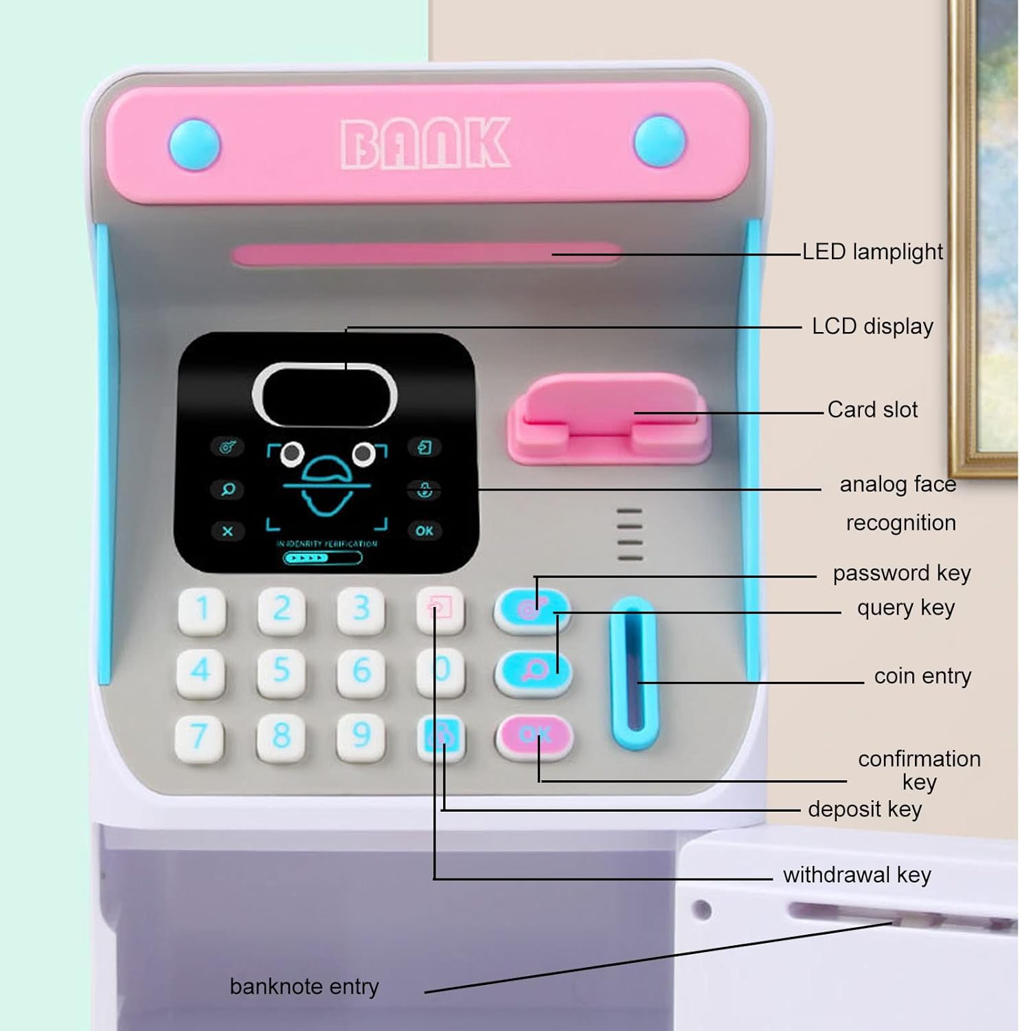[Banca di grandi capacità] La banca dei soldi per bambini vanta una grande capacità che può contenere fino a 600 monete o 100 banconote, rendendolo una scelta ideale per i bambini che stanno imparando a risparmiare denaro. Il suo design spazioso incoraggia i giovani risparmiatori a sviluppare presto abitudini di salvataggio disciplinate. Questa banca di denaro per i risparmi bancomat non è un giocattolo; È strumento educativo che insegna la responsabilità finanziaria in modo divertente [Sicurezza per la password] Dotato di una funzionalità di password a cifre, questa banca bancomat per bambini garantisce che il risparmio di tuo figlio rimanga sicuro. La password predefinita è impostata su 0000, ma può essere modificata facilmente in qualsiasi combinazione di tua scelta. Se la password viene inserita in modo errato, la macchina rimane bloccata, fornendo un ulteriore livello di sicurezza che imita esperienze bancarie nella vita reale per tuo figlio. [ di riconoscimento del volto divertente] La banca di denaro per il risparmio bancario presenta una funzione innovativa di riconoscimento del viso che migliora l'esperienza dell'utente, rendendola un straordinario per i bambini. Questa caratteristica coinvolgente rende il risparmio di denaro eccitante e interattivo, catturando l'attenzione di tuo figlio mentre imparano il valore della gestione del denaro. [Bobina automatica a banconote] I bambini adoreranno la bobina automatica di banconote su questo macchina per banche di denaro. Basta posizionare una banconota sulla bobina e verrà disegnata senza intoppi e automaticamente nel dispositivo. Questa interazione pratica affascina i bambini e li tiene coinvolti nel loro percorso di educazione finanziaria, rendendo il processo di salvataggio sia pratico che divertente. [Materiale sicuro ed ecologico] Costruito in plastica ecologica, la banca ATM di risparmio per bambini è per il tuo bambino e consapevole dell'ambiente. La sua costruzione robusta e robusta garantisce la longevità mantenendo gli standard di sicurezza. Questa banca di denaro è un'ottima scelta di deposito per i bambini, che combina valore educativo con la sicurezza e la responsabilità ambientale.