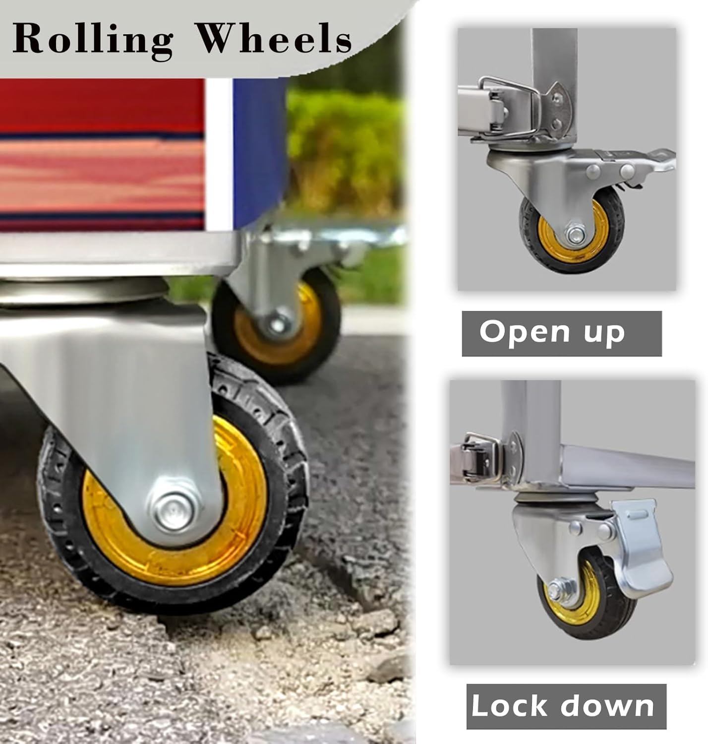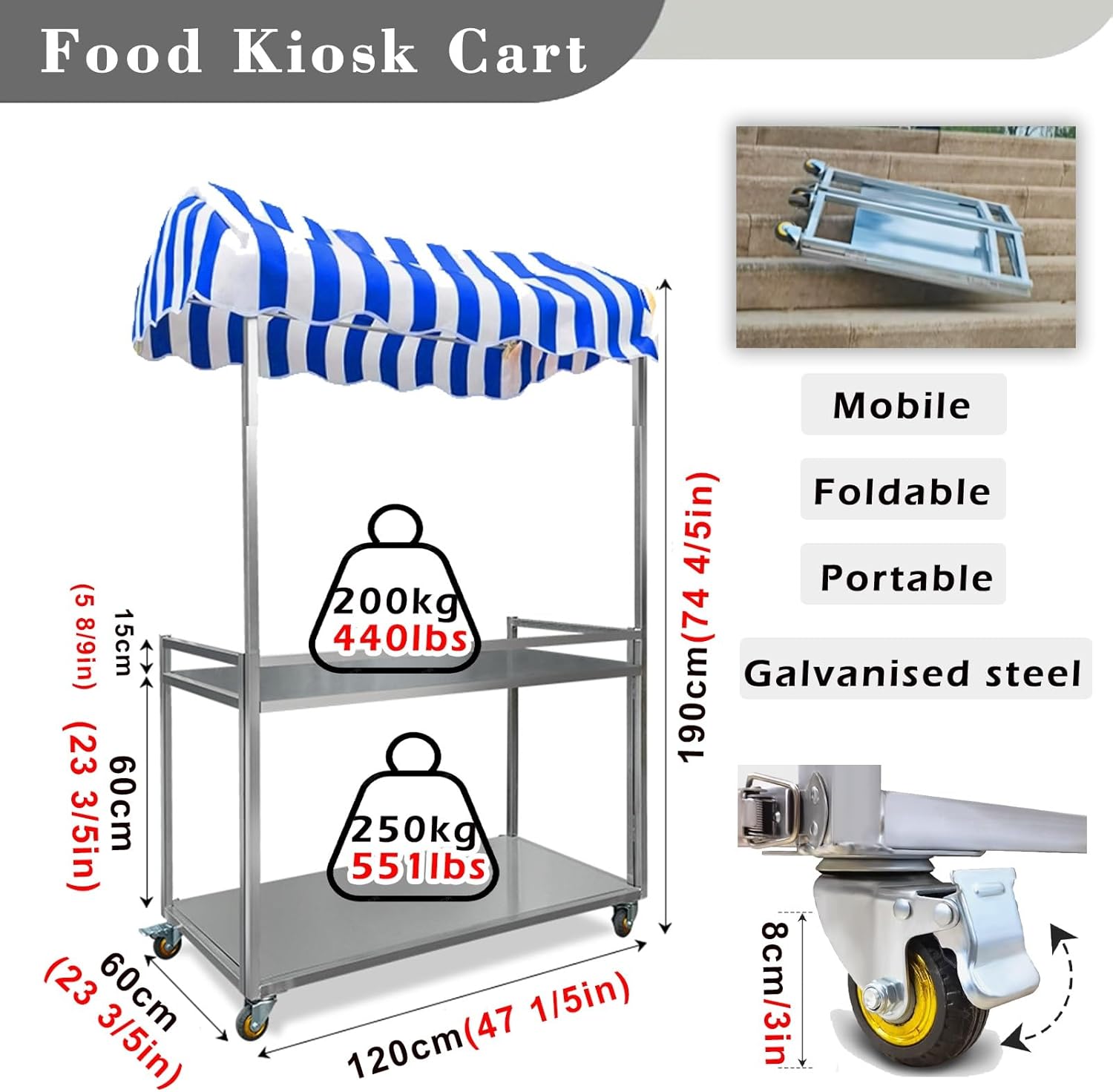 Carrello pieghevole per bancarelle: il nostro carrello per bancarelle è dotato di telai e pannelli staccabili per un rapido utilizzo. L'installazione e il montaggio fai da te richiedono solo pochi minuti. Ideale per venditori ambulanti, bancarelle ed eventi all'aperto, offre una soluzione mobile versatile per le attività commerciali. Chiosco mobile per cibo con ruote da 8 cm: scivola attraverso strade acciottolate o fiere affollate con ruote resistenti da 8 cm. Niente più mal di schiena per il trascinamento delle attrezzature: il tuo stand scorre senza intoppi, anche su campi erbosi o marciapiedi irregolari. Stand con portata di 500 kg: costruito con supporti in acciaio zincato, questo stand può sostenere fino a 500 kg/1102 libbre senza ruggine o deformazioni. La tettoia inclusa garantisce protezione da qualsiasi condizione atmosferica (pioggia/neve) e il suo design resistente dura dai 5 ai 10 anni. Ampio spazio di archiviazione: riponi le cassette dei contanti, i menu di riserva o quel bouquet extra sotto il discreto ripiano inferiore. Niente più inciampi nel disordine, ideale per fioristi, negozi di souvenir, grandi magazzini, centri commerciali o chioschi indipendenti. Intestazione personalizzabile: condividi la tua visione progettuale e noi la realizzeremo! Pannelli pubblicitari pronti per essere affissi attirano l'attenzione e migliorano la professionalità del marchio. Una scelta perfetta per le dimostrazioni di prodotto.