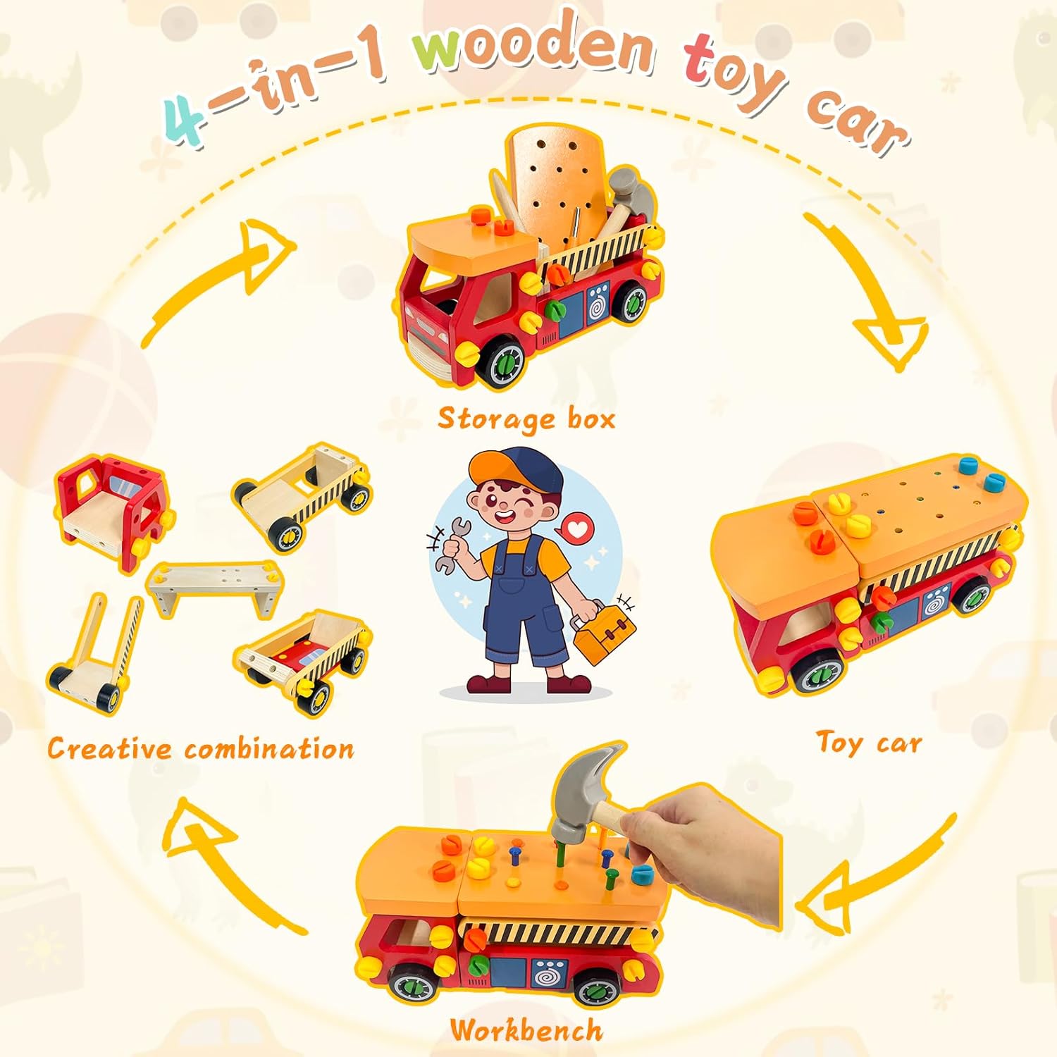 Giochi in Legno da 62-Pezzi: contiene 1 camion giocattolo per bambini in legno (assemblata da te), 3 tipi di strumenti e 3 tipi di PVC-viti, che possono aiutare i bambini dai 3 anni in su a riconoscere le parti, esercitare movimenti fini della mano e occhio-mano coordinazione Giochi Montessori 3 Anni in Su: Viti in 9 colori, camion dai colori intensi e loghi unici. Durante il periodo sensibile al colore, gli accessori luminosi possono aumentare il riconoscimento dei colori da parte dei bambini e stimolare lo sviluppo della loro attività cerebrale Banco Lavoro Bambini di Alta Qualità: il corpo degli giocattoli bambino sono realizzati in legno di alta qualità sicuro e durevole, con superficie liscia e bordi senza sbavature. Le viti sono realizzate in materiale PVC resistente e durevole. La dimensione è progettata per le mani dei più piccoli, facilitando l'utilizzo dello strumento da parte dei bambini, garantendo loro un gioco sicuro e duraturo Facile da smontare e montare: la cassetta attrezzi bambini integra un banco da lavoro, una macchinina, una scatola di immagazzinaggio e una combinazione creativa(Con video operazioni di assemblaggio creativo), consentendo ai bambini di imparare a usare martelli e cacciaviti per assemblare macchinine come un piccolo ingegnere in un'esperienza di gioco creativa Giochi Bambini 3 Anni: la superficie di tavolo da lavoro per bambini è molto istruttiva e viene fornita in una bellissima confezione regalo, adatta a ragazzi e ragazze di età superiore ai tre anni come regali di compleanno, regali di Natale e regali incentivanti. Servizio di alta qualità: Konoz spera che questi giocattoli per bambini possano creare interessanti momenti di gioco tra genitori e figli per te. Se hai domande sul prodotto, puoi contattarci in qualsiasi momento e ti forniremo rapidamente una soluzione!