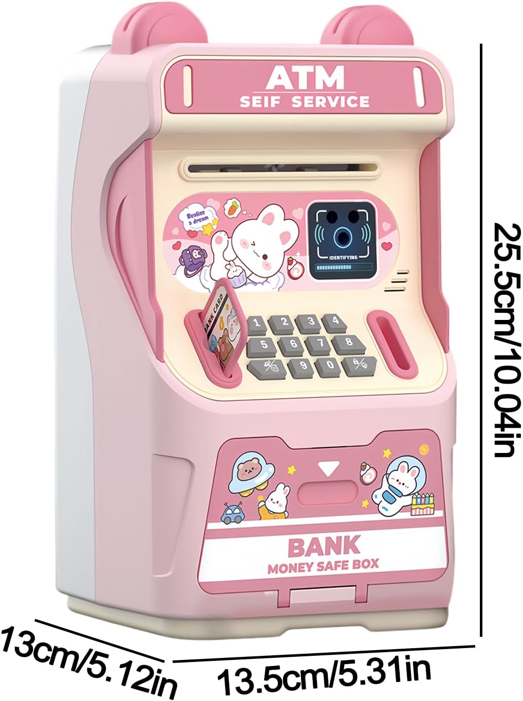 Integrazione Sonora Allegra: Il salvadanaio ATM per bambini include effetti sonori allegri e una riproduzione musicale automatica, che forniscono un feedback audio coinvolgente, migliorando la gioia di risparmiare denaro mentre crea un'atmosfera durante il gioco o le attività familiari. Questa integrazione sonora rende il processo di risparmio più piacevole e memorabile per tutta la famiglia, con audio che incoraggia i bambini a partecipare attivamente e a godere di ogni momento di rispa Meccanismo Prelievo Sicuro: Concentrandosi sull'essere sia divertente che funzionale, questo prodotto incorpora un meccanismo di salvadanaio sicuro, permettendo ai bambini di praticare il risparmio e il prelievo in sicurezza mentre sviluppano abitudini finanziarie essenziali sotto la guida genitoriale. Il design assicura che le operazioni siano intuitive e sicure, promuovendo l'autonomia dei bambini nella gestione del denaro con la supervisione adulta, in un ambiente di apprendimento pratico e p Gestione Denaro Interattiva: Il salvadanaio ATM include un meccanismo di rotolo monete coinvolgente che migliora l'esperienza rituale del risparmio, consentendo agli utenti di monitorare visivamente il processo di accumulo. Questa funzionalità ispira un approccio tecnologico alla gestione del denaro nella vita quotidiana, promuovendo competenze finanziarie essenziali attraverso un metodo interattivo e moderno che rende il risparmio accessibile e stimolante per i bambini. Interactive Card Play Feature: By integrating interactive card play and realistic ATM simulation, this ATM Bank for Kids creates an engaging environment where children can practice budget management and financial decisions, making learning money management both fun and effective to develop basic financial skills in a playful and engaging way. Attrazione Risparmio Bambini: Il Kids ATM presenta un design adorabile a tema coniglio che attira l'attenzione dei bambini e promuove abitudini di risparmio in modo divertente e coinvolgente. Mentre i piccoli interagiscono con questa cassaforte durante il gioco o le attività familiari, il simpatico tema del coniglio trasforma il risparmio in un'esperienza piacevole e educativa, aiutando a sviluppare una consapevolezza finanziaria sin dalla giovane età attraverso un gioco stimolante e interattivo