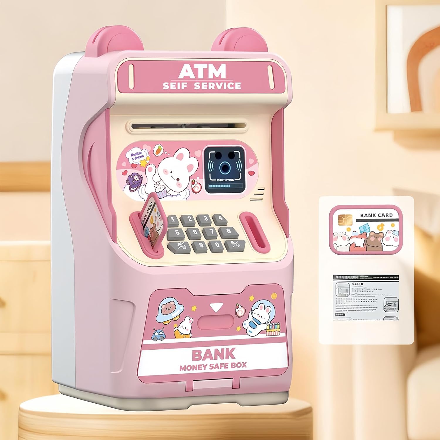 Compagno di Risparmio Divertente: Progettato per intrattenere i bambini, il salvadanaio ATM combina segnali audio allegri e musica automatica, creando un'esperienza di risparmio immersiva che incoraggia i bambini a divertirsi gestendo le loro monete durante momenti di gioco. Questo compagno di risparmio rende l'attività piacevole e educativa, promuovendo la responsabilità finanziaria in modo ludico, con audio e musiche che trasformano il risparmio in un'avventura coinvolgente e memorabile per i Archiviazione Sicura Denaro: L'ATM Salvadanaio funziona come un contenitore di risparmio bloccabile, aiutando i bambini a imparare la responsabilità finanziaria mentre protegge monete e banconote attraverso un design sicuro che previene l'accesso non autorizzato. Lo rende ideale per insegnare abitudini di risparmio a casa o in classe, con una struttura robusta che assicura durabilità e sicurezza. Promuove un senso di proprietà e responsabilità nei giovani utenti, facilitando l'apprendimento Design Ispirato alla Tecnologia: Il salvadanaio ATM per bambini offre un processo di risparmio visibile attraverso il suo di rotolo monete coinvolgente, progettato per fornire un metodo innovativo di monitorare i progressi del risparmio. Questo design tecnologico migliora l'impegno degli utenti nella gestione finanziaria personale, rendendo il tracciamento dei risparmi un'attività trasparente e motivante che incoraggia una maggiore partecipazione alle abitudini economiche giornaliere. Divertimento con Riconoscimento Facciale: Questo Bancomat per Bambini fornisce una simulazione realistica di bancomat con il divertimento del riconoscimento facciale, consentendo ai giovani utenti di immergersi in un ambiente bancario esperienziale mentre apprendono le del risparmio e a spesa durante il di gioco, promuovendo l'apprendimento finanziario attraverso attività interattive e coinvolgenti. Giocattolo Monetario Coinvolgente: Con un aspetto delizioso ispirato al coniglio, il Kids ATM trasforma il risparmio in un'esperienza divertente, aiutando i bambini a sviluppare abitudini monetarie positive mentre lo usano come accessorio giocoso e strumento di apprendimento pratico quotidianamente. Questo salvadanaio rende l'educazione finanziaria un momento di gioia e interazione, i piccoli possono esplorare il valore del denaro attraverso il gioco immaginativo, rafforzando le abilità di