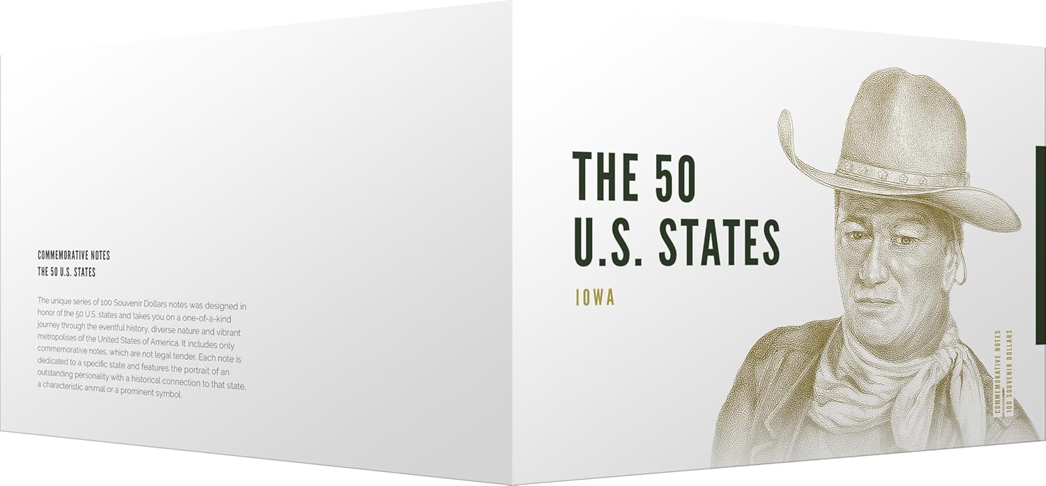 - Casa della star di Hollywood John Wayne - Design dettagliato con ologramma e colore UV - Numero di serie individuale e motto statale Attenzione: la banconota non ha corso legale!
