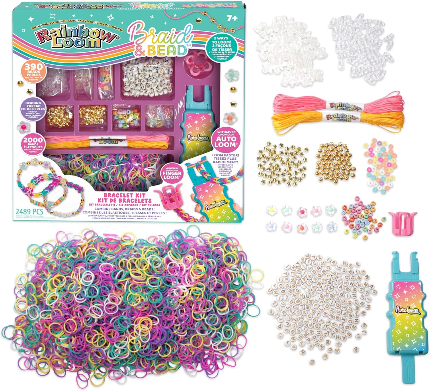 GIOCATTOLO CREATIVO BREVETTATO – Rainbow Loom propone numerosi set con materiali resistenti per creare gioielli duraturi. Con il set Perline e Trecce Rainbow Loom, libera la tua creatività con perline colorate ed elastici per creazioni uniche! COFANETTO REGALO COMPLETO PER BAMBINI – Questo kit per la creazione di braccialetti contiene: 2000 elastici + 390 perline + filo per perline + 1 Auto Loom + 1 Finger Loom, e un manuale di istruzioni passo dopo passo. ATTIVITÀ CREATIVA PER BAMBINI DAI 7 ANNI IN SU – Un'attività conviviale in cui i bambini possono creare gioielli per sé o per gli amici combinando elastici, trecce e perline. Due modi per tessere: con il Finger Loom o con l'Auto Loom, che è più veloce. BRACCIALETTI ELASTICI CON MATERIALI RESISTENTI - Gli elastici sono resistenti, in gomma e senza lattice. Inoltre, sono facili da maneggiare con i ganci a punta metallica appositamente adattati, o anche con le mani. Il kit per braccialetti Rainbow Loom è brevettato. COLLEZIONE RAINBOW LOOM - Rainbow Loom è specializzato nella creazione di gioielli e propone diversi kit completamente compatibili tra loro per ampliare le possibilità di personalizzazione: perline, charms, lettere, elastici colorati…