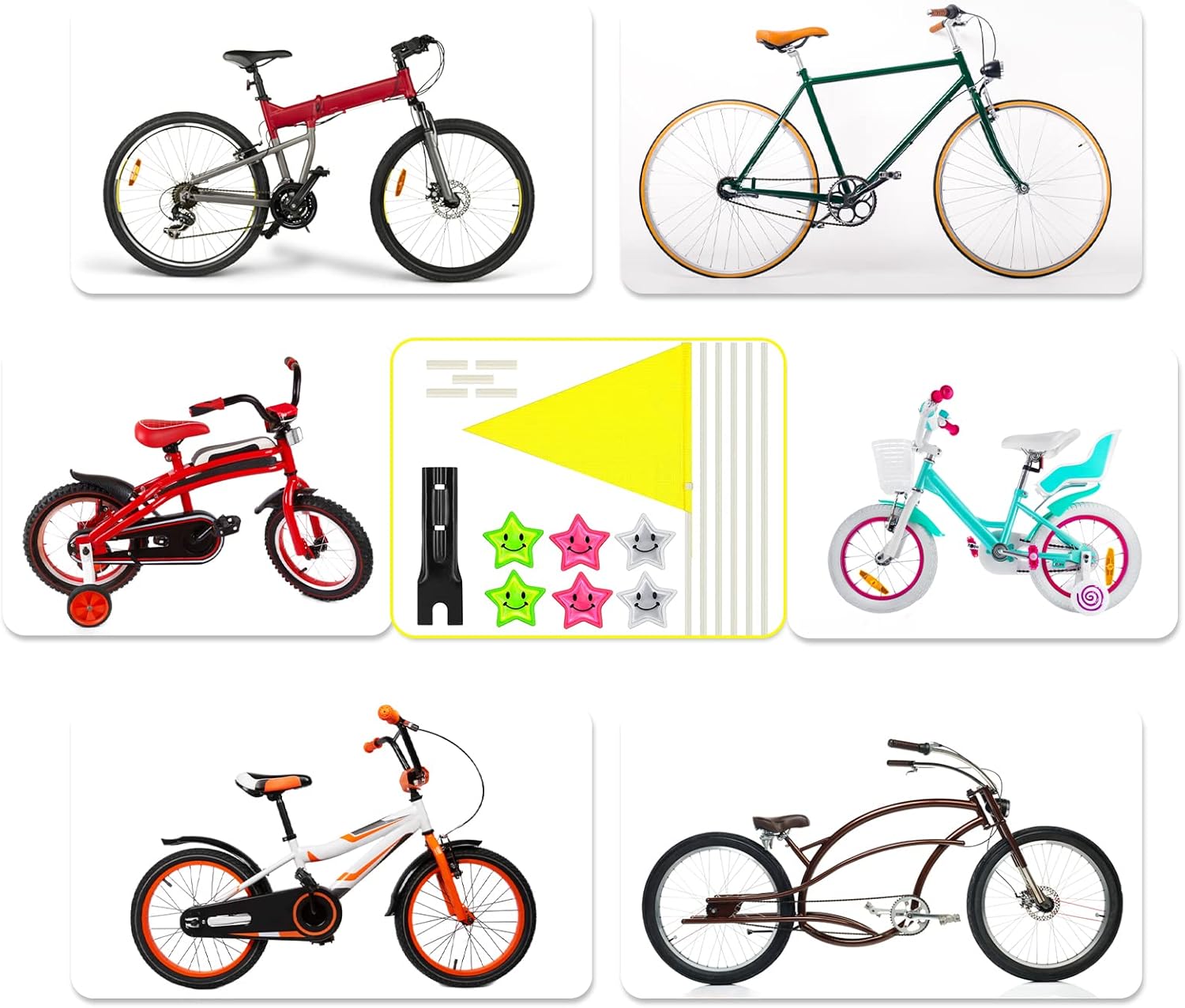 ◀Cosa riceverai: 1 accessorio giallo per bicicletta per bambini, 6 aste per bandiere di sicurezza per bicicletta 0,6 x 30, 5 prese bianche, 1 lamiera nera, 6 adesivi a stella riflettenti per ruota di bicicletta (due per ogni colore di bianco, giallo fluorescente e rosso acqua). Puoi regolare l'asta della bandiera velo a diverse altezze in base alle tue esigenze. È possibile utilizzare pali diversi per scopi diversi. ◀Alta visibilità: l'accessorio per bici per bambini rende la guida più sicura, la bandiera per bicicletta si attacca facilmente all'asse posteriore della bicicletta per la massima visibilità e la bandiera per bicicletta per bici per bambini può essere regolata a diverse altezze per consentire al veicolo di concentrarsi su di te il più possibile. L'asta della bandiera di sicurezza per la bicicletta viene utilizzata come simbolo di guida per rendere la guida più sicura e divertente. ◀ Materiali di alta qualità: questo gagliardetto di sicurezza per bandiera per bicicletta per bambini è realizzato in fibra di vetro e poliestere ad alta quota, la bandiera per bicicletta è durevole, resistente agli strappi e all'acqua e può resistere alla maggior parte delle condizioni atmosferiche, mentre la bandiera triangolare di sicurezza per bambini può anche resistere al vento, ai rami degli alberi, alle recinzioni pubblicitarie, ecc. ◀Facile da installare: la bandiera triangolare di sicurezza per bambini può essere installata sull'asse posteriore della bicicletta in pochi secondi. L'asta della bandiera viene solitamente fissata all'asse posteriore della bicicletta per bambini: allentare il dado della ruota, inserire l'asta della bandiera per la bicicletta per bambini, serrare il dado della ruota. La bandiera per bicicletta si adatta a tutte le comuni biciclette per bambini. Il kit può essere utilizzato come segnaletica ciclistica, rendendo il ciclismo più sicuro e divertente. ◀Ampia gamma di applicazioni: la bandiera di sicurezza per bicicletta ad alta visibilità è adatta per il fissaggio a biciclette, assi o bagagli, la bandiera per bicicletta è adatta anche per rimorchi, scooter o kart, la bandiera di sicurezza per bicicletta è adatta a bambini e adulti. Le biciclette per bambini e le biciclette per adulti possono utilizzare la bandiera per bicicletta per bambini per migliorare la sicurezza di guida.