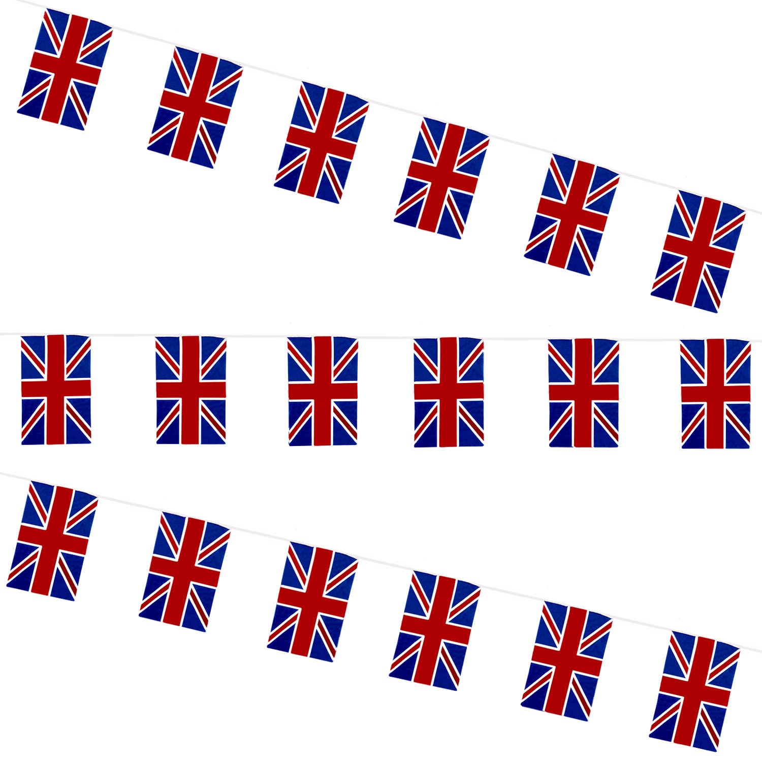 Dimensioni: 3,6 m con 11 vivaci bandiere Union Jack in poliestere cucite saldamente, perfette per aggiungere un audace orgoglio britannico al tuo spazio in qualsiasi evento o celebrazione. Ideale per celebrazioni reali, VE Day, compleanno del re, anniversari, giubileo di platino e festività nazionali: mostra il tuo amore per la Gran Bretagna con stile. Ideale per ambienti interni ed esterni come pub, giardini, barbecue, feste, negozi, scuole o anche per l'auto, la recinzione, la finestra o l'ingresso della casa. Realizzate in poliestere di alta qualità con cuciture robuste, queste bandiere possono resistere alle intemperie e sono pieghevoli per riporle e riutilizzarle facilmente. Design leggero con bandierine preassemblate: appendi semplicemente con nastro adesivo, spago o puntine da disegno per decorazioni per feste rapide e senza stress.