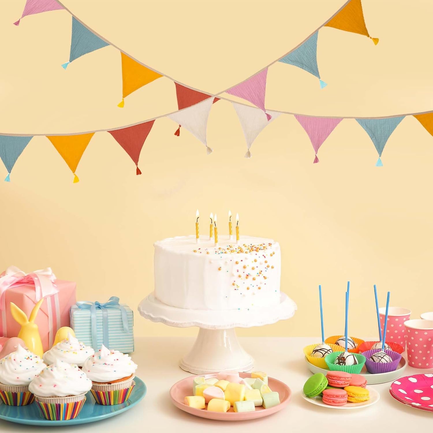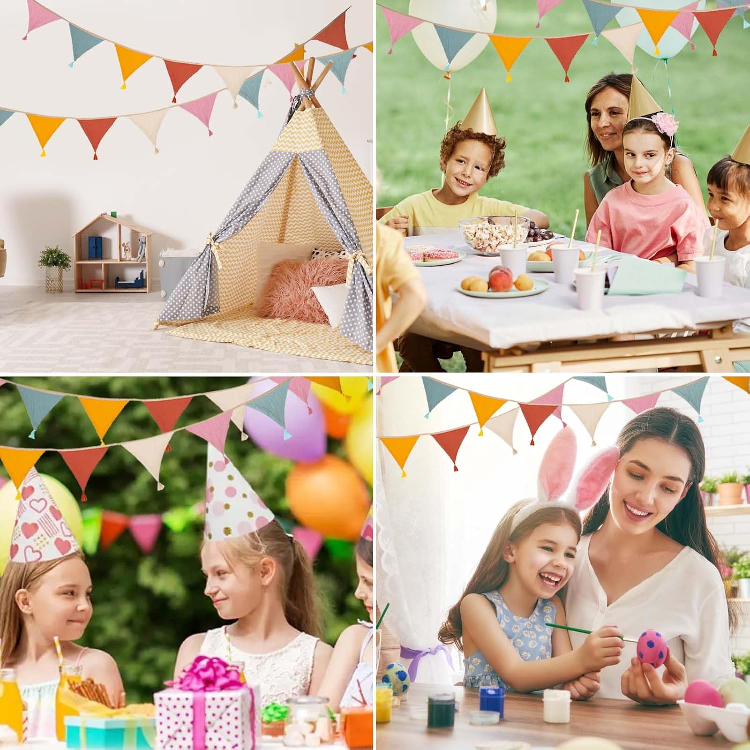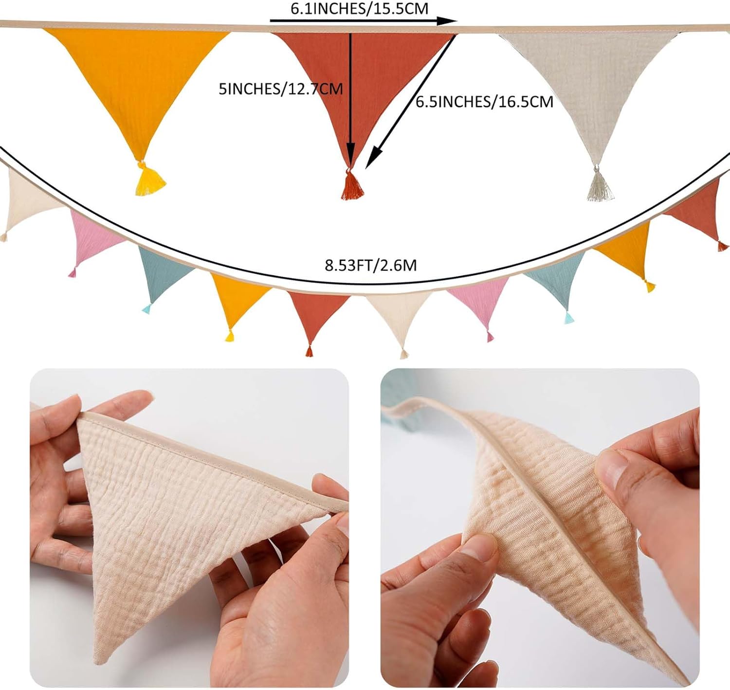 Contenuto della confezione: riceverete 1 set di gagliardetti in tessuto (2,6 m di lunghezza, 15,5 x 12,7 cm ciascuno, 10 pezzi in totale). La parte superiore dello striscione in cotone colorato è fissa e non scivola quando viene appeso. Materiale sicuro: il nostro gagliardetto in tessuto crêpe antistrappo con cuciture pulite è particolarmente morbido e confortevole e non ha odori sgradevoli. Design dai colori eleganti: il nostro stendardo in tessuto fronte-retro presenta un design a caramella semplice ed elegante in cinque colori vivaci: rosa, giallo, albicocca, arancione e verde, che rompe la monotonia e aggiunge luminosità e vitalità alla tua casa. Facile da montare: questa bandierina in tessuto è dotata di corde beige lunghe 50 cm su entrambe le estremità che possono essere appese orizzontalmente, verticalmente o ad angolo. Il tessuto dello stendardo lavabile in lavatrice mantiene la sua forma e il suo colore anche dopo un uso ripetuto. Ampia gamma di usi: gli striscioni colorati in cotone sono ampiamente utilizzati e sono molto adatti per la decorazione di matrimoni, compleanni, riunioni di famiglia e amici, camerette, camerette e aule.