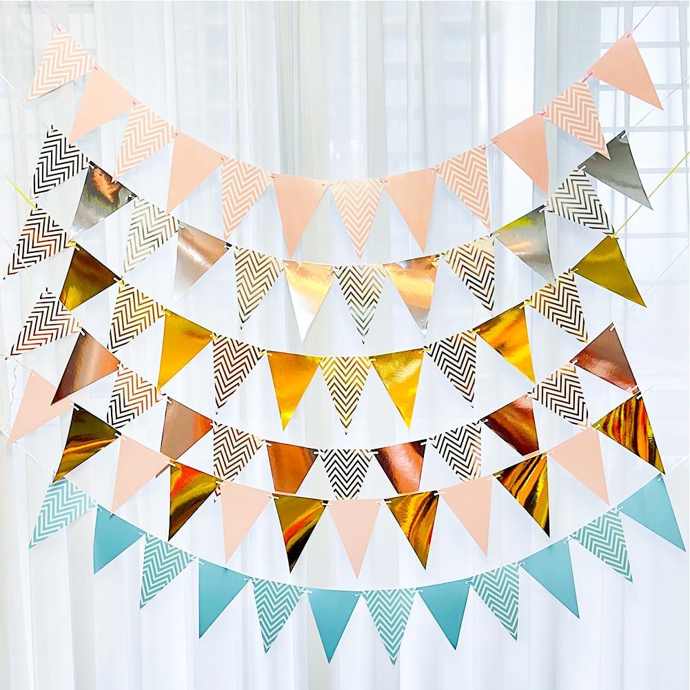 2/4 pacchetti con bandierine, ogni confezione contiene 12 bandiere, ogni bandierina è lunga 18 cm e larga 13 cm. Il numero di bandiere è sufficiente per soddisfare le esigenze dei festival quotidiani. La ghirlanda di bandierine è realizzata in carta patinata di alta qualità, sicura, affidabile, durevole, riciclabile. Economica: la ghirlanda di bandierine è molto adatta per decorazioni per feste e dona alla festa splendidi colori che offrono a voi e ai vostri amici un'esperienza visiva speciale. Le bandierine sono collegate su ogni lato con corde e possono essere facilmente regolate e rimosse. Le bandiere possono essere spostate lungo le corde a sinistra e a destra e la posizione può essere cambiata a piacimento, in modo da poterle regolare per ottenere l'effetto desiderato. La bandierina colorata è adatta per ogni occasione, come ad esempio: riunioni di classe, anniversari, matrimoni, compleanni, Natale, giardinaggio, attività all'aperto ecc.