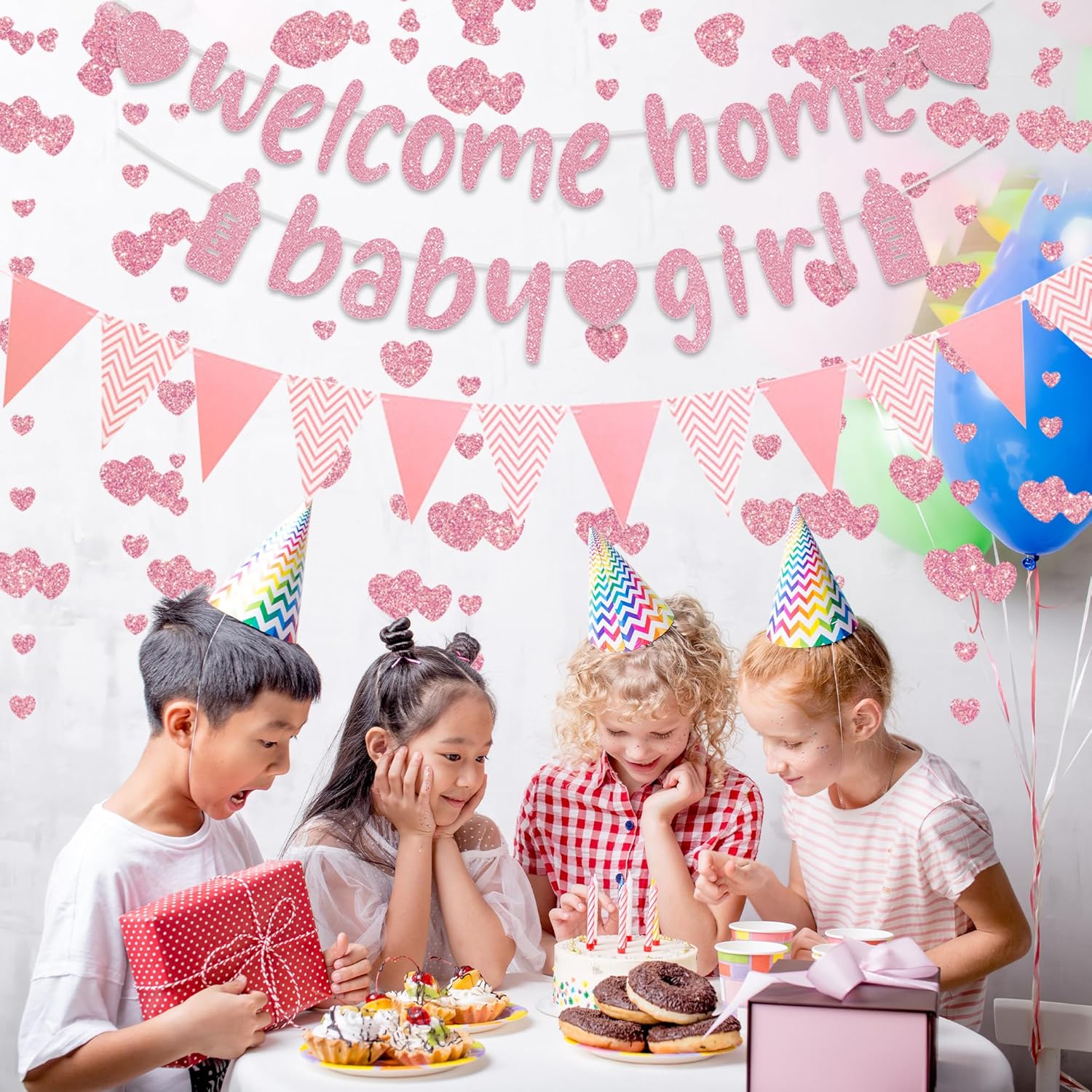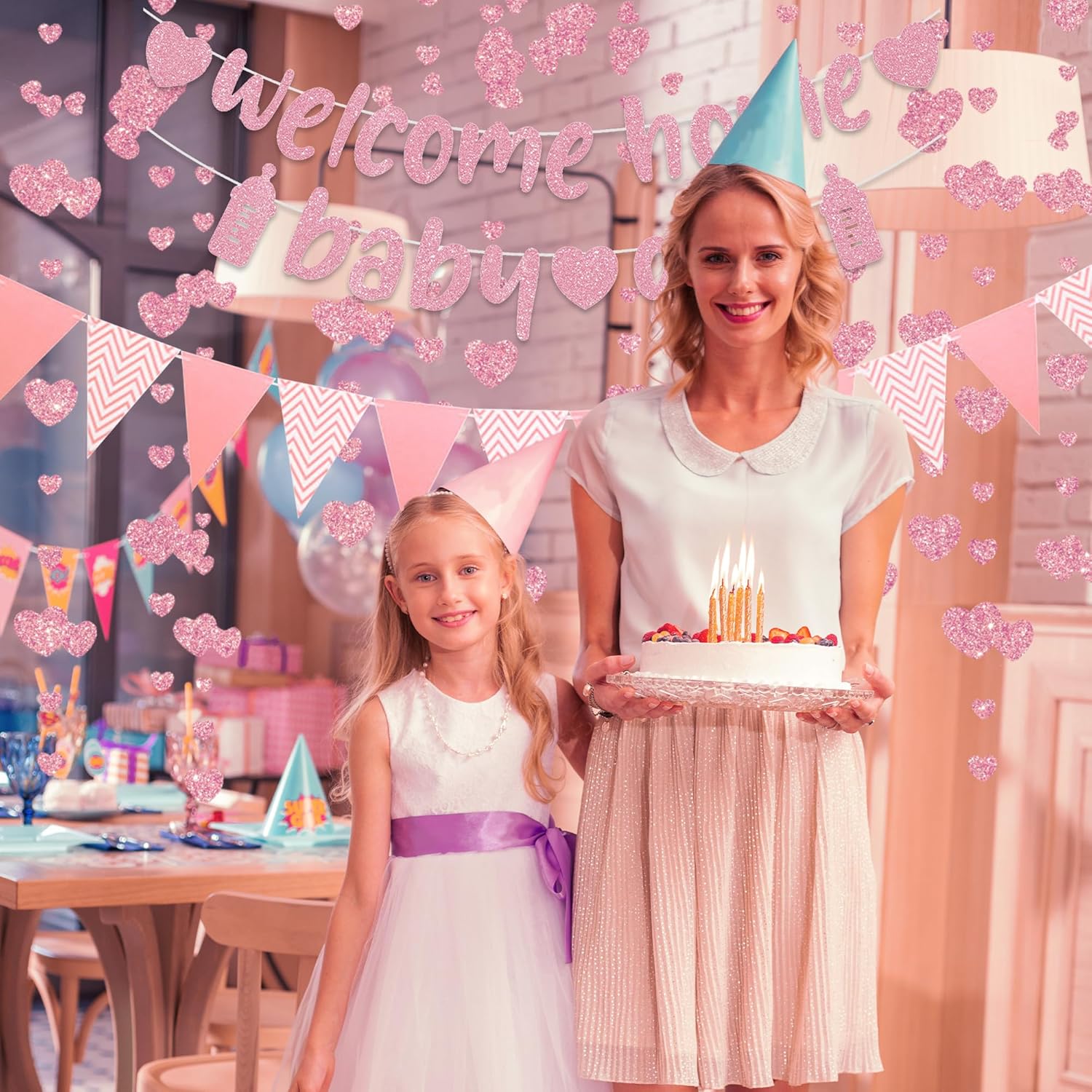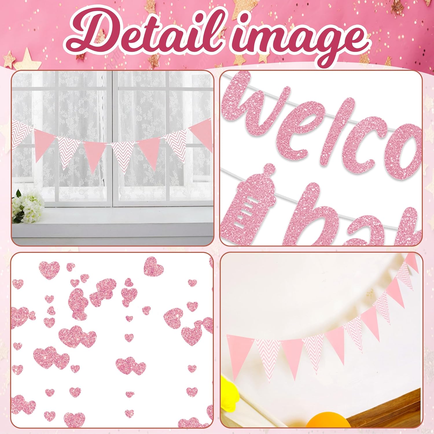 Banner di benvenuto a casa: lo striscione per bambina di benvenuto a casa include 2 striscioni, 1 gagliardetto, 1 ghirlanda, con piacevole design rosa, aggiungendo un tocco di eleganza alla tua celebrazione, una buona scelta per accogliere un neonato o festeggiare con la famiglia e gli amici Accenti rosa: con il suo colore rosa, queste decorazioni per la casa di benvenuto aggiungono calore e raffinatezza al tuo evento. La finitura scintillante cattura magnificamente la luce, rendendola un punto focale accattivante per la tua festa di ritorno a casa Ghirlanda di gagliardetti versatile: questa ghirlanda di gagliardetti a tema di benvenuto completa vari temi per feste, dalle baby shower alle celebrazioni di compleanno. Può essere facilmente appeso all'interno o all'esterno per creare un'atmosfera gioiosa che migliora qualsiasi riunione Facile da visualizzare: lo striscione richiede di assemblare le lettere insieme, le ghirlande possono essere tagliate alla lunghezza desiderata per l'installazione del luogo. Basta appenderli nello spazio della festa per migliorare l'arredamento e lasciare un'impressione duratura ai tuoi ospiti Celebrare nuovi inizi: i banner di benvenuto a casa sono adatti per celebrare nuovi arrivi, compleanni o riunioni di famiglia. Il tema accogliente favorisce un ambiente caldo per gli ospiti, garantendo che ogni momento trascorso insieme sia amato e memorabile