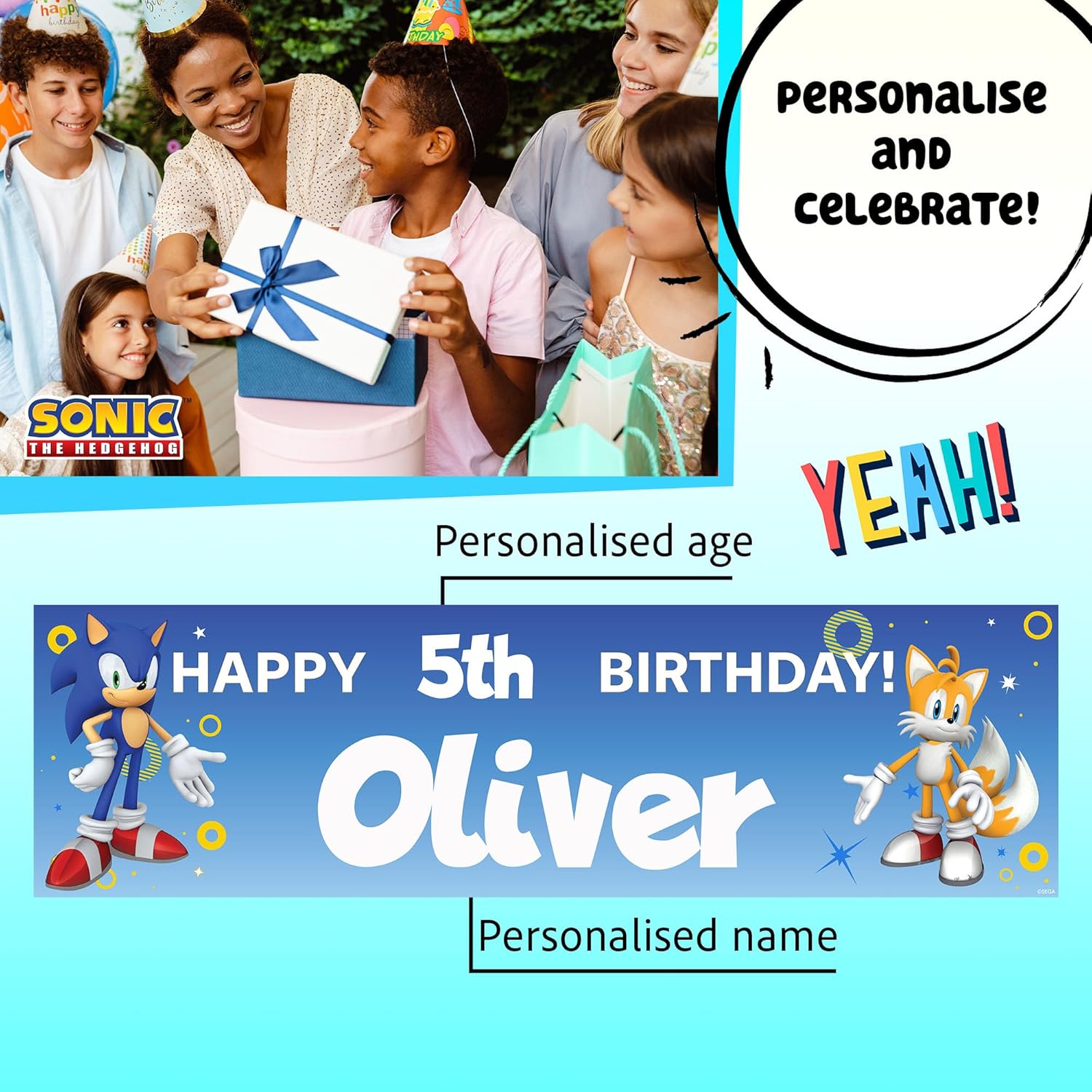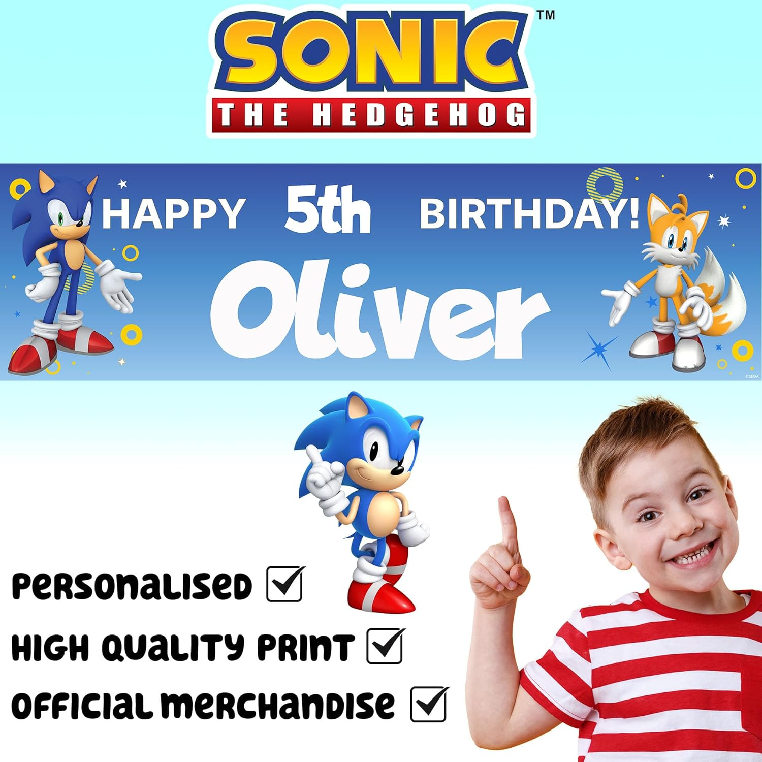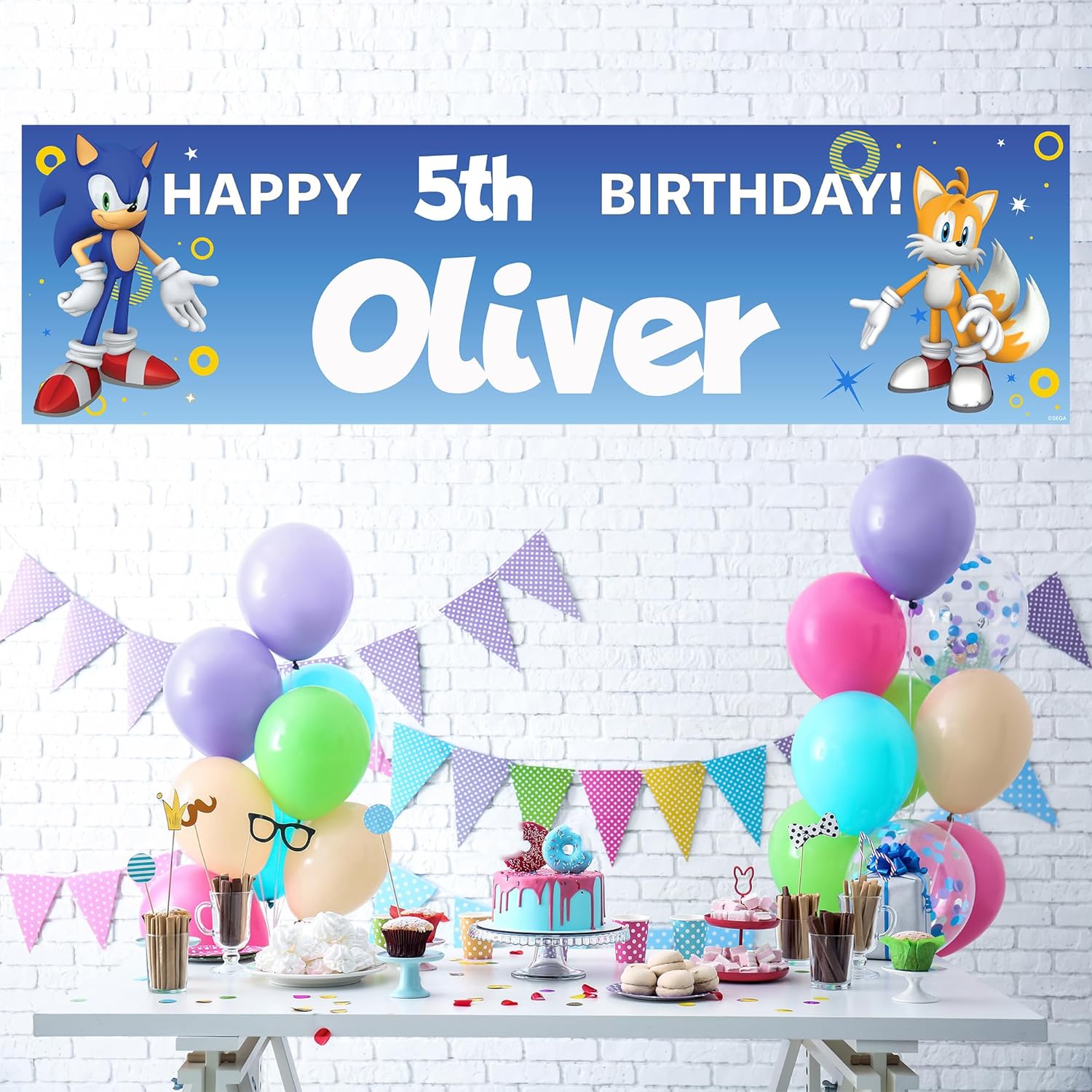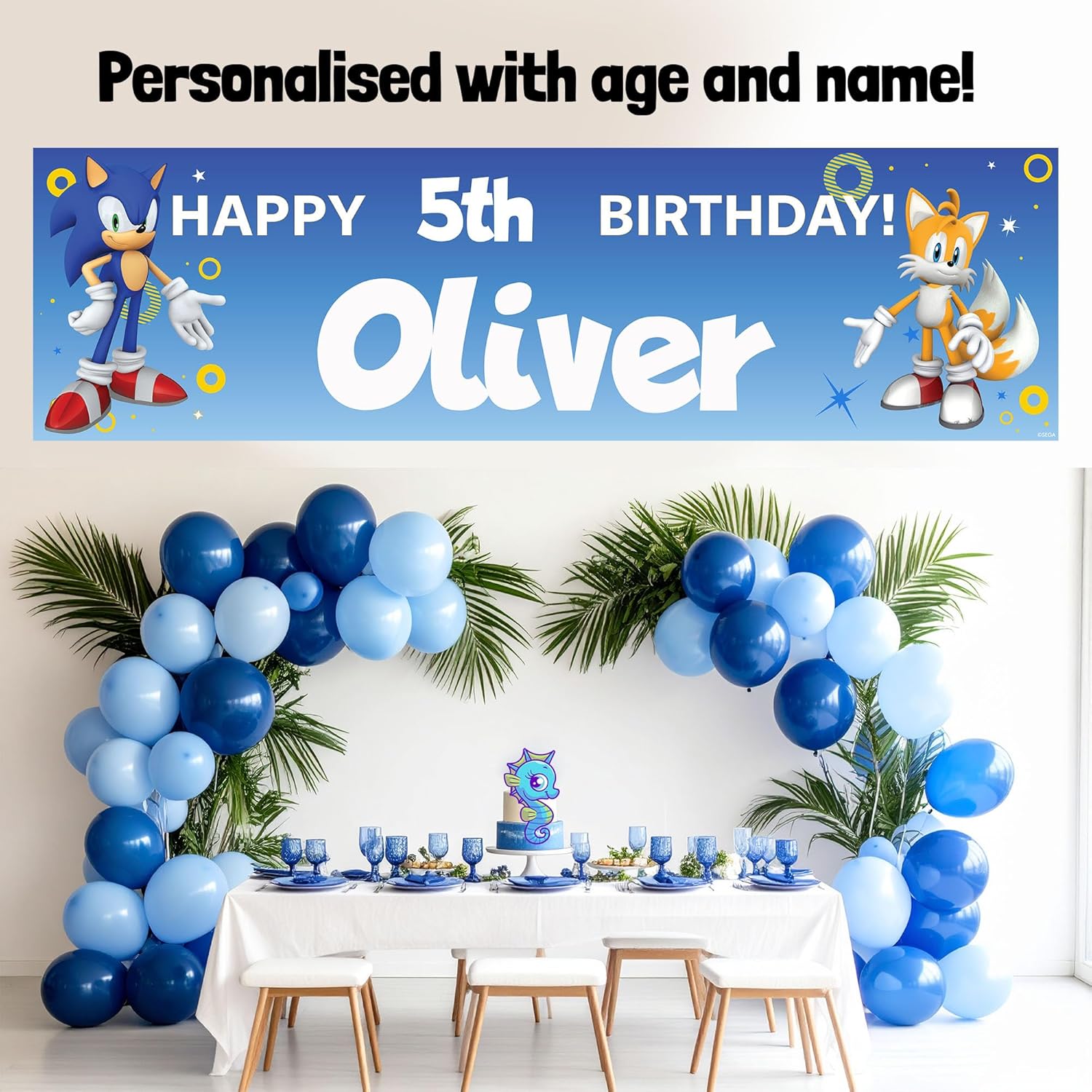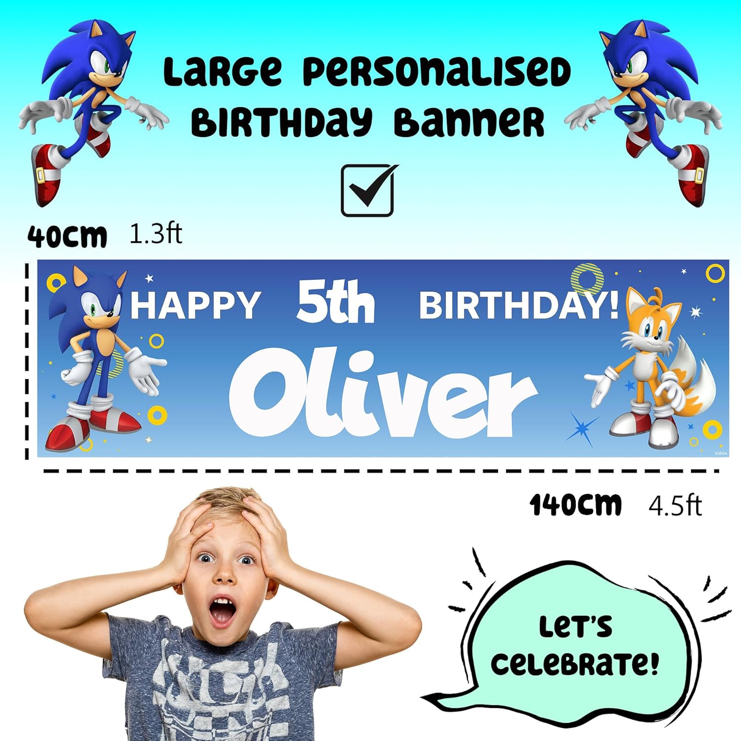 PERFETTO PER LE FESTE DI COMPLEANNO - Crea una festa indimenticabile con questo striscione di compleanno personalizzato di Sonic, ideale per i ragazzi che amano Sonic The Hedgehog. Personalizzato con nome ed età: aggiungi il nome e l'età di tuo figlio per un tocco di festa unico e personale. Grandi dimensioni per il massimo impatto - Misurando 140 x 40 cm, questo banner è lo sfondo perfetto per foto, tavoli per torte o ingressi a feste. Stampa vivace e di alta qualità - Caratterizzato da design Sonic audaci e colorati, questo banner resistente è stampato in alta risoluzione per stupire i tuoi ospiti. Facile da appendere, all'interno o all'esterno (quando non è bagnato) - Leggero e versatile, lo striscione può essere facilmente fissato con nastro adesivo, spago o ganci, perfetto per qualsiasi spazio di festa.