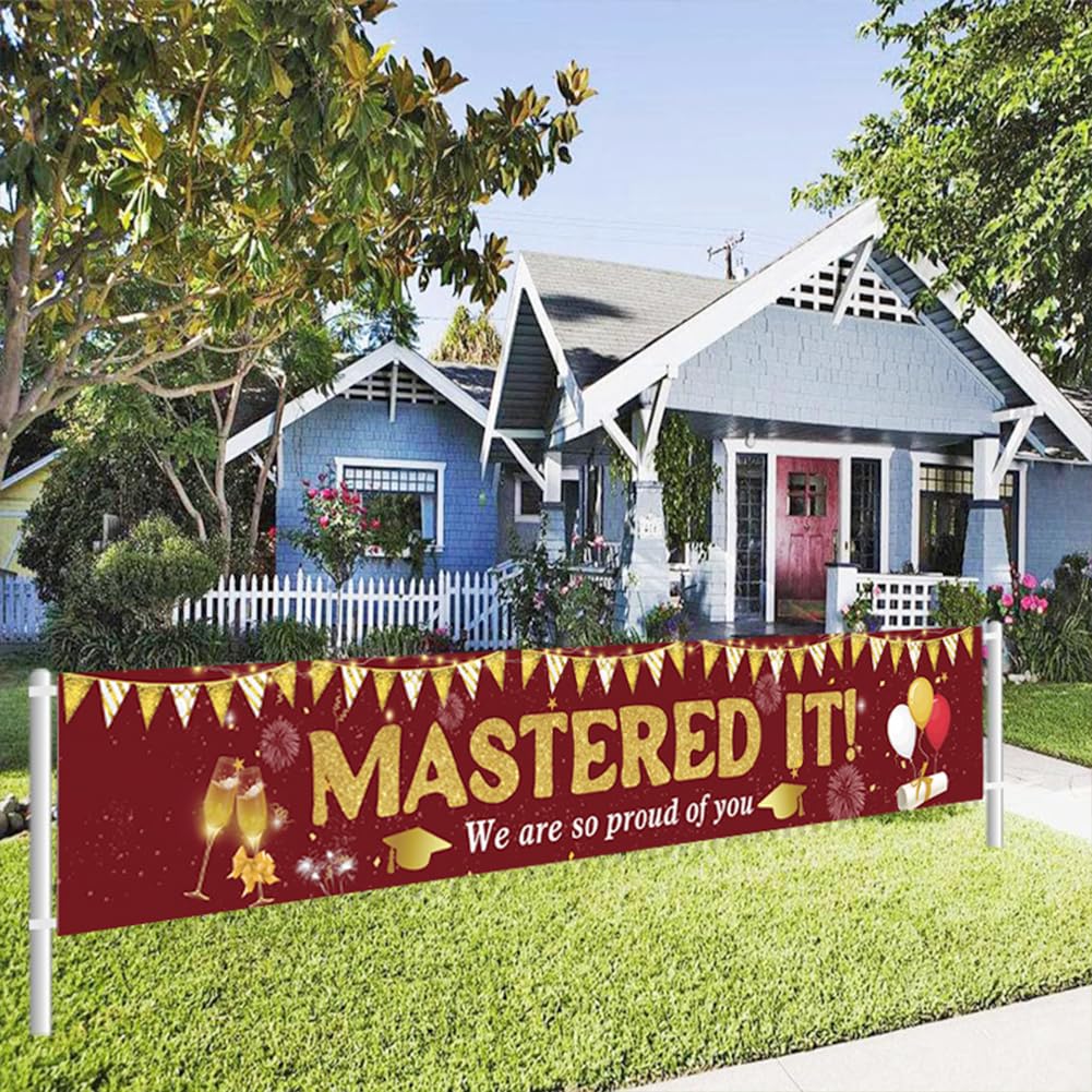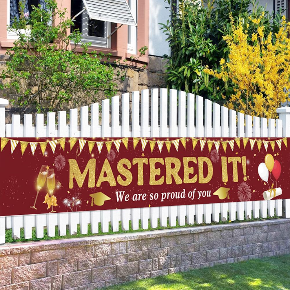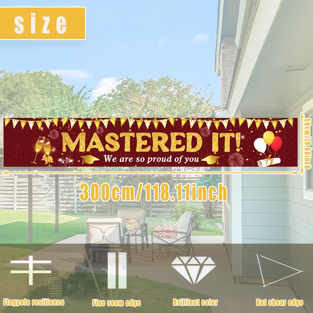 【Materiale】Tessuto in poliestere, resistente e durevole, antirughe, senza stiratura, nessuna deformazione. Durevole, leggero, resistente ai colori e agli agenti atmosferici, adatto per uso interno ed esterno. 【Dimensioni perfette】Circa 300 x 50 cm (118 x 19,7 pollici). È molto visibile e le persone possono vederlo da lontano. Dimensionato per adattarsi a qualsiasi spazio come pareti, portici, cortili, giardini, cortili, prati, ponti, bordo piscina e lago! 【Vantaggi】 Resistente, antivento, non facile da strappare, dai colori vivaci e stirabile. Molto stabile e bello. È stato il momento clou della festa. 【Occasioni applicabili】 Le parole extra large "Mastered It" portano facilmente un'atmosfera di laurea alla tua festa! Questo banner renderà la tua festa di laurea molto interessante e attraente. Creiamo un'atmosfera divertente e ricordi indimenticabili per i tuoi amici o familiari. Utilizzo: ai quattro angoli dello striscione è presente un piccolo foro che può essere fissato e appeso con delle corde. Può essere appeso a pareti, balconi, recinzioni, alberi, ecc. e può essere utilizzato all'interno e all'esterno.