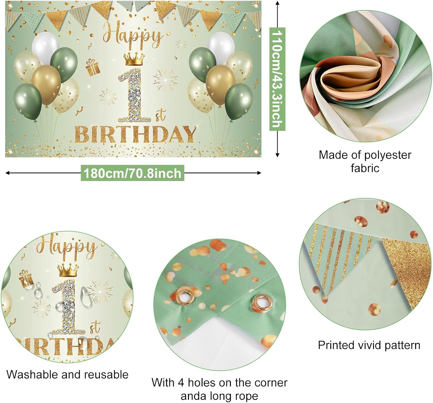 👑DIMENSIONE DEL BANNER DI COMPLEANNO: il banner di compleanno 1 misura 180x110 cm (70,8x43,3 pollici) ed è abbastanza grande da essere utilizzato come decorazione di compleanno o come sfondo per le foto della tua festa per aggiungere ancora più colore alla tua festa di compleanno! 🌟MATERIALI DI ALTA QUALITÀ: striscione per il primo compleanno realizzato in tessuto di poliestere, morbido, leggero, resistente, stampa digitale, colori brillanti, elevata solidità del colore! Lo sfondo della festa è lavabile e riutilizzabile. 💟FACILE DA USARE: installare le decorazioni per il primo compleanno è comodo e facile. È dotato di corda, basta fissarlo attraverso i 4 fori sugli angoli e appenderlo al muro, alla finestra, alla cabina fotografica o alla staccionata. Devi solo appenderlo dove vuoi decorare. 🎉OCCASIONE APPLICABILE: decorazione per striscione del 1° compleanno adatta per la festa a tema del 1° compleanno per ragazzo, sfondo fotografico per lo sfondo del 1° compleanno di ragazza, sfondo fotografico per le feste del 1° compleanno. Questo crea foto fantastiche e momenti felici con la tua famiglia e i tuoi amici! 💖SERVIZIO SODDISFATTO: se hai problemi con le nostre decorazioni per la festa del primo compleanno in oro verde prima di ordinare o problemi dopo aver ricevuto le forniture per la festa, faccelo sapere immediatamente. Forniremo soluzioni soddisfatte per aiutarti a risolverli. Per ulteriori articoli di decorazione per le feste, visita BTZO.