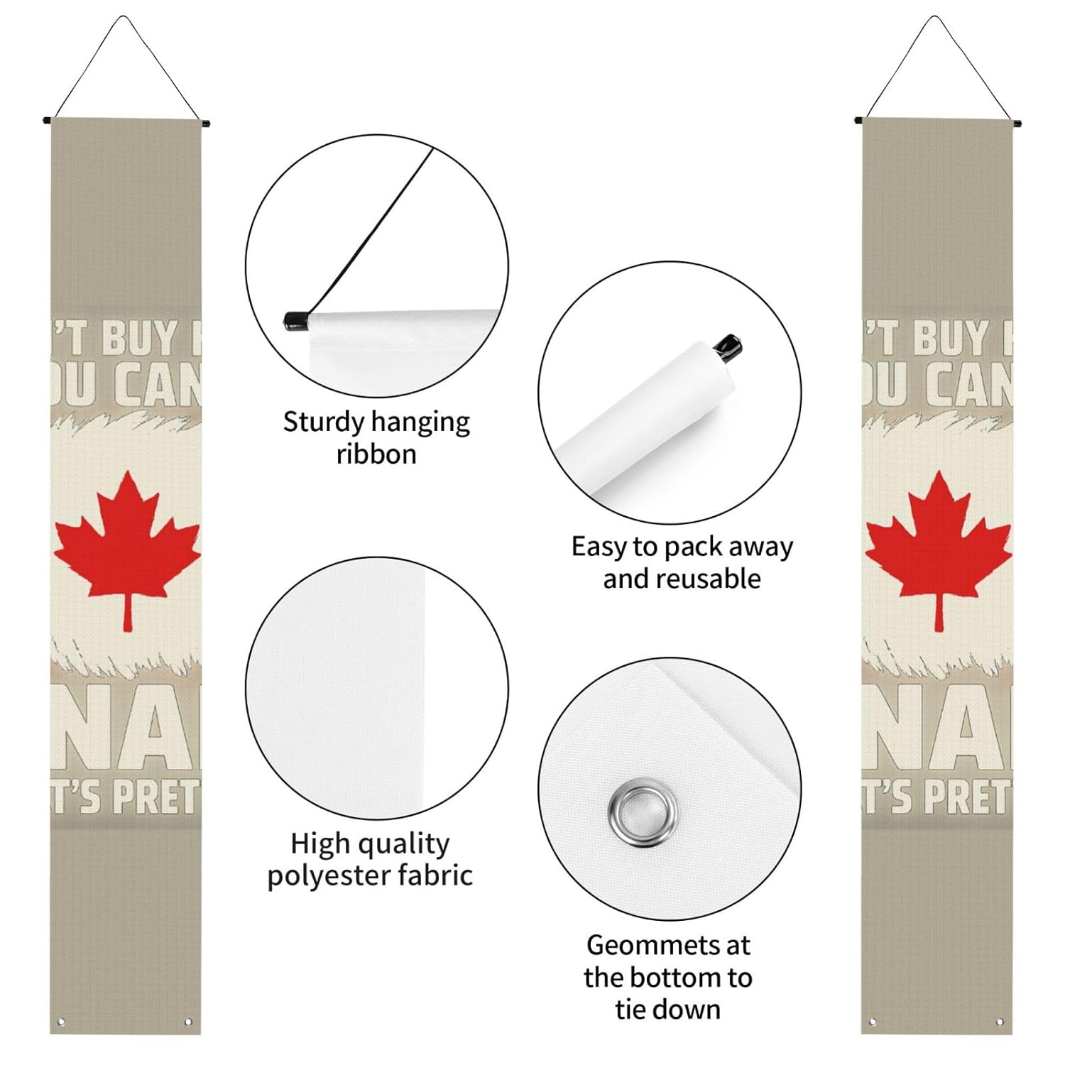 Dimensioni versatili per molteplici scenari: misurando 30 cm di larghezza e 180 cm di altezza, questo striscione stampato con bandiera canadese si adatta perfettamente a vari ambienti come spazi interni, pareti esterne, giardini e portici. Materiale in poliestere: realizzato in tessuto di poliestere, questo striscione di laurea stampato con bandiera canadese è robusto, lavabile e riutilizzabile. Per feste, cerimonie o come decorazione per la porta d'ingresso, garantendo un utilizzo duraturo. Installazione semplice: dotato di un'asta per appendere e di corde sulla parte superiore, questo striscione per portico di laurea può essere appeso facilmente ovunque all'interno o all'esterno senza complicate installazioni. Si piega in modo compatto per riporlo facilmente dopo le celebrazioni. Accessori all-inclusive: viene fornito con aste e corde preassemblate per appenderlo senza problemi. Inoltre, due fori passacavo inferiori consentono di proteggerlo dal vento aggiungendo pesi o utilizzando nastro adesivo per una maggiore stabilità. Tutte le celebrazioni di laurea: adatte per decorare eventi universitari, scuole superiori o feste di laurea. Che si tratti di uno sfondo interno o di una festa all'aperto, questo striscione aggiunge fascino festivo e funge da regalo di laurea.