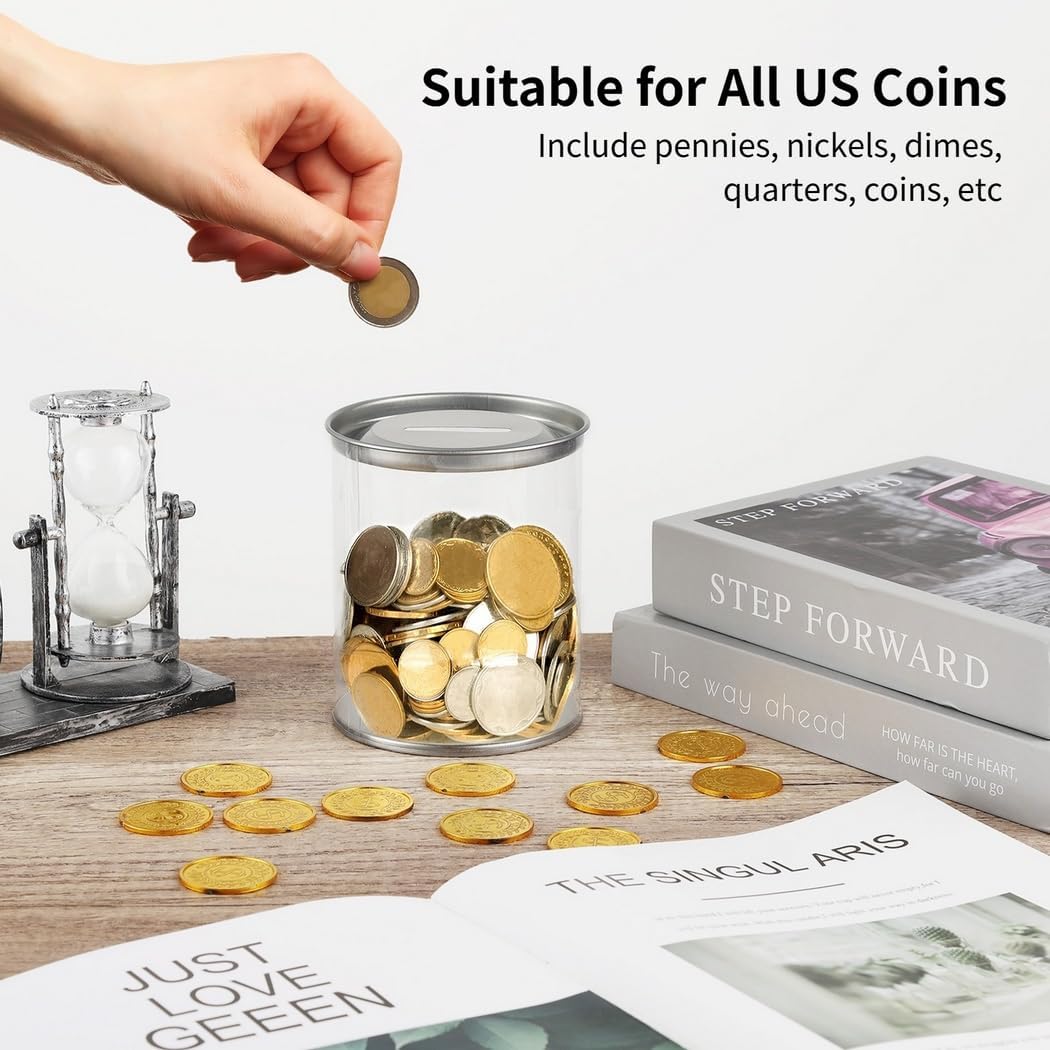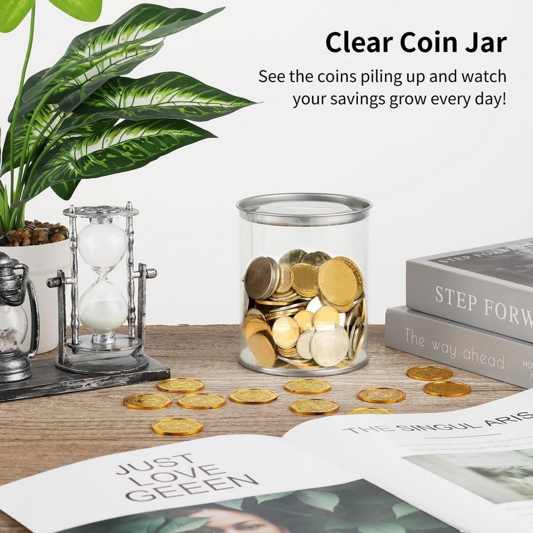 Quattro barattoli di plastica: ordina un set di quattro barattoli salvadanaio realizzati in plastica per organizzare il tuo cambio di ricambio; con il pacchetto valore, distribuisci i barattoli in tutti gli spazi; dimensioni di ogni barattolo di monete: 10 x 12 cm (lunghezza x larghezza); spazio sufficiente per riporre oggetti Compatibile con tutti noi: lo slot per monete misura 4 cm x 0,5 cm (lunghezza x larghezza); progettato per contenere tutti noi; il coperchio presenta un'apertura per monete, quindi aggiungere è facile Design trasparente: la struttura trasparente del barattolo di plastica garantisce la capacità di supervisionare senza sforzo l'avanzamento del risparmio; l'orologio si accumula, incoraggiando il risparmio continuo e il raggiungimento degli obiettivi finanziari Rimozione delle monete senza sforzo: i barattoli per cambio hanno un design facile del coperchio; accesso senza problemi semplicemente sollevando per aprirlo Ampio utilizzo: i barattoli di plastica funzionano perfettamente per risparmiare denaro di ricambio; possono anche essere utilizzati come contenitori per accessori, come bottoni, gioielli o forniture artigianali