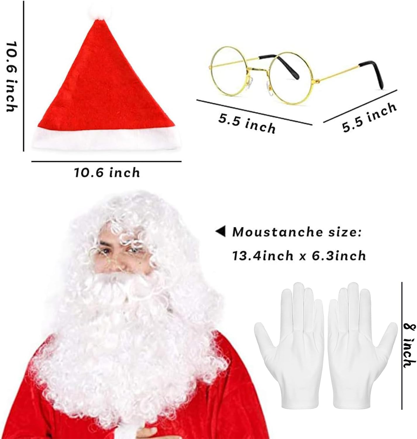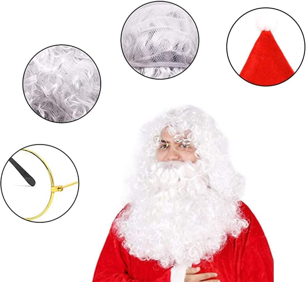 🎅【Accessorii Babbo Natale】Riceverete 1 barba da Babbo Natale, 1 parrucca da Babbo Natale, 1 cappello da Babbo Natale, 1 paio di occhiali da Babbo Natale e 1 paio di guanti da Babbo Natale. Questi accessori possono essere abbinati a qualsiasi costume da Babbo Natale per trasformarvi in un simpatico Babbo Natale. 🎄【Barba e Capelli Babbo Natale】La barba e la parrucca di Babbo Natale sono realizzate in fibre sintetiche facili da pettinare e che non si aggrovigliano. La barba di Babbo Natale è dotata di cinghie elastiche su entrambi i lati, che la rendono facile da indossare; la parrucca di Babbo Natale è dotata di una copertura in rete traspirante che è stabile e non cade. 🎅【Forma Perfetta di Babbo Natale】Per creare un perfetto look da Babbo Natale, è essenziale il classico cappello natalizio, simbolo della stagione delle feste, e i guanti e gli occhiali con montatura metallica retrò e minimalista, che renderanno il vostro look da Babbo Natale professionale e sofisticato. 🎄【Occasioni Multiple】Il set di accessori di Babbo Natale è adatto a varie occasioni, come riunioni di famiglia, sfilate, spettacoli teatrali, accessori fotografici e cosplay. Utilizzatelo per aggiungere l'atmosfera natalizia e godetevi il divertimento del cosplay. 🎅【Dimensione Universale】Il set di accessori di Babbo Natale può essere regolato nelle dimensioni, adatto alla maggior parte delle persone. Indossarlo a lungo non appesantisce il corpo.