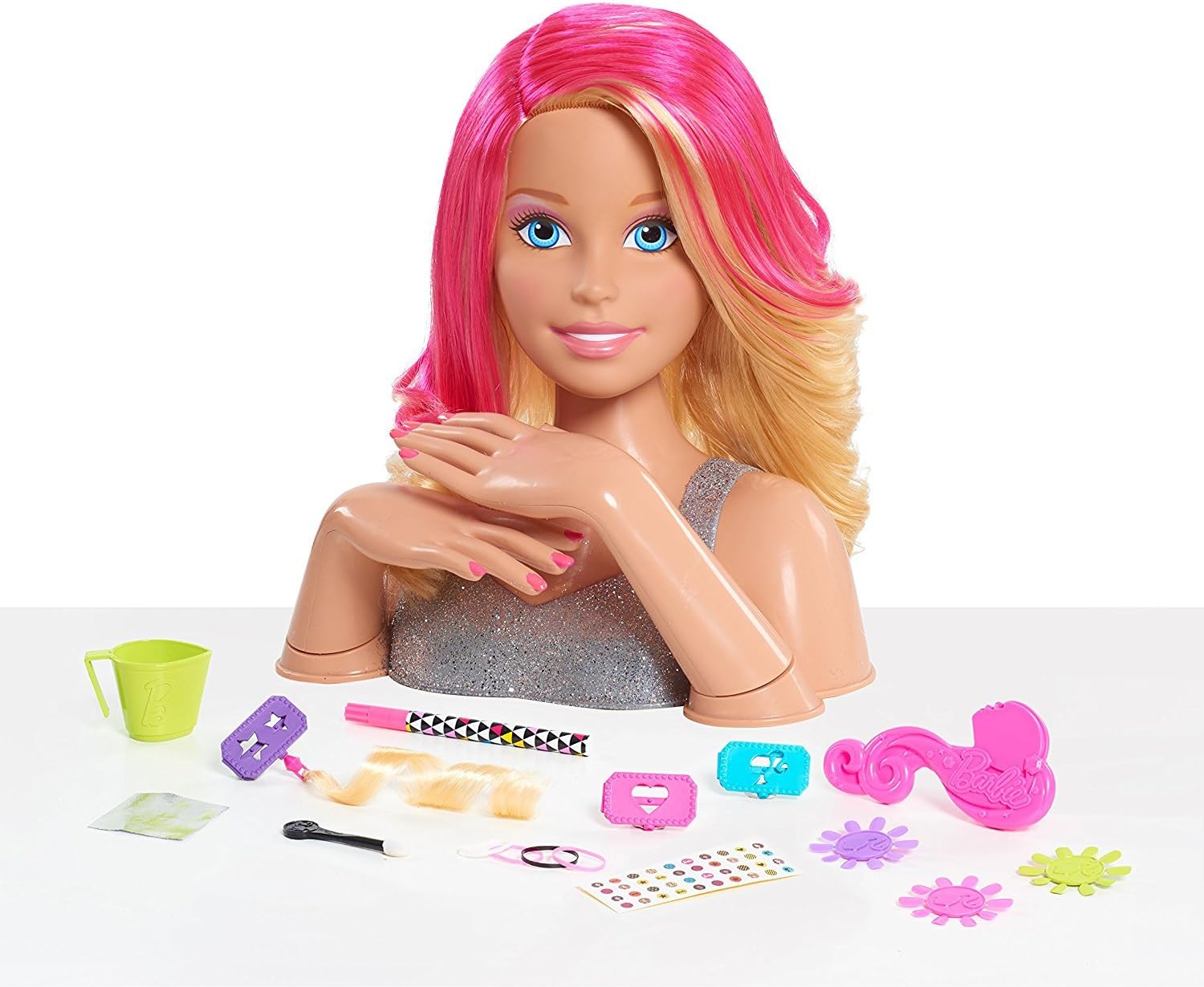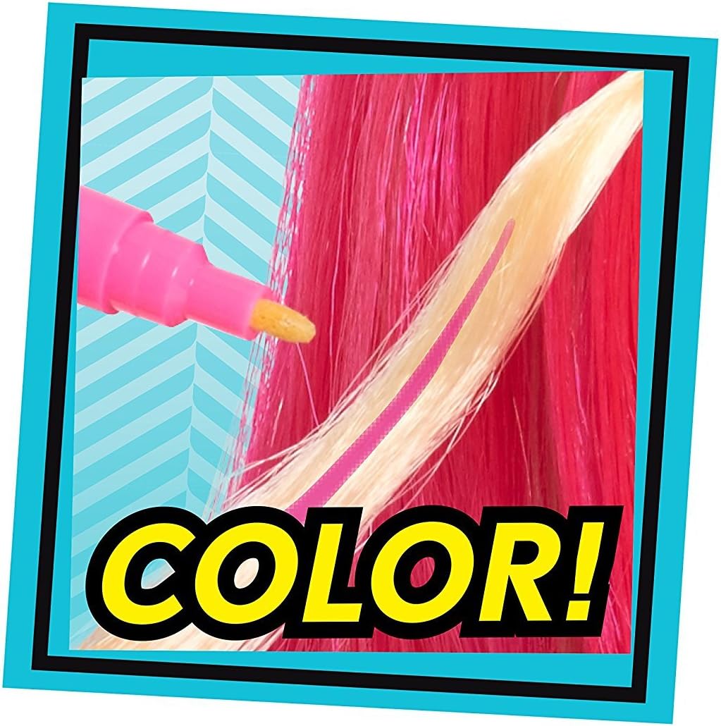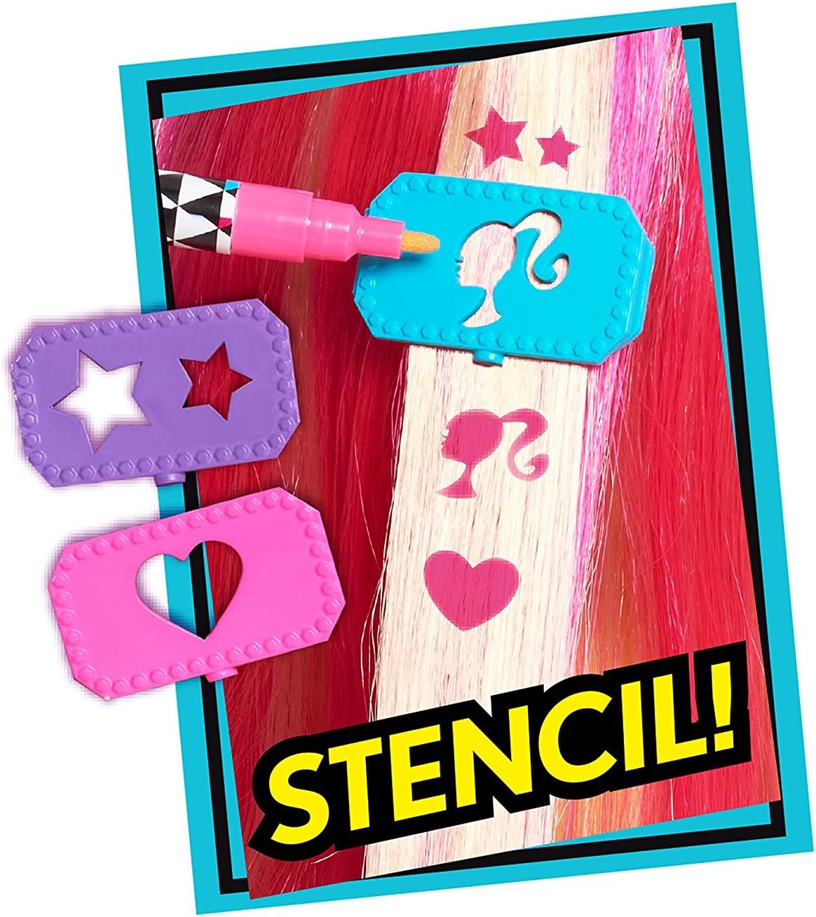 Ora puoi acconciare e colorare i capelli di Barbie e creare qualsiasi look tu possa immaginare! Cambia il look di Barbie da biondo a rosa quando hai i capelli di Barbie per rivivere le bellissime tonalità di rosa brillante. Crea acconciature professionali utilizzando lo stencil, la penna a gesso e l'applicatore a pennello. Barbie ha unghie che cambiano colore e trucco per il massimo make-up.