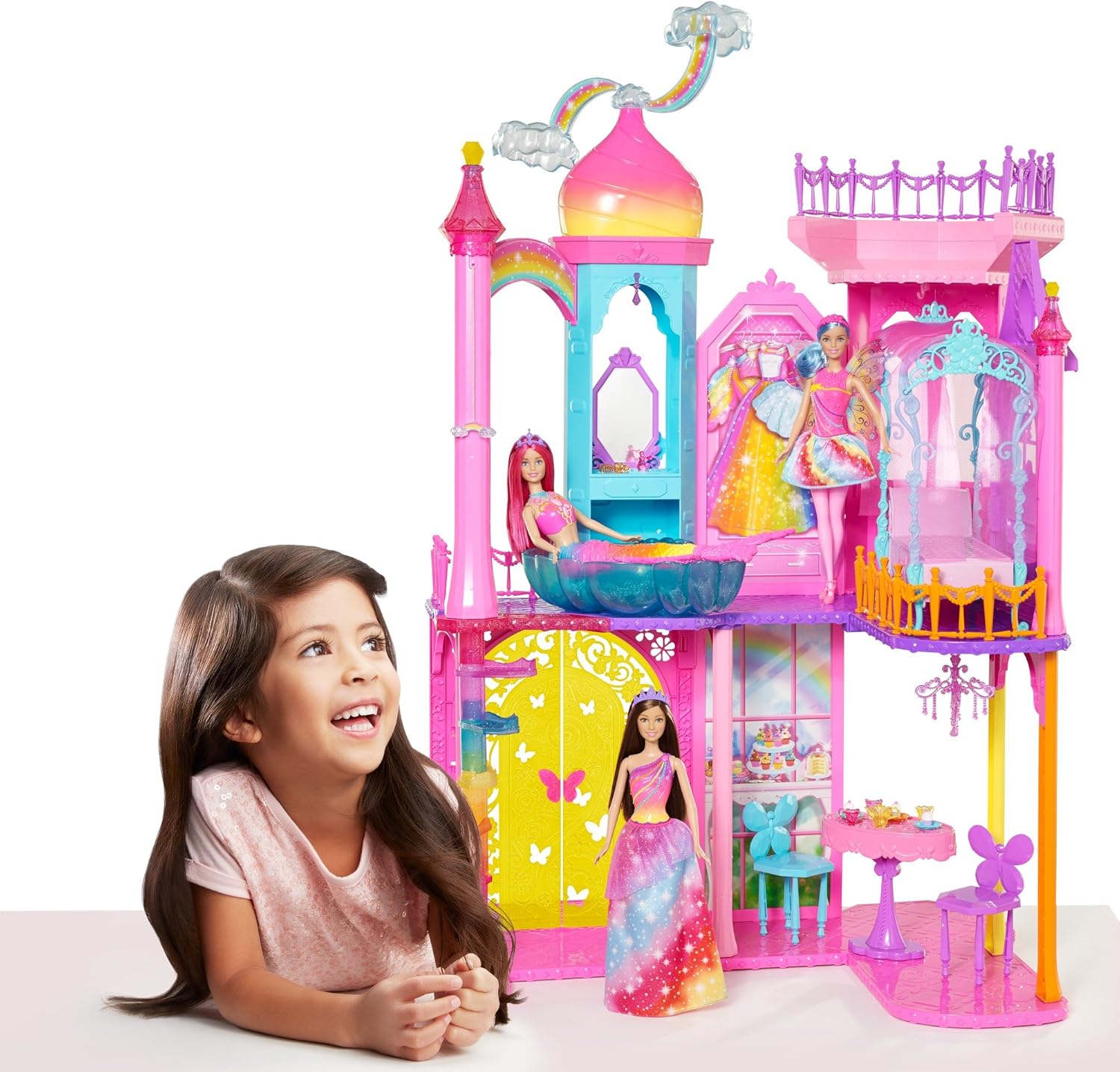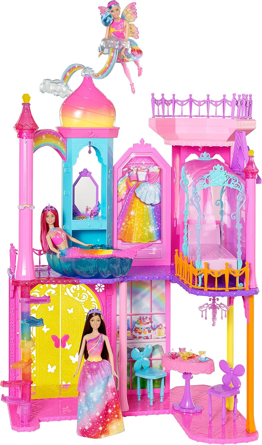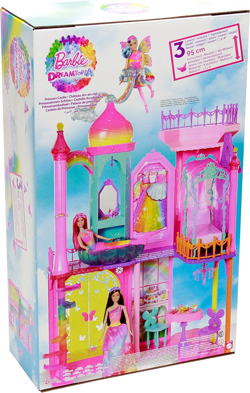 I colori accesi dell'arcobaleno sono stati depositati sul castello composto da sei aree gioco, accessori, mobili e gradini che conducono dallo spogliatoio alla camera da letto. Il castello è compatibile con la gamma di bambole Fairy Tale. Nota: nessuna bambola inclusa. Età: 3-12 anni