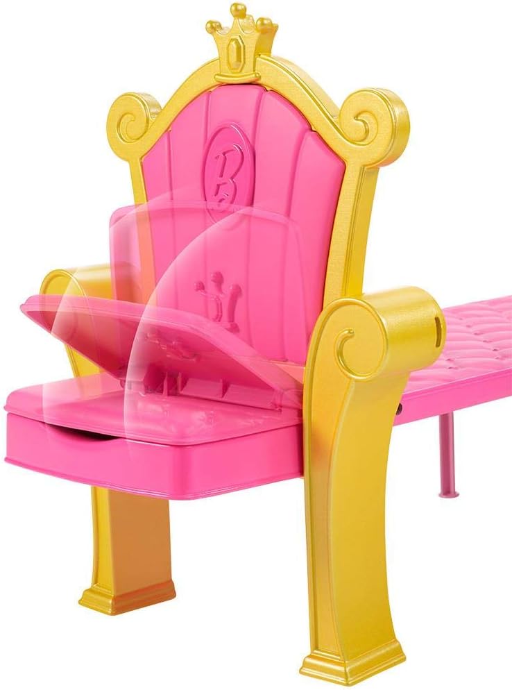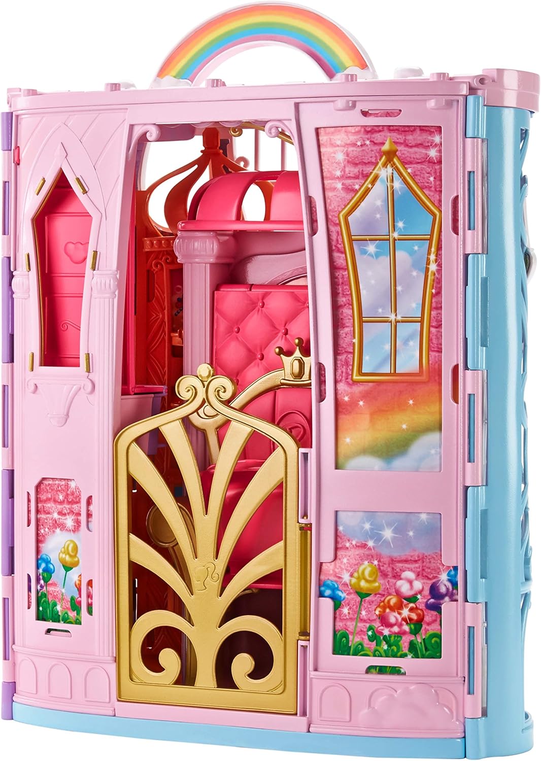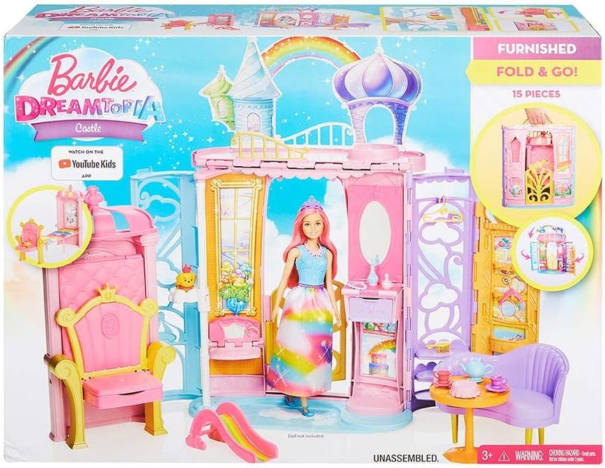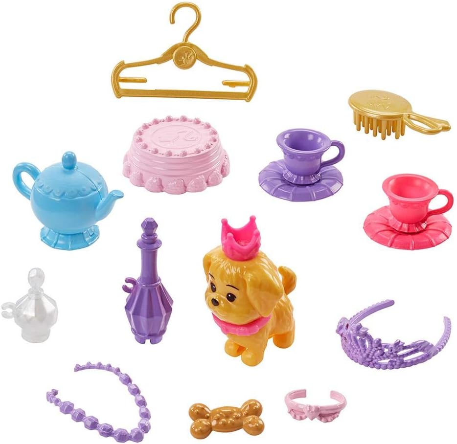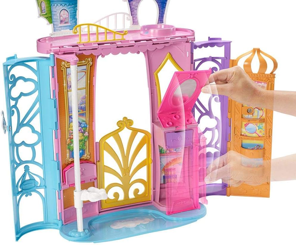 Un castello da portare con te grazie alla sua graziosa maniglia arcobaleno. Contiene 15 accessori e tante sorprese per la cagnolina Honey (inclusa) e per Barbie (venduta separatamente). Si apre e si chiude in una valigia per un facile trasporto.