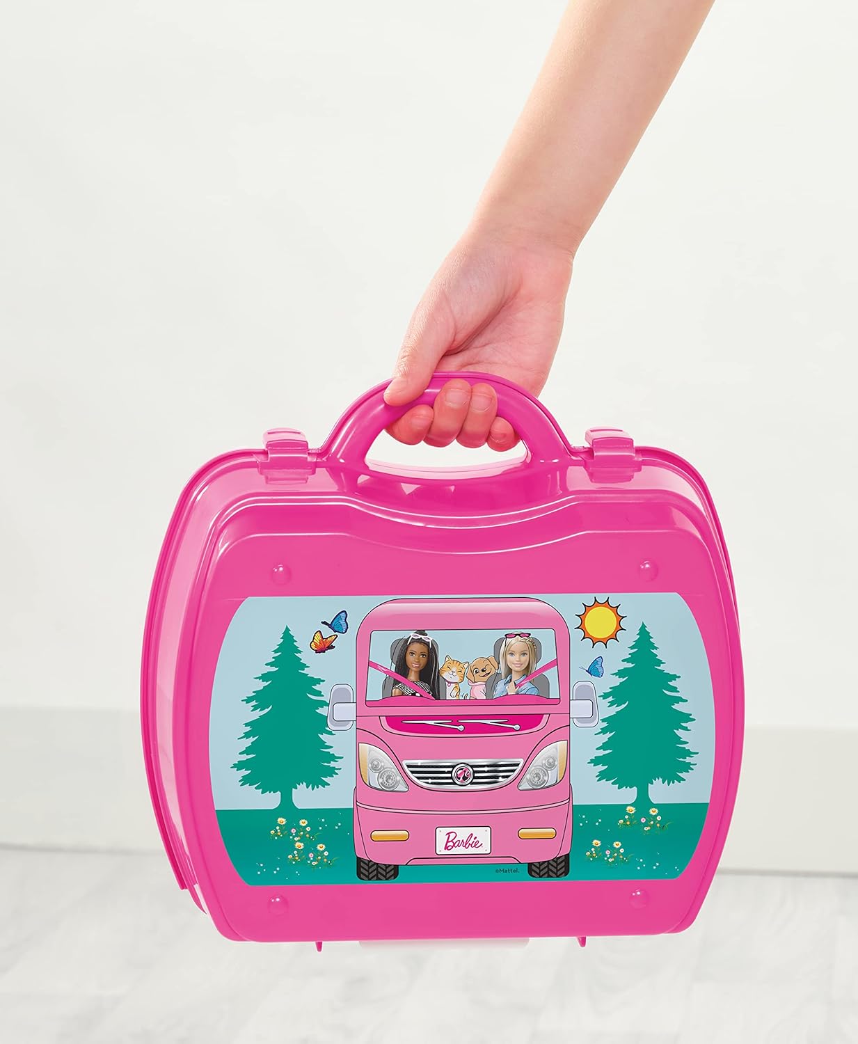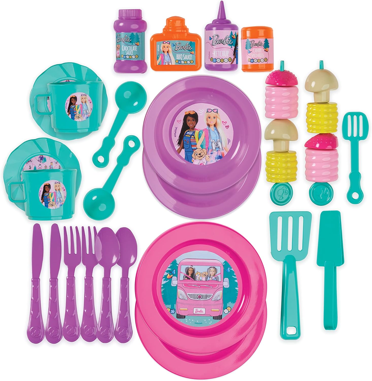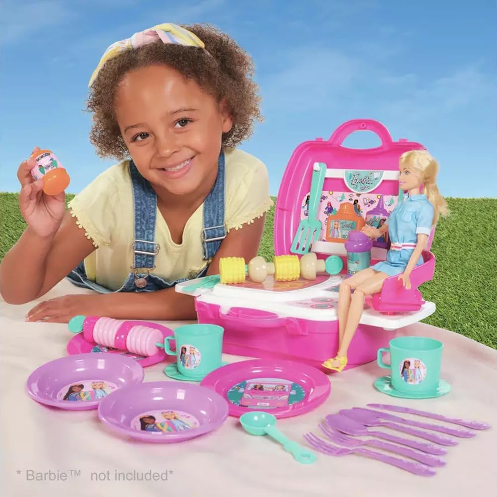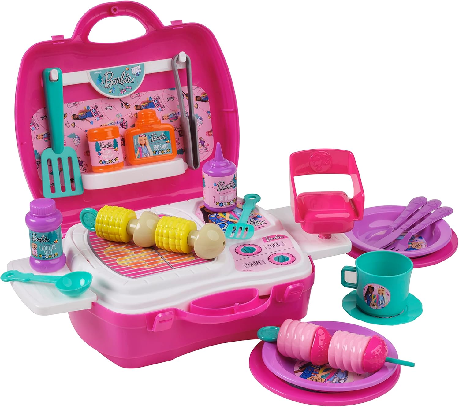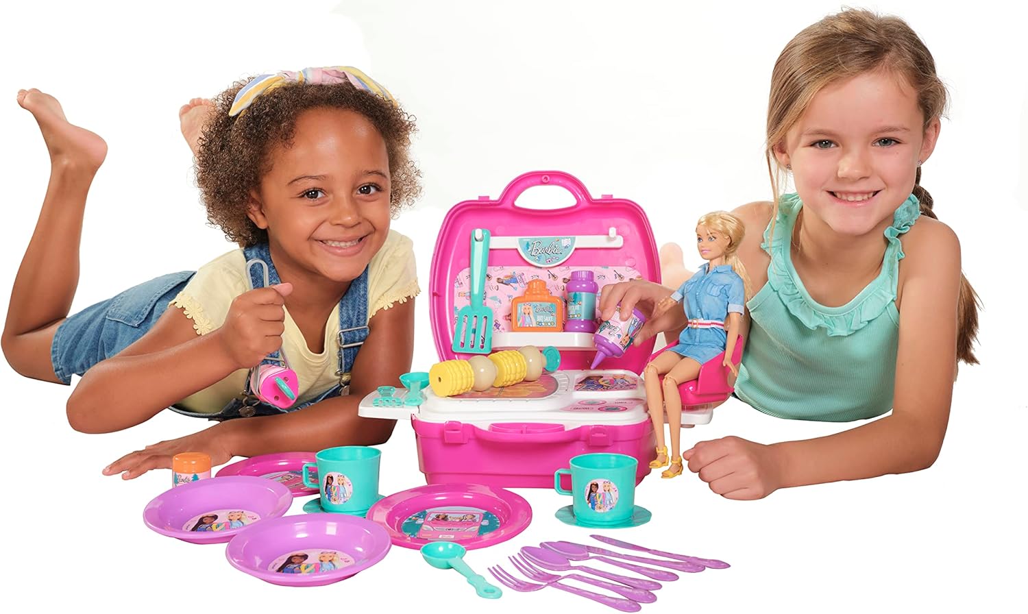 Invita la tua Barbie a divertirsi creando un barbecue a tema Barbie con il nostro playset Barbie Glamping. Questo playset Barbie viene fornito confezionato in questa pratica custodia da viaggio. Perfetto per giocare in movimento per te e la tua Barbie Questo bellissimo set deluxe fa parte di un'affascinante collezione di giochi di ruolo di Barbie Include oltre 20 pezzi per divertimento, tra cui un barbecue per giochi di ruolo, 2 spiedini di cibo, 2 tazze e piattini, 4 piatti, 4 bottiglie di salsa, cucchiai, spatola, pinze e 2 set di posate e persino una sedia su cui Barbie può sedersi. Questo set è ideale per aumentare l'immaginazione, permettendo al tuo bambino di trascorrere i momenti più glamour, glamping e fare barbecue mentre hanno la loro Barbie preferita con cui giocare. Il gioco di ruolo aiuta a migliorare l'immaginazione, le abilità sociali e linguistiche e la creatività dei bambini. Questo set da gioco Barbie è progettato per incoraggiare i bambini a usare la propria immaginazione ispirando giochi creativi con le loro bambole Barbie. Aggiungi ancora più varietà al loro gioco e alla narrazione, i bambini dai 3 ai 7 anni possono scoprire, esplorare e inventare tante storie emozionanti con il set da gioco Barbie Glamping e BBQ (bambola Barbie non inclusa)