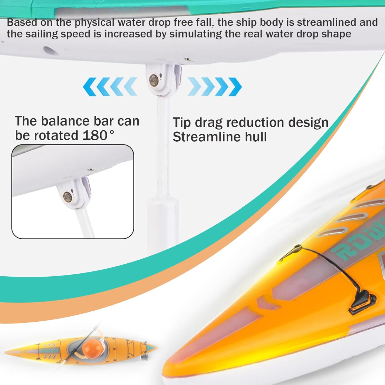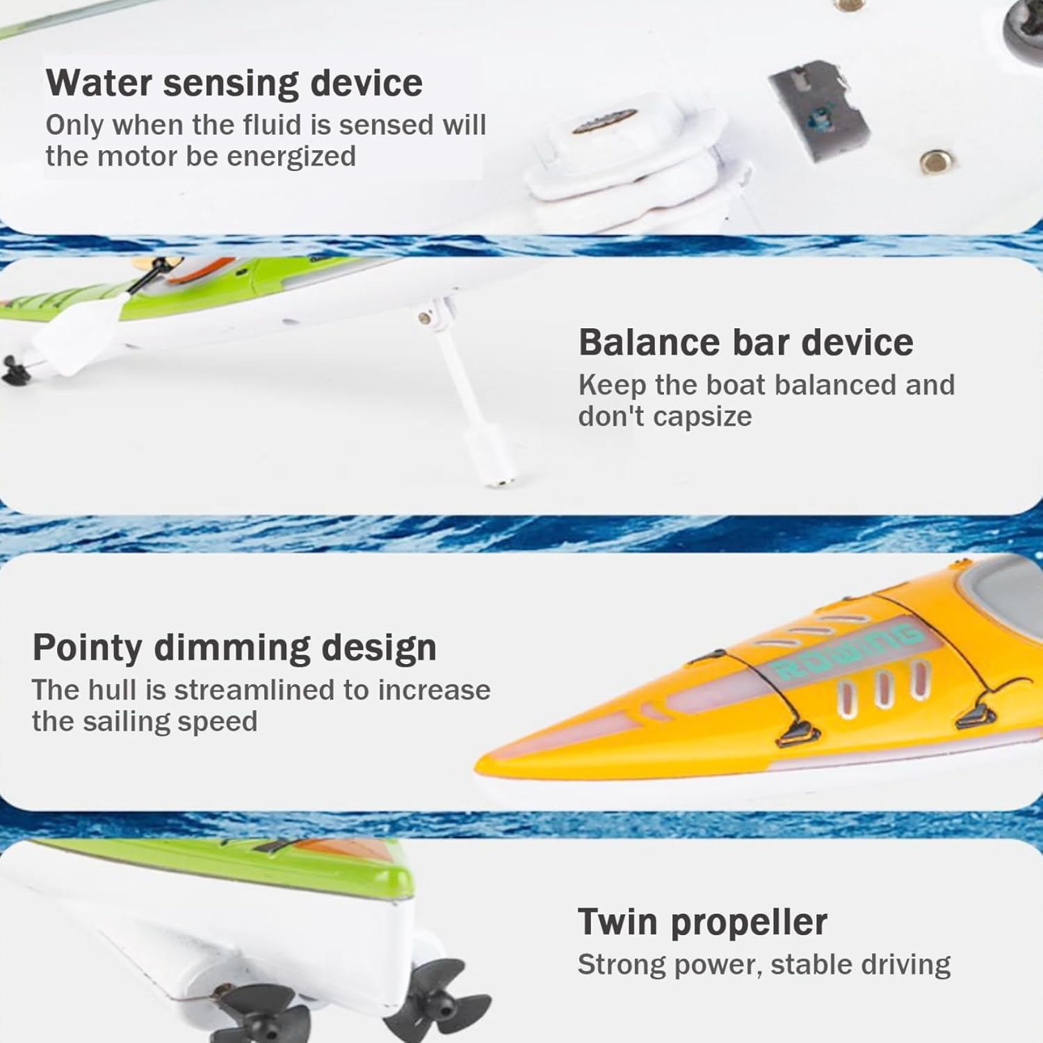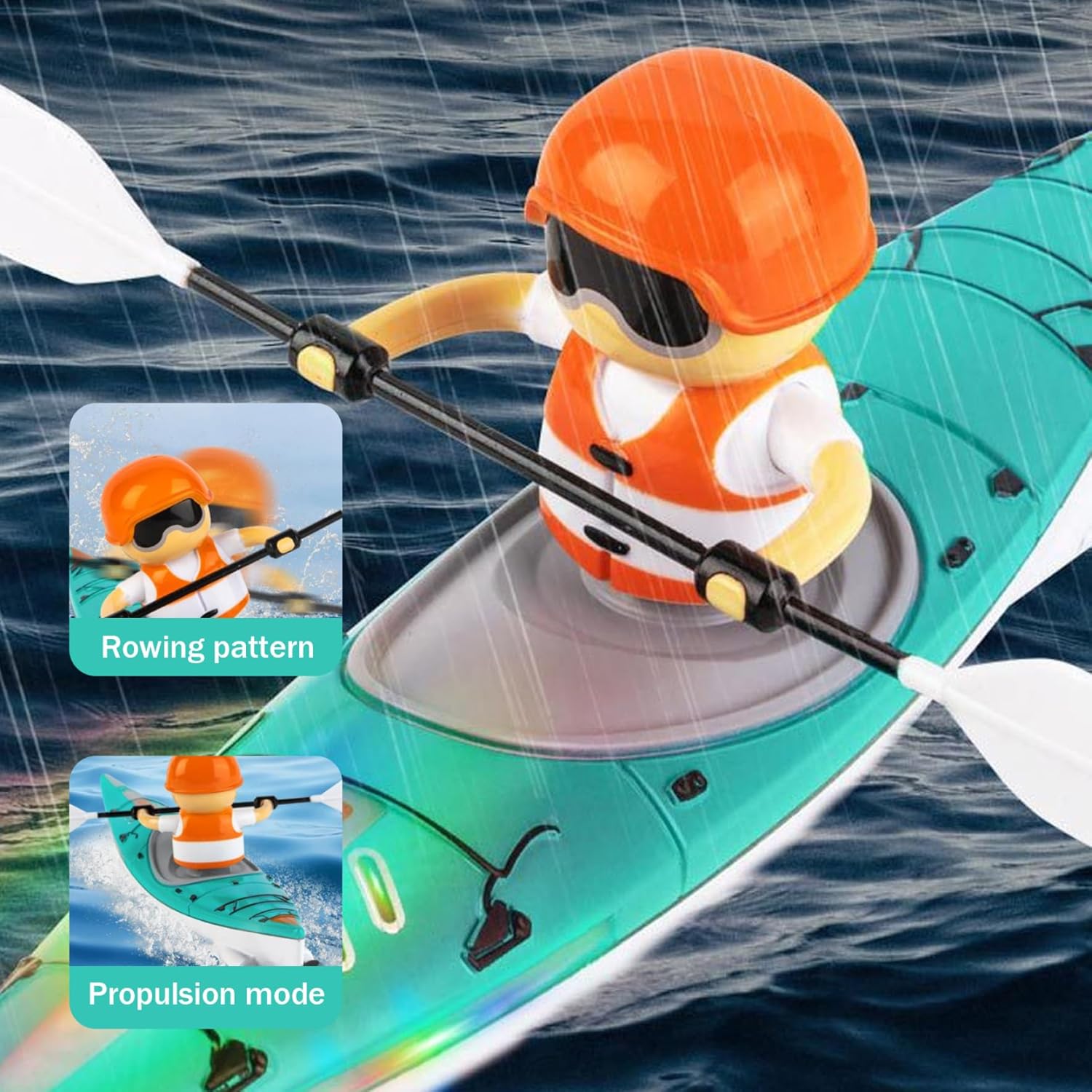 Modalità di guida doppia: la barca a telecomando offre sia modalità di remi e propulsione, con un telecomando ad alta frequenza a 2,4 GHz per il funzionamento a lunga distanza..La frequenza singola singola dispositivo non garantisce interferenze, consentendo un divertimento competitivo. Design unico: la nostra barca a telecomando presenta un design artistico dei graffiti combinato con un corpo aerodinamico per movimenti lisci sull'acqua..Le superfici con rivestimento UV sono resistenti all'abrasione e impermeabili..Le luci a LED offrono sicurezza e stile per la navigazione notturna, offrendo un'esperienza idrica unica. Sicurezza e durata della batteria: dotata di tecnologia di rilevamento dell'acqua intelligente, la barca ha un interruttore di induzione dell'acqua per la sicurezza..Utilizza batterie al litio ad alto tasso per carico rapido e potenza duratura, garantendo prestazioni forti. Regalo estivo ideale: le sue dimensioni compatte lo rendono adatto all'uso interno in vasca, piscine per bambini o vasche gonfiabili, rendendolo una scelta eccellente per l'intrattenimento estivo all'aperto..Perfetto per tutte le fasce d'età, funge da regalo per chiunque. Caratteristiche intuitive: con un palo di bilanciamento per la stabilità e il design anti-tocco, i genitori possono essere sicuri mentre i bambini si godono la barca..La singola leva di controllo rende facile per le persone di tutte le età gestire la barca, evidenziando la sua intuitiva.