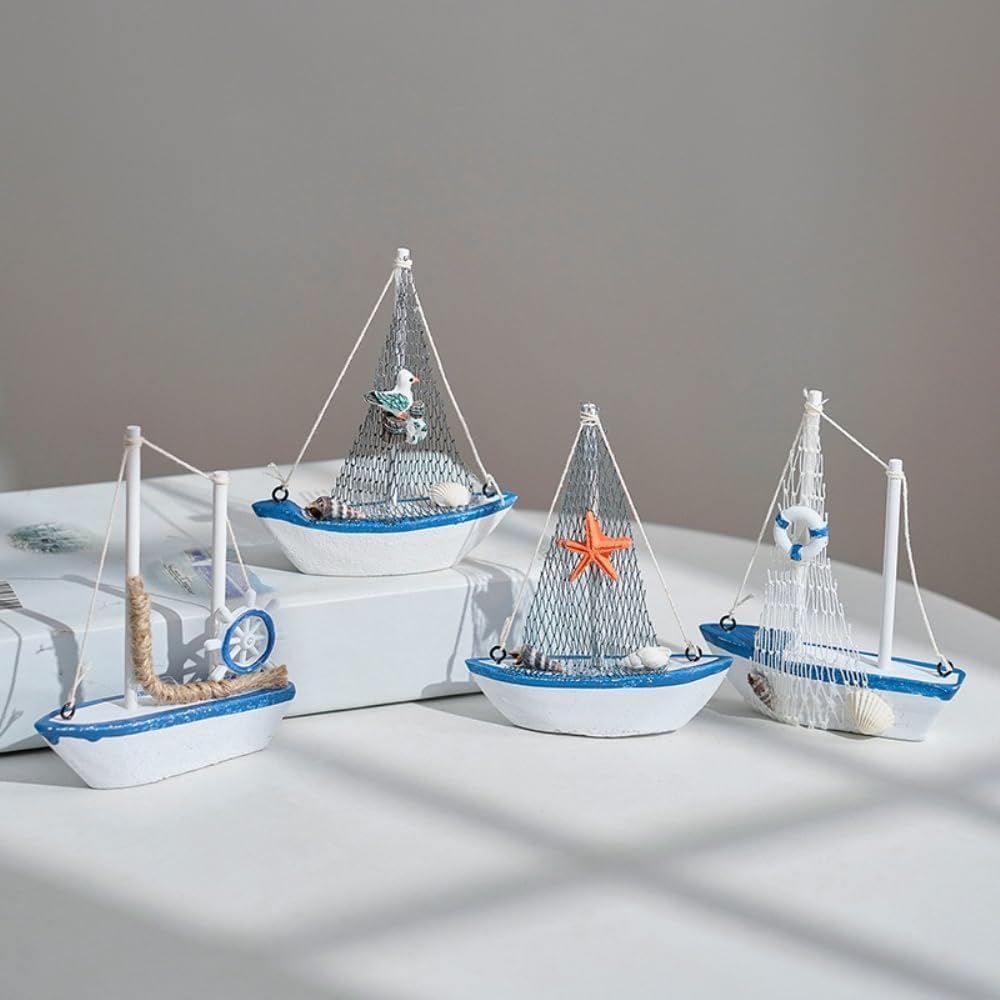 Barca a vela in legno, modello con rete da pesca, decorazione nautica, barca a vela, per ufficio, spiaggia, nautica, in miniatura, decorazione per la casa, blu e bianco C