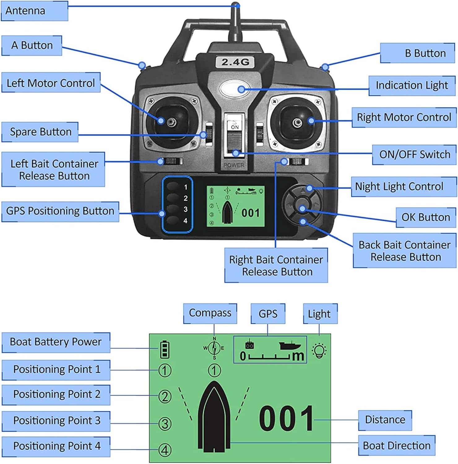 (Barca da pesca): la barca da pesca intelligente utilizza il sistema di posizionamento GPS per portare esche e ami per la pesca o posizionare esche nelle profondità del lago. Spesso porta sorprese inaspettate agli appassionati di pesca. È la scelta ideale per i pescatori. (Dettagli eccellenti): la barca da esca ha due motori e due eliche. Può navigare facilmente nel ricevitore del segnale del telecomando entro 500 metri. barca lontana di notte. (Contenitore per esche di grande capacità): la barca da mangiatoia è dotata di 3 contenitori per esche, nei quali è possibile caricare un totale di 2 kg di esche. Il telecomando può controllare in modo indipendente l'apertura del contenitore dell'esca. Molti pesci vengono attratti posizionando l'esca. nel lago. Inoltre, il gancio può essere appeso ai contenitori delle esche per evitarne la caduta. (Batteria al litio ad alte prestazioni): la barca a motore è alimentata da una batteria da 5200 mAh. Può essere caricato separatamente ed è facile da installare. Dopo ogni carica completa, la barca da esca può essere utilizzata per circa 2-3 ore, il che è molto adatto per le carpe.
