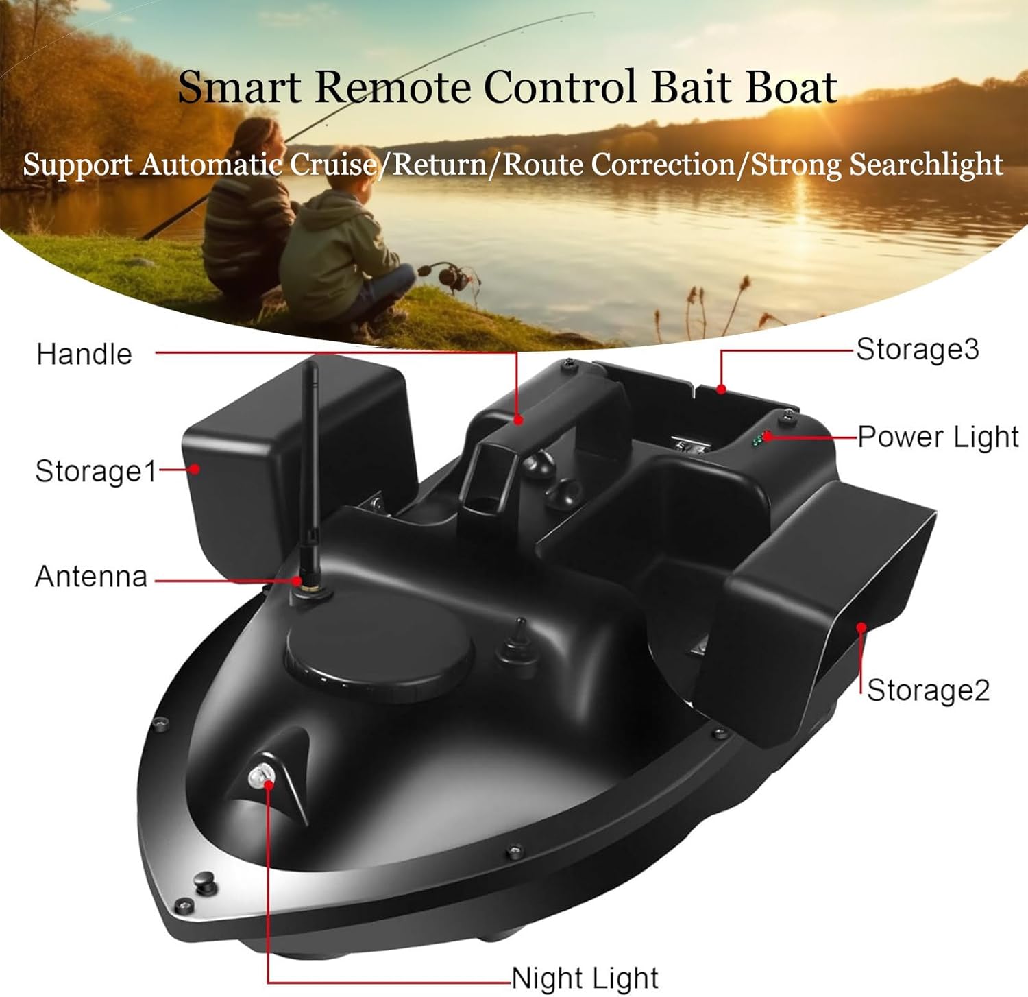 Telecomando 2.4G: segnale anti-interferenza potenziato a 500M. Distanza di posizionamento del telecomando fino a 500 metri senza interferenze. Display LCD: visualizzazione della potenza, della distanza, della posizione, dell'illuminazione notturna e della direzione. Lo schermo LCD del telecomando visualizza i dati relativi alla potenza, alla bussola e alla velocità di navigazione dell'imbarcazione. Cruise Control: basta un clic per attivare il sistema di cruise control e mantenere l'imbarcazione a una velocità costante e in linea retta, risparmiando tempo e fatica e liberando le mani. Crociera a punto fisso: sistema di posizionamento satellitare doppio Beidou/GPS, è possibile impostare 40 punti di posizionamento, a partire dal punto di partenza, per ottenere una crociera automatica verso la destinazione. Contenitore per esche di grande capacità: dotato di un contenitore per esche di grande capacità, con una capacità di carico di circa 2 kg/4,4 libbre, è possibile controllare a piacimento il punto di nidificazione fisso. Il contenitore posteriore è dotato di un design anti-sgancio, che consente di inviare l'amo e rilasciare la lenza per evitare che la lenza si arrotoli.