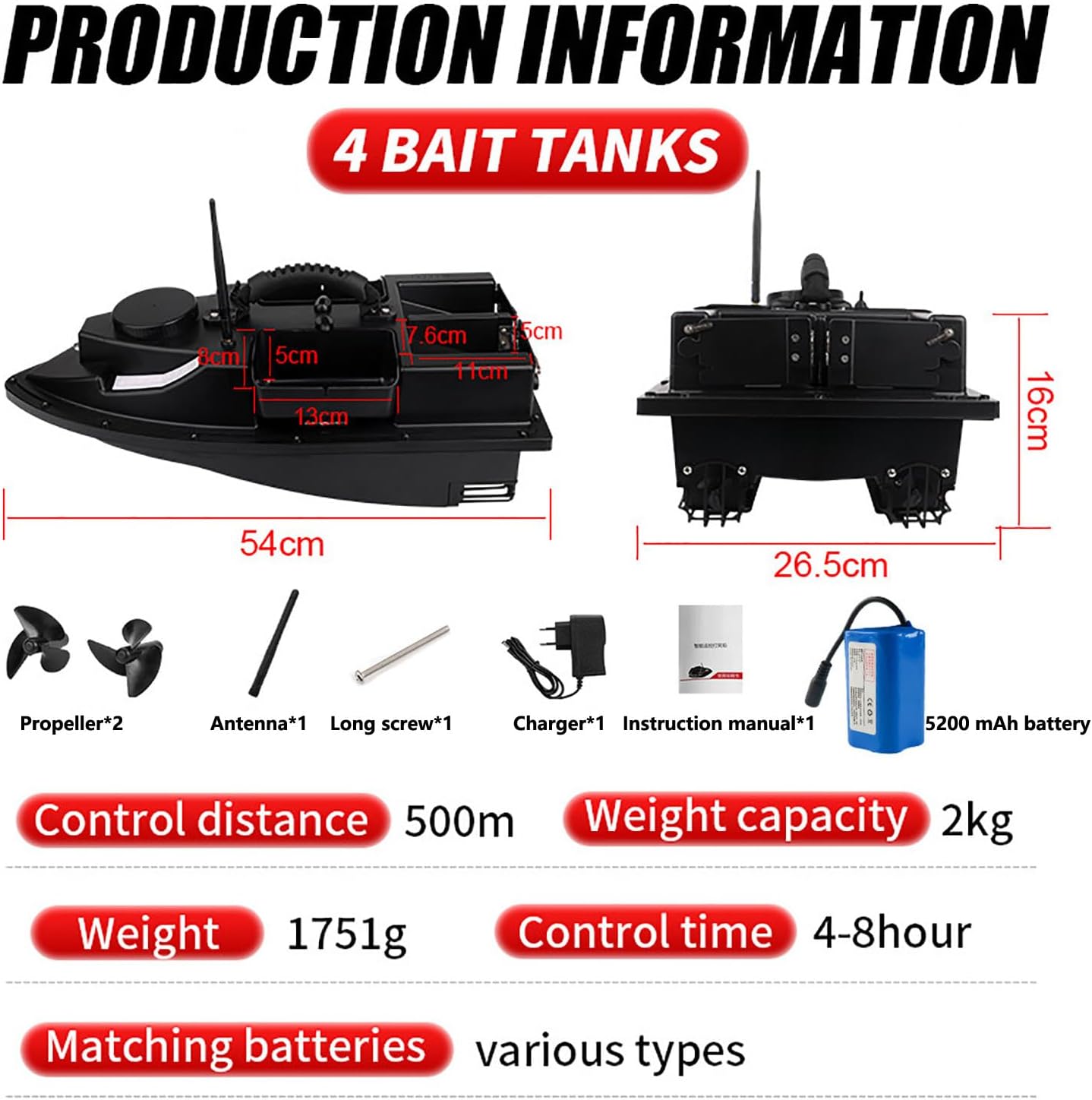 1. 【Barca da pesca con esche e 4 tramogge di alimentazione con GPS】Migliora la tua esperienza di pesca con questa barca da pesca con esche intelligente con telecomando GPS. Con funzioni come il ritorno automatico a casa, 100 punti di posizionamento GPS e 7 luci colorate, questa barca è perfetta per la pesca notturna. 2. 【Rilascio esche senza sforzo】Le 4 tramogge di alimentazione possono essere azionate separatamente e possono caricare circa 2 kg di esche e ami. Il telecomando impermeabile e la correzione automatica dell'imbardata rendono la navigazione un gioco da ragazzi. Che tu sia un principiante o un pescatore esperto, questa barca da pesca con esche è un must per il tuo arsenale. 3. 【Posizionamento GPS】: 100 punti di posizionamento GPS. Telecomando a lunga distanza di 500 metri. Avviso di batteria scarica/ritorno automatico durante la navigazione: quando la batteria della barca è scarica e la distanza del telecomando supera i 500 metri, la barca tornerà automaticamente al punto di partenza. 4. 【Pronto per la pesca notturna】 7 colori di luci regolabili. Goditi la pesca notturna con facilità utilizzando le luci colorate per la navigazione. Aumenta le tue possibilità di una cattura di successo con le funzioni intelligenti di questa barca radiocomandata. Lo schermo LCD impermeabile mostra la distanza dalla nave, la carica della batteria, la luce notturna, il display dei tasti di posizione, il display di ritorno a 1 tasto e così via. 5. 【Batteria a lunga durata】 Con 2 batterie rimovibili ad alta capacità da 7,4 V 25000 mAH, batteria super duratura, tempo di ricarica di 8-10 ore, 1 batteria può essere utilizzata per circa 6-8 ore. Ve-nto forte e design a doppio motore, funzione impermeabile. Combatti per onde e tempeste di 5-6 livelli.