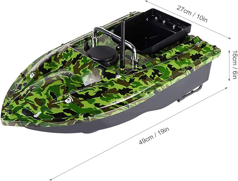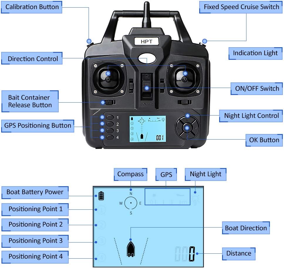 La funzione GPS consente di impostare 4 punti di posizionamento arbitrari e l'imbarcazione può andare avanti e indietro in base al punto impostato. In caso di perdita del segnale o di batteria scarica, l'imbarcazione tornerà automaticamente all'origine dopo 15 secondi. Non preoccuparti di perdere il segnale. Il display LCD del telecomando visualizzerà numerosi dati, come la carica della batteria, la distanza, la bussola, la posizione e la luce. Grandi contenitori per esche con una capacità di circa 3,3 libbre per contenere più esche. Controllo wireless e interruttore di velocità fissa consentono di rilasciare l'esca a lunga distanza. (Portata del telecomando: 500 metri)
