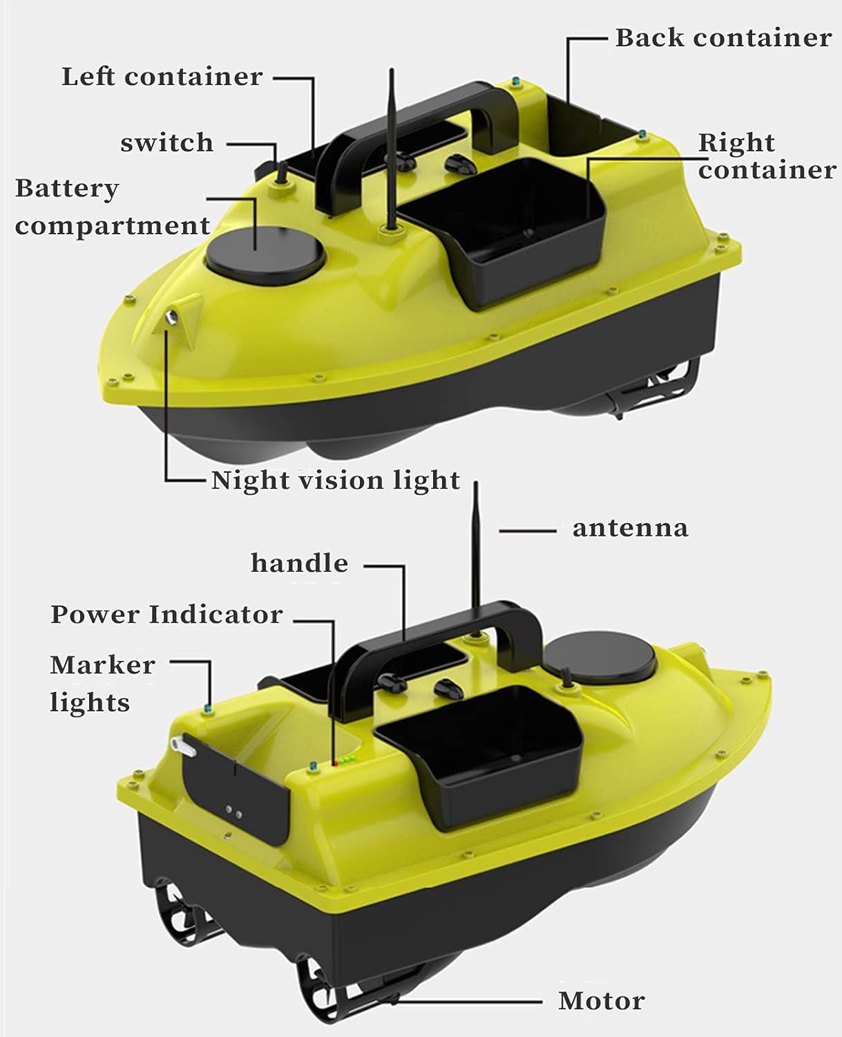 differenza di altre barche per esche da pesca, la nostra barca per esche da pesca ha tre contenitori per esche da pesca controllati in modo indipendente, che possono essere azionati in modo indipendente e trasportare più tipi di esche contemporaneamente, con un carico di circa 2 kg Versione GPS aggiornata del telecomando a due mani, telecomando da 400-500 m, nessuna interferenza e segnale migliorato, fondo del telecomando con schermo LCD, distanza, direzione, posizionamento, potenza e luci saranno chiaramente visualizzati sullo schermo Per farti sentire più a tuo agio durante l'utilizzo Il corpo principale dello scafo della barca da pesca RC è realizzato in ABS di alta qualità, con un design completamente chiuso. Lo scafo è ampio, il centro è stabile e non si capovolge facilmente. Può essere utilizzato in vari tipi di acque, come laghi o mari. Il nostro Fish Finder da esterno 1Outdoor è dotato di una funzione di controllo intelligente della velocità di crociera, che verifica automaticamente i cambi di direzione. Quando la batteria è troppo scarica o il segnale è disconnesso, il dispositivo torna sulla stessa rotta, evitando fermate dovute a mancanza di corrente durante il tragitto. Inoltre, offre funzioni come l'accesso diretto e il ritorno a 1 tasto, comodi da usare e che non richiedono la preoccupazione di perdersi. Servizio: Se hai domande su questo prodotto, non esitare a contattarci, ti risponderemo entro 24 ore!
