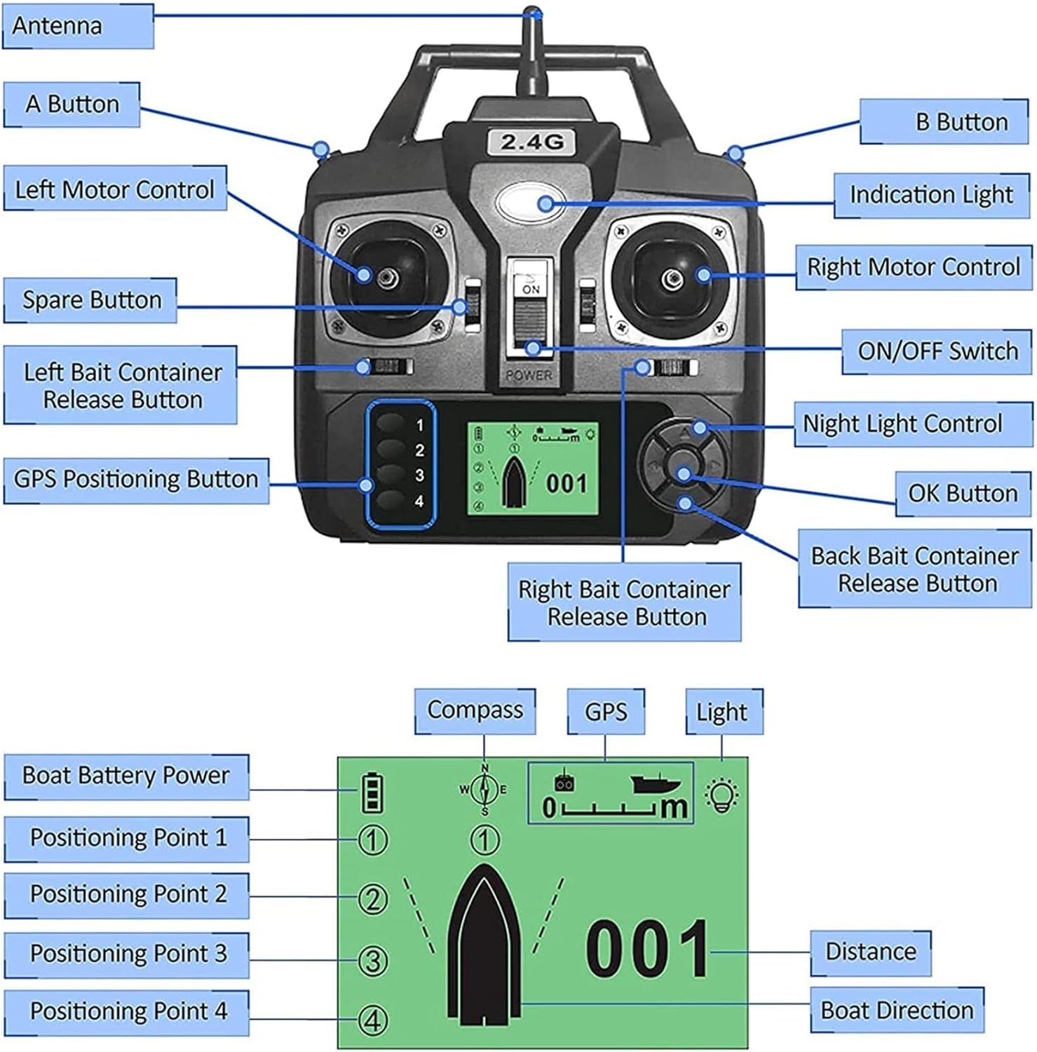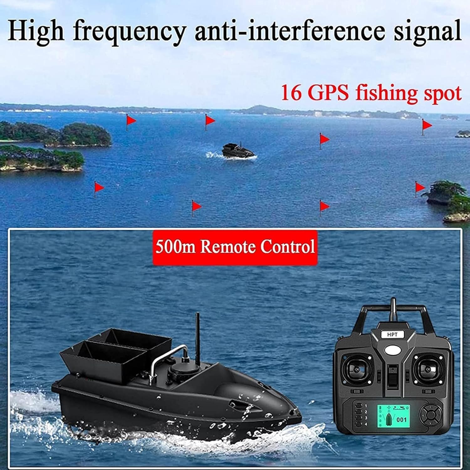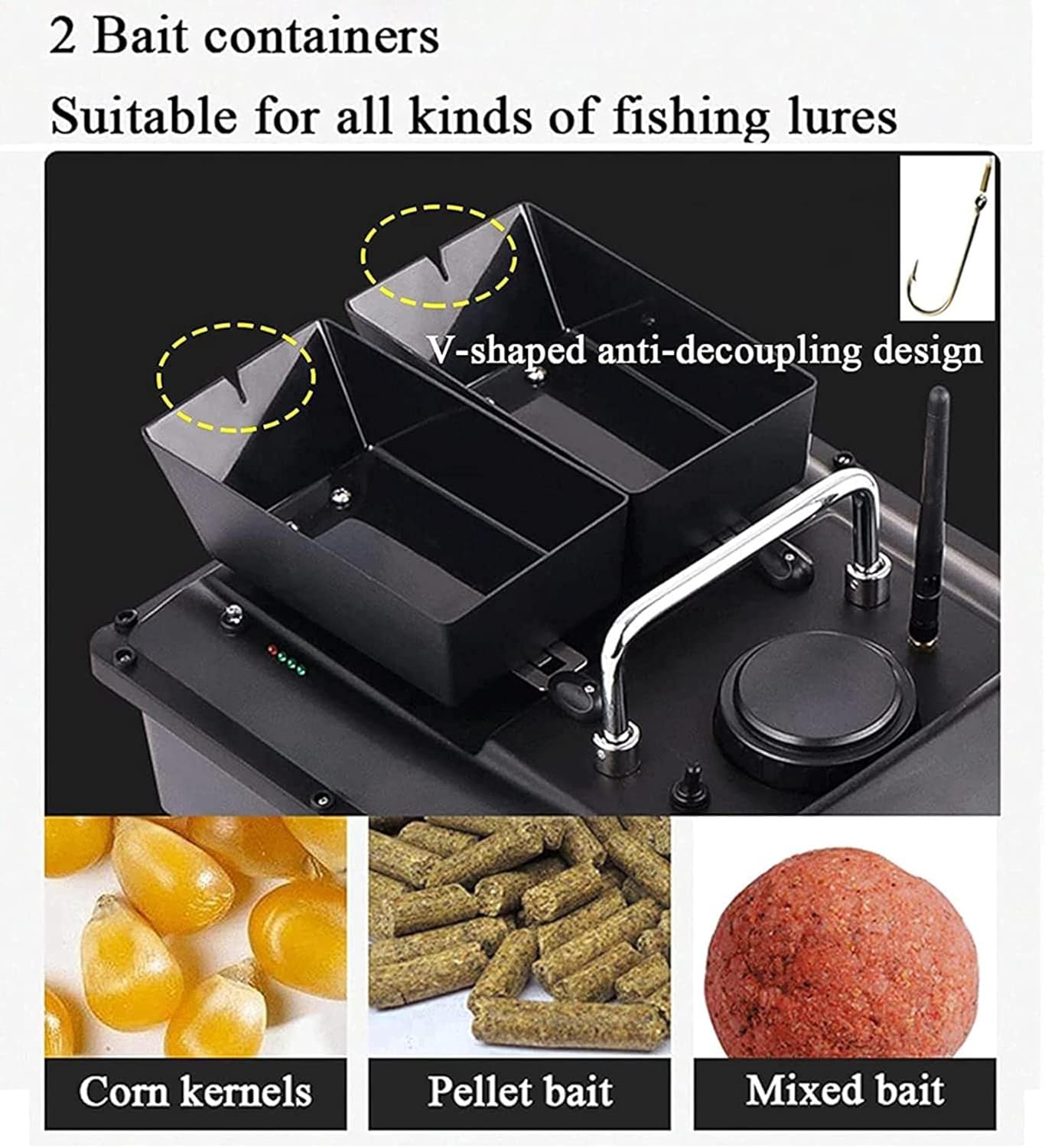 (Controllo intelligente): la barca da pesca è dotata di un telecomando GPS, che può implementare diverse funzioni, come: marcatura di 16 punti di pesca; controllo a 360° della direzione della barca; crociera a velocità fissa e ritorno automatico; apertura indipendente del serbatoio dell'esca; luci LED di controllo, ecc. È possibile visualizzare il supporto della batteria della barca da pesca, la bussola e la distanza percorsa dalla barca tramite lo schermo LCD del telecomando. (Rilevamento della distribuzione dei pesci): La nostra barca di alimentazione è dotata di un fish finder intelligente, che con l'aiuto del posizionamento del sonar riconosce le condizioni e il contorno del suolo dell'acqua in tempo reale. Se la temperatura dell'acqua è indicata in ° C o ° F, i simboli dei pesci indicano, determina la posizione e la profondità dei pesci. La ricezione del segnale del fish finder è di 100 m e l'intervallo di profondità di misurazione: da 0,6 a 36 m. (Contenitore per esche di grande capacità): la barca per esche ha 2 contenitori per esche indipendenti che caricano 2 kg di esche e posizionano l'esca senza problemi in vari spazi di pesca, il che attrae un gran numero di pescatori per la raccolta. Migliora notevolmente il tasso di successo durante la pesca. Inoltre, la barca per mangimi può anche tirare una rete galleggiante con una lunghezza di 15 metri e una larghezza di 1 metro, il che è molto buono per i pescatori per la pesca (Adatto a diversi ambienti): la barca di alimentazione è dotata di due motori ed eliche a tre ali che offrono molta potenza per viaggi veloci, una forma monoblocco completamente chiusa e uno scafo anticollisione adatto a una varietà di acque. (Batteria al litio ad alte prestazioni): la barca di alimentazione è azionata da una batteria al litio da 12000 mAh. Può essere caricata separatamente ed è facile da installare. Dopo ogni carica completa, la batteria da 12000 mAh può essere utilizzata per circa 5-6 ore. Il rilevatore può essere caricato tramite USB. È possibile scegliere un altro numero di batterie di backup in base alle esigenze.