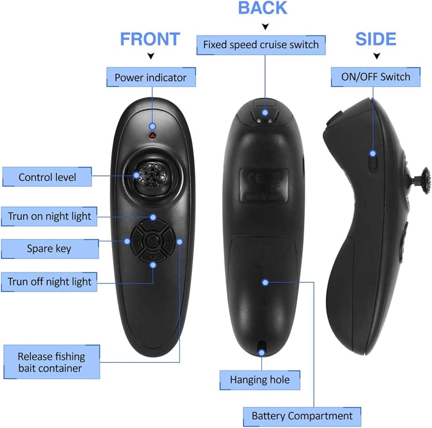 Materiale preferito: design dell'esca a tre stadi, input controllabile in modo indipendente per un'esca più precisa, scafo in ABS stampato a iniezione. Lo scafo è realizzato in ABS. Ha un'eccellente resistenza agli urti e all'abrasione, è facile da trasportare, è sigillato, sicuro, con protezione completa e batteria integrata, design anticollisione. Batteria al litio ad alte prestazioni: la batteria al litio ad alta capacità da 5200 mAh si ricarica più velocemente e ha una maggiore capacità. Posizionata al centro dello scafo, è più stabile. L'indicatore di batteria scarica impedisce efficacemente alla nave di percorrere una distanza eccessiva per tornare indietro. Il faretto a LED/telecomando può essere azionato con una o entrambe le mani/avviso di batteria scarica. Design robusto: il guscio del motore per carichi pesanti adotta un design a doppio motore, che funziona più velocemente e ha una capacità di carico di circa 2 kg. I due lati sono bilanciati per ottenere un buon equilibrio, stabilità e prestazioni migliori. Il design della copertura impermeabile può efficacemente impedire l'affondamento dell'elica. Funzione unica: calibrazione automatica di crociera/imbardata necessaria per gli ausili di pesca dei pescatori. Distanza di controllo remoto di 500 metri: quando il telecomando può essere collegato a 500 metri, il segnale del telecomando è più stabile. Non è più limitato dalla linea di produzione, ma gode della comodità offerta da una tecnologia illimitata. Il segnale è molto stabile. L'intera nave è stata impermeabilizzata, il che può prevenire efficacemente tutti i tipi di perdite d'acqua; può resistere a onde e tempeste di classe 5. Multifunzione: la barca esca telecomandata può muoversi avanti, indietro, a sinistra, a destra e con l'esca, grazie alle luci da pesca notturne, può essere facilmente controllata con una sola mano. La luce notturna adotta un design a luce blu intenso. Può localizzare e identificare la direzione durante il volo notturno e svolgerà un ruolo importante nell'attrarre i pesci.