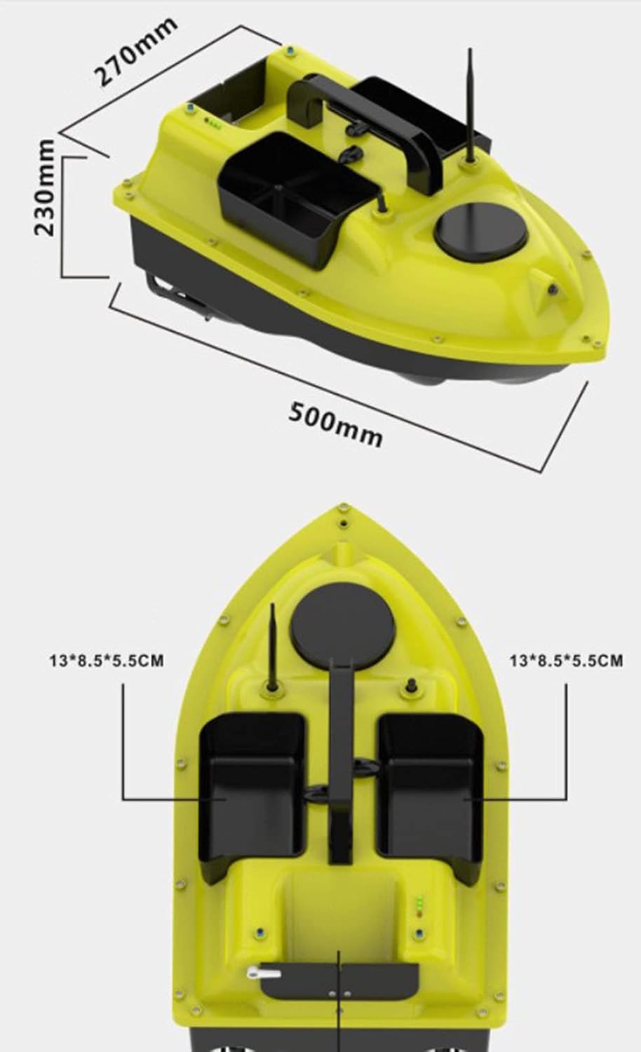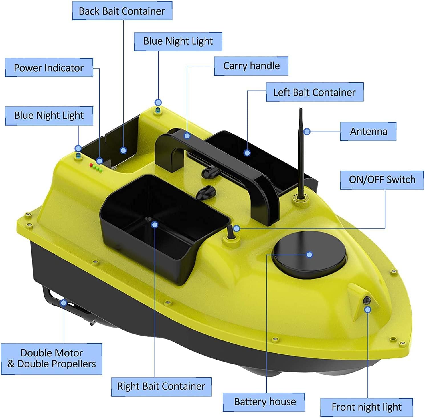 【Ricezione del segnale a 500 m】 In caso di interferenza del segnale, la distanza del telecomando è di 500 metri, puoi portare l'esca nel fitto banco di pesci, non preoccuparti del problema della scarsa distanza del telecomando. 【Funzionamento tramite telecomando】 Grazie alla funzione cruise control, è possibile impostare 3 punti di posizionamento. È possibile alternare i 3 punti secondo necessità. Dopo aver impostato l'origine, se il segnale viene disconnesso e la batteria è scarica, la nave tornerà automaticamente all'origine dopo 15 secondi. 【Controllo indipendente dell'esca】 3 contenitori per esche possono essere controllati indipendentemente e possono contenere esche diverse, evitando il rilascio una tantum di esche diverse e realizzando un rilascio multiuso. 【Design della luce di navigazione notturna】 Comodo da usare di notte o nelle giornate nuvolose, il design dell'illuminazione, il controllo a lunga distanza della luce anteriore e posteriore a due colori, determinano chiaramente la posizione della nave e forniscono un buon ambiente di illuminazione. 【Design monoblocco】 Il corpo principale della fusoliera è realizzato in guscio rigido in ABS, completamente chiuso, impermeabile e resistente all'umidità, forte resistenza al vento, baricentro stabile, non teme vento e onde.