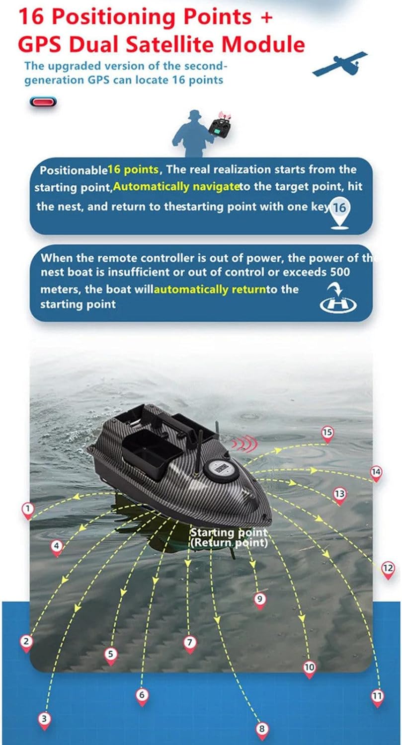 BARCA ESCA TELECOMANDATA MULTIFUNZIONALE: rispetto ai metodi di pesca tradizionali, la barca esca telecomandata è più precisa e veloce. Può portare esche e ami da pesca sul fondo del lago per pescare o posizionare esche 3 DESIGN DEL CONTENITORE PER ESCHE: i tre contenitori per esche della barca da pesca possono essere controllati in modo indipendente per evitare di posizionare esche diverse contemporaneamente e ottenere un posizionamento multi-punto. Sono inoltre dotati di slot per ganci per il posizionamento a punto fisso POTENZA POTENTE: motore potente a doppia alimentazione, tre pale efficiente, prova il piacere della pesca. L'uso silenzioso non disturberà i pesci e la crociera veloce assicura una pesca pazzesca LUCE PER LA PESCA NOTTURNA: la barca esca è dotata di una luce per la visione notturna, che può determinare chiaramente la posizione della barca da una lunga distanza, comoda per la pesca notturna e rende più preciso trovare i punti di pesca di notte IL NOSTRO SERVIZIO: le tue esigenze sono la nostra ricerca. Se hai domande sul prodotto, non esitare a contattarci. Ti risponderemo entro 24 ore. Ti risponderemo il prima possibile per risolvere il tuo problema