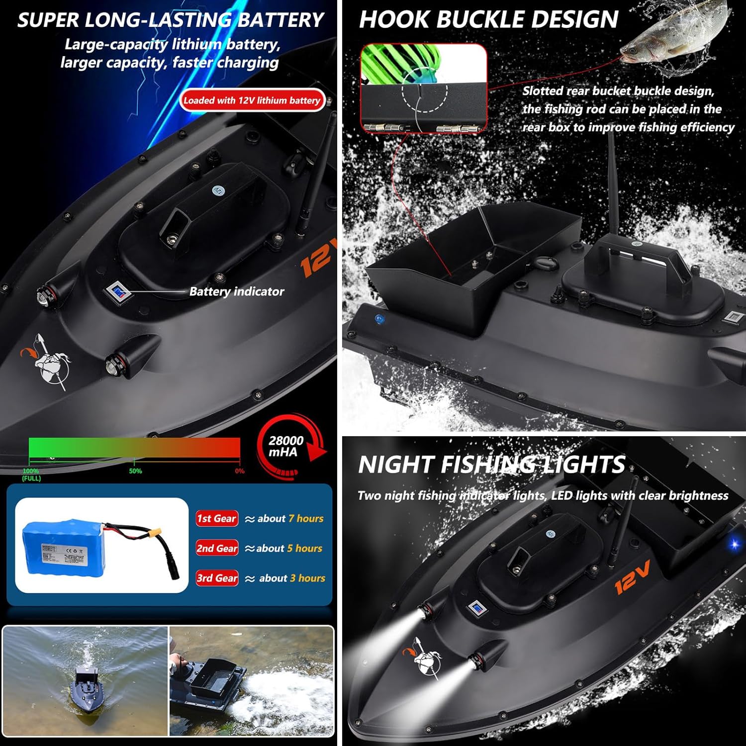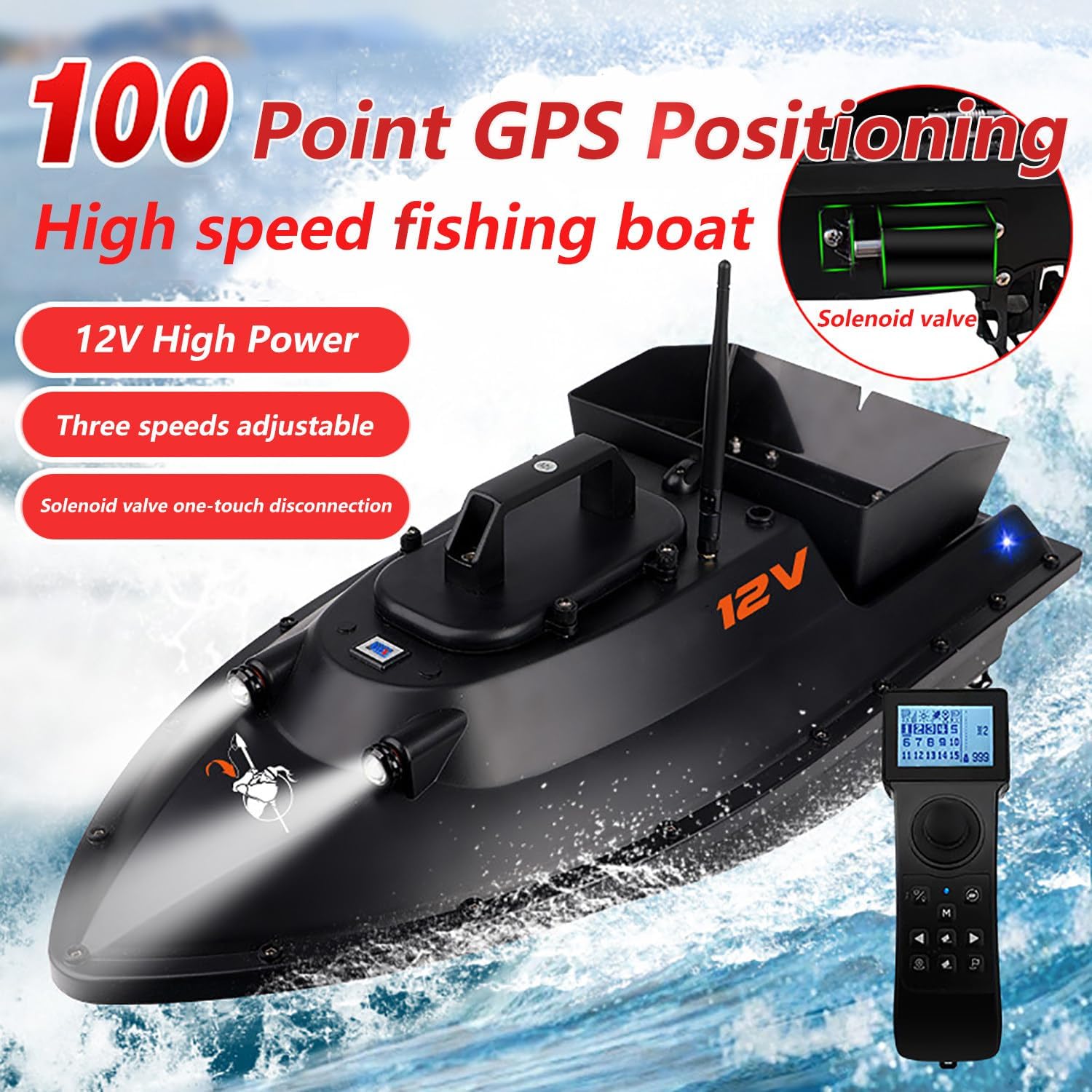 Migliora la tua pesca con una barca da pesca con telecomando GPS ad alta potenza da 12 V con ritorno automatico a casa, luci notturne, ritorno automatico della batteria scarica, 3 velocità regolabili e rilascio dell'esca con un pulsante per un'esperienza di pesca notturna ottimale. Rilascia facilmente l'esca con un grande silo indipendente in grado di contenere fino a 3,5 kg di varie esche, oltre a un silo posteriore con design di attacco a gancio per una distribuzione efficiente della lenza e dell'amo, adatto per pescatori di tutti i livelli. Naviga con precisione utilizzando il posizionamento GPS a 100 punti e controlla la tua barca fino a 600 metri di distanza. Le caratteristiche includono avviso di batteria scarica, ritorno automatico e 3 velocità regolabili per l'esca, l'aggancio e la pesca a strascico fino a 100 metri di rete da pesca. Rimani visibile e attira i pesci durante la pesca notturna con luci di navigazione integrate. Lo schermo LCD impermeabile visualizza informazioni essenziali come distanza, alimentazione della batteria, stato della luce notturna e tasto posizione per un facile funzionamento al buio. Goditi sessioni di pesca prolungate con 2* 28000 mAh batterie rimovibili che offrono 3-7 ore di utilizzo per carica. Progettato per resistere a 5-6 onde di livello, garantendo durata e affidabilità in varie condizioni di pesca.