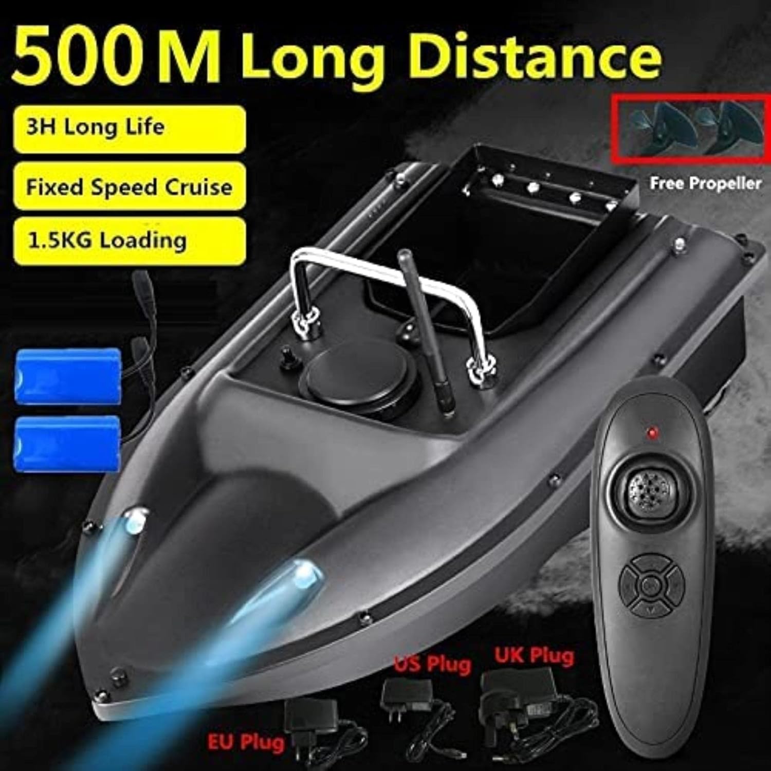 Nave telecomandata intelligente ultra-lunga da 500 metri La nave è dotata di un'importante funzione di crociera a velocità fissa per mantenere la navigazione a una velocità costante. Batteria ricaricabile ad alta capacità, batteria Lipo da 5200 mAh. Durata della batteria di 3 ore. Telecomando wireless ad alta frequenza, frequenza singola uniforme, nessuna preoccupazione per le interferenze del segnale Il motore si spegne automaticamente quando il nido viene aperto per evitare i pesci