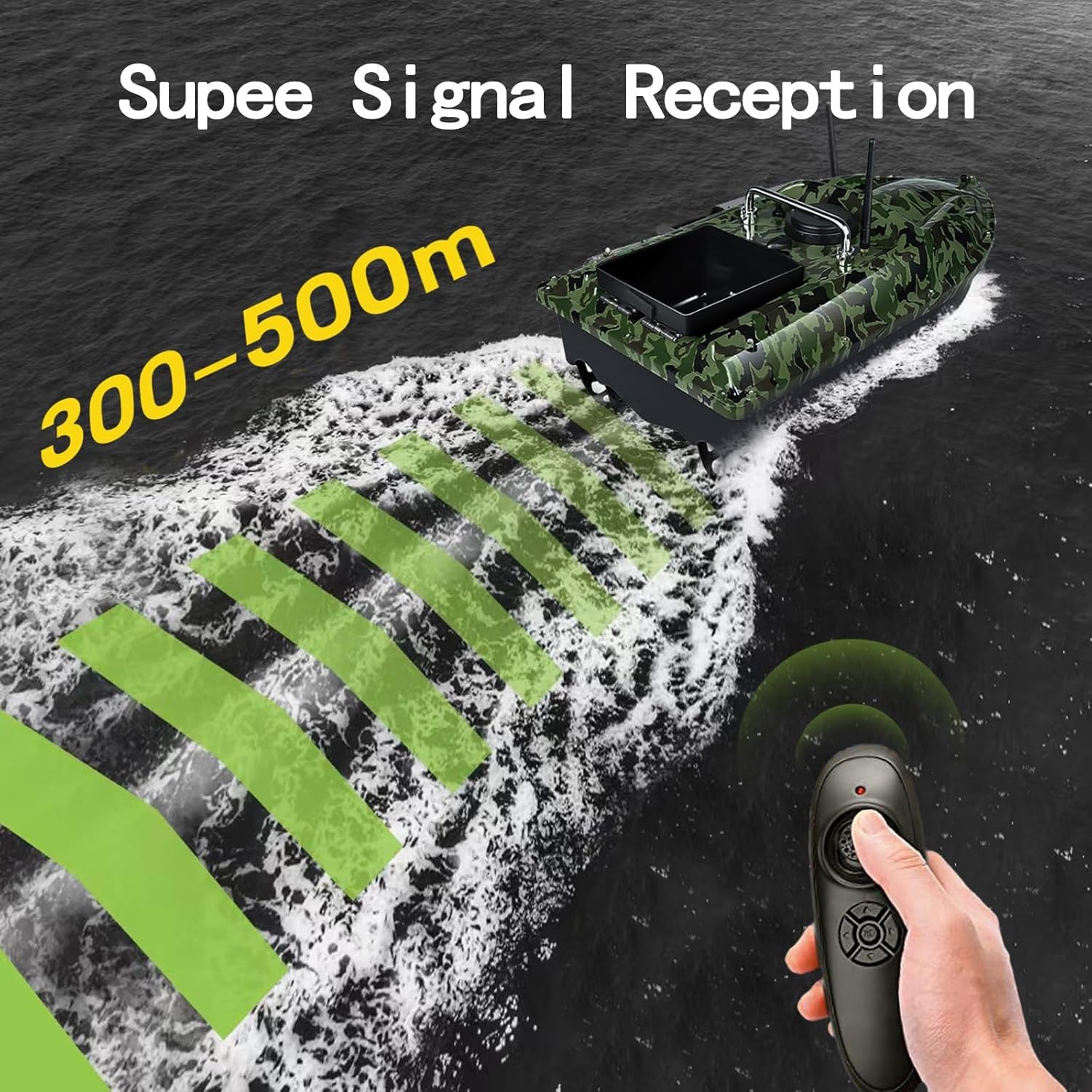 Funzionamento prolungato con batterie ad alta capacità: dotato di tre batterie da 12000 mAh, ciascuna fornisce 4-6 ore di funzionamento continuo, garantendo sessioni di pesca prolungate senza ricariche frequenti. Esca e amo senza sforzo: dotato di ganci per il trasporto per un facile posizionamento di esche e ami, integrato dal funzionamento del telecomando fino a 500 m, incluso il ritorno intelligente con un solo tocco e la crociera automatica per una maggiore comodità. Visibilità migliorata per la pesca notturna: gli indicatori LED sulla barca illuminano la direzione di navigazione durante le operazioni notturne, rendendo più facile lanciare l'esca con precisione in condizioni di scarsa illuminazione. Ricezione affidabile del segnale a distanza: la barca telecomandata ha una portata di 300-500 m, con prestazioni dipendenti da ostacoli ambientali e interferenze del segnale, garantendo un'ampia copertura operativa. Design durevole e impermeabile: incorpora un design impermeabile a doppio motore con una copertura impermeabile, che fornisce protezione contro l'ingresso di acqua e migliora la longevità dell'imbarcazione in ambienti acquatici.